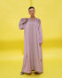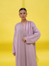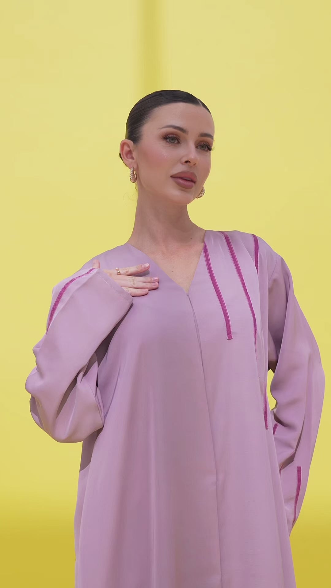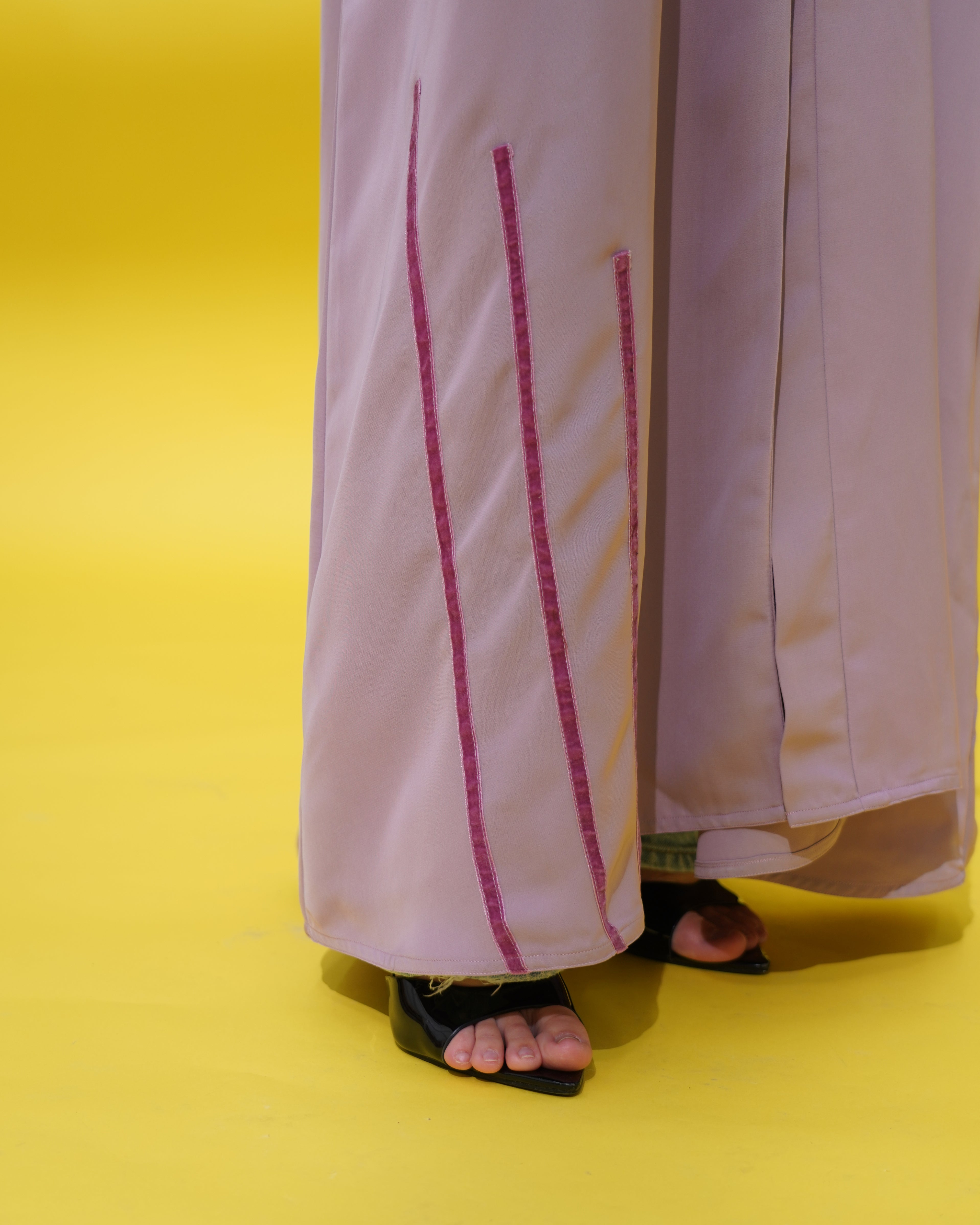 عباية من قماش ندى مزينة بديزاين مخمل بشكل مدرّجات في بداية العباية ونهايتها، مع نفس اللمسة المخملية في نهاية الأكمام.
