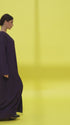 عباية من قماش ندى مزينة بديزاين مخمل بشكل مدرّجات في بداية العباية ونهايتها، مع نفس اللمسة المخملية في نهاية الأكمام.