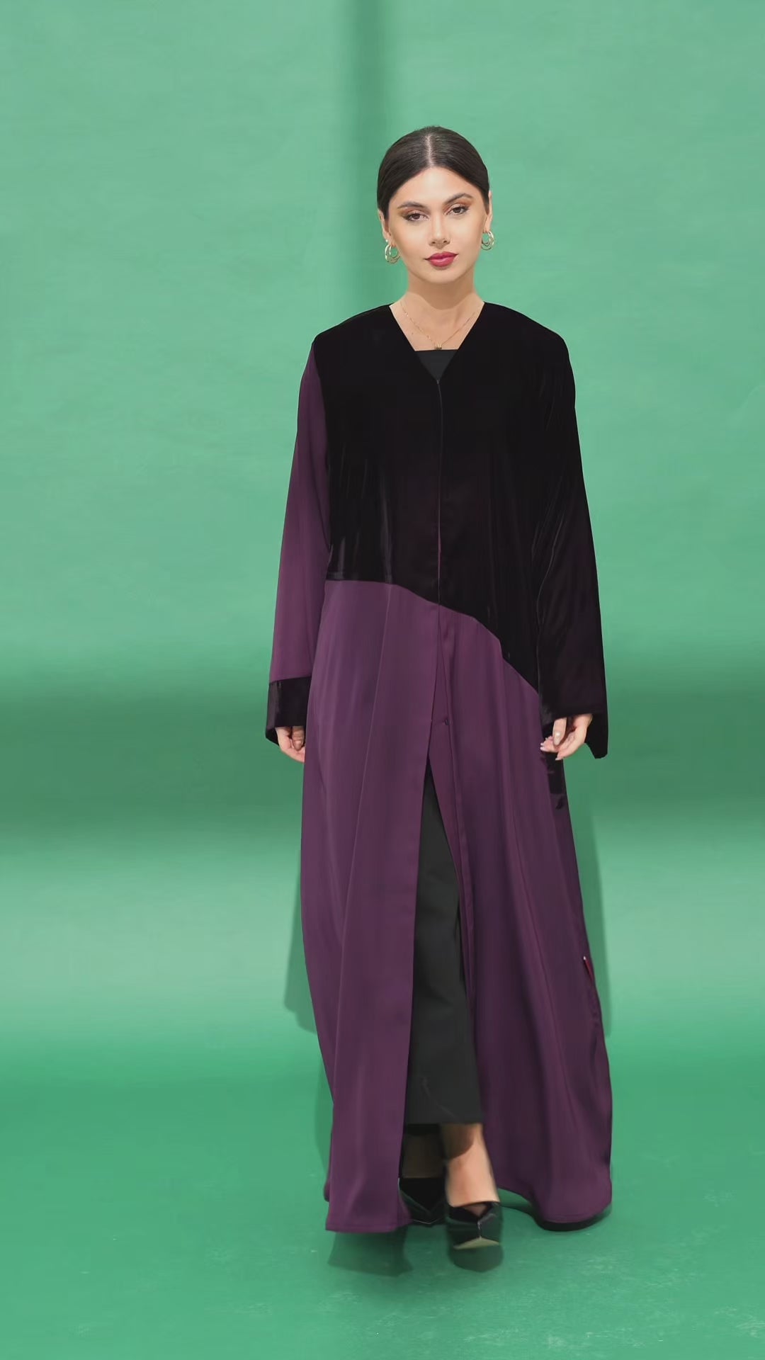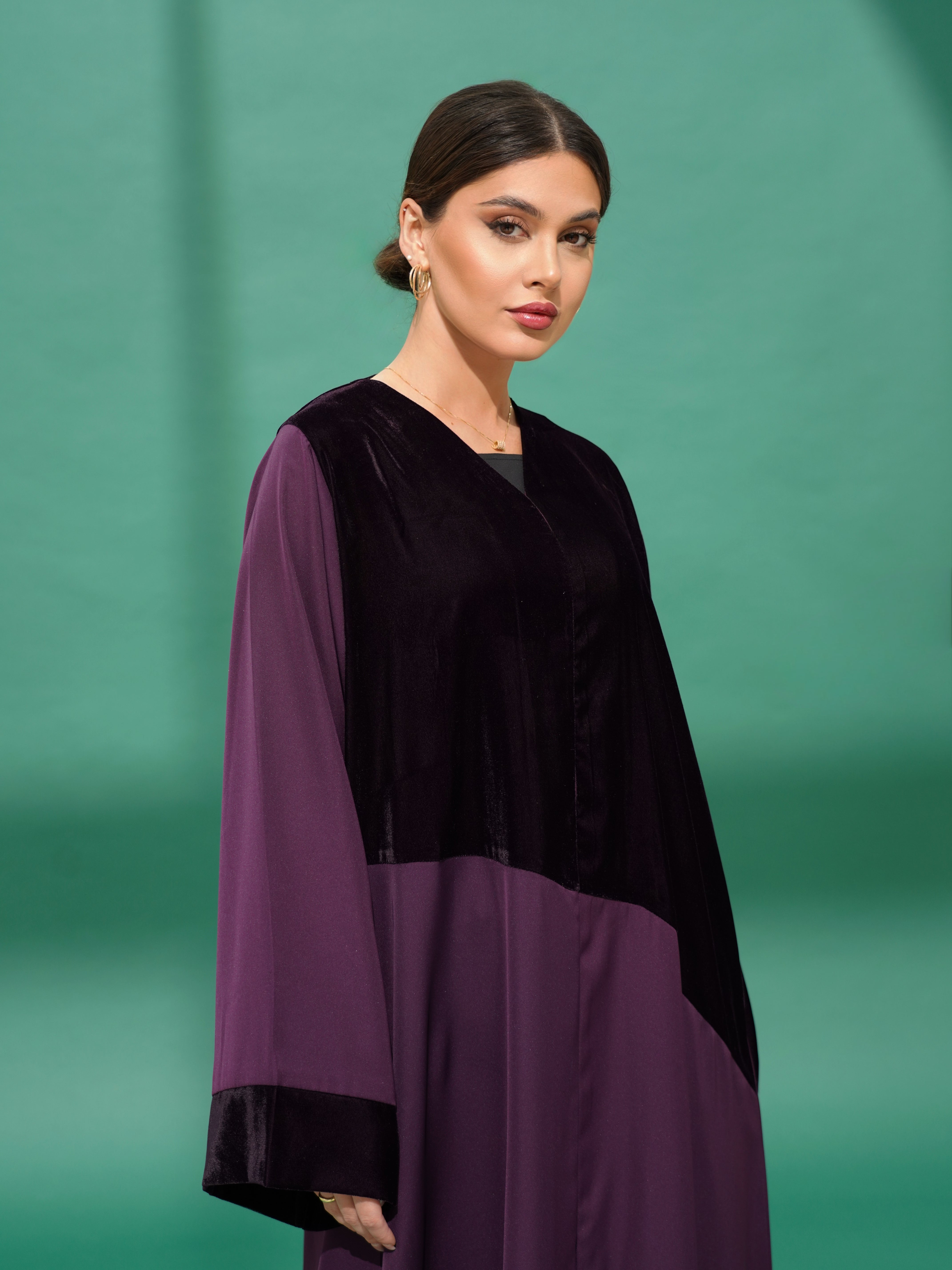 The upper part is full velvet, while the lower part is made of Nada fabric. The left sleeve is entirely velvet, and the right sleeve is Neda with a velvet touch at the end. A soft and unique design that combines the luxury of velvet with the lightness of Nada.