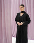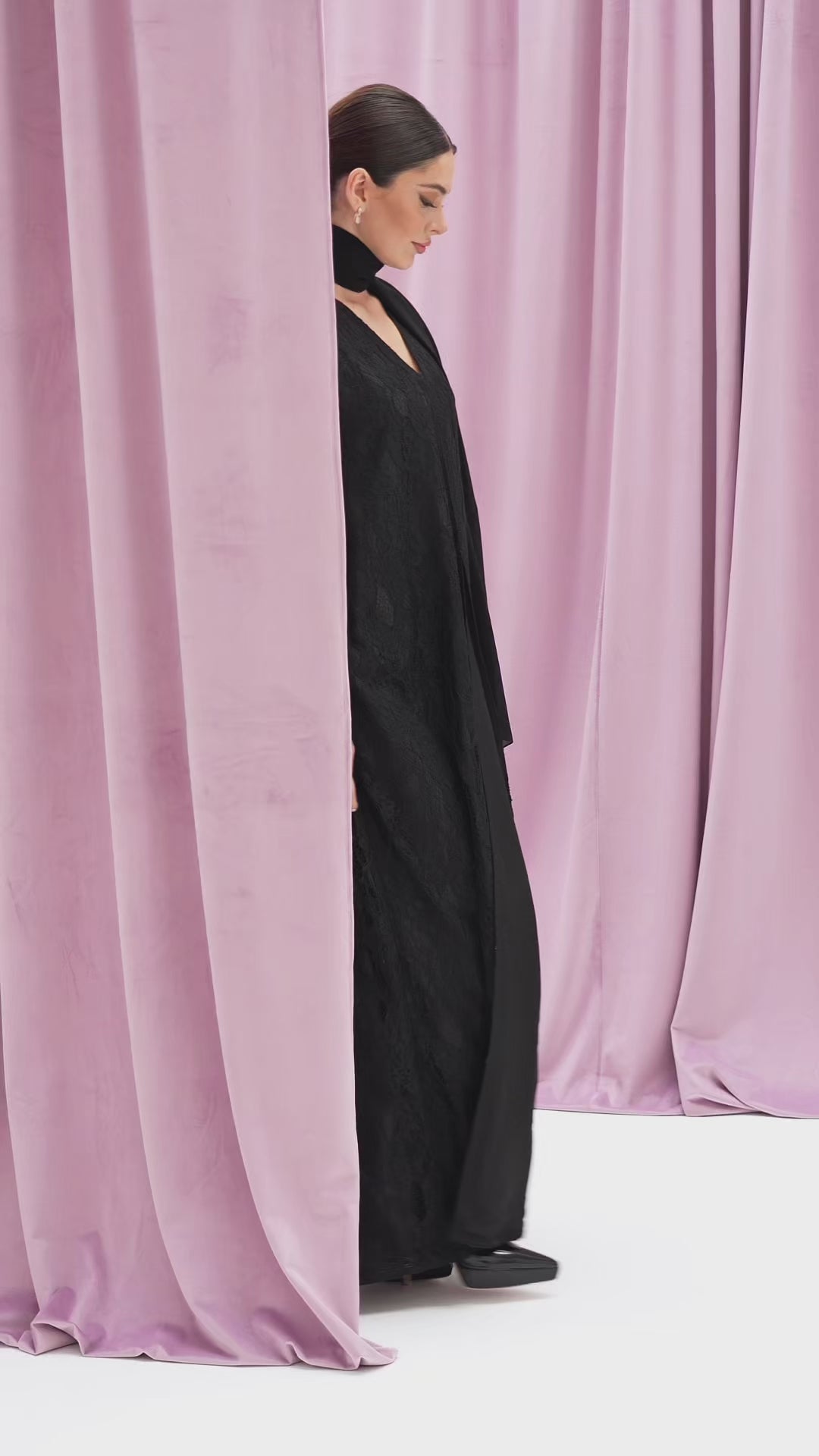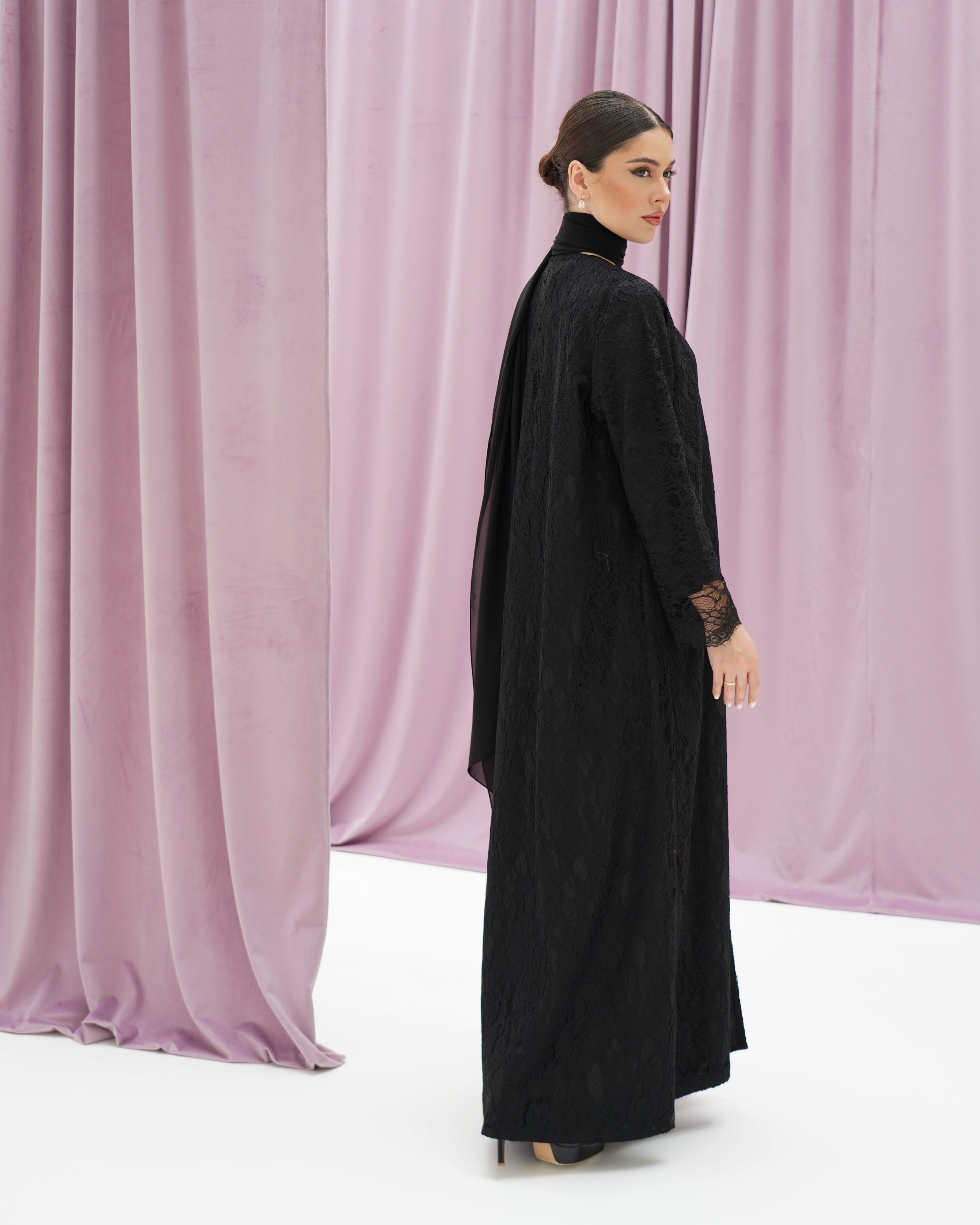 عباية بقصة واسعة وأكمام طويلة، بخامة دانتيل راقية مبطنة، تأتي مع شيلة سادة