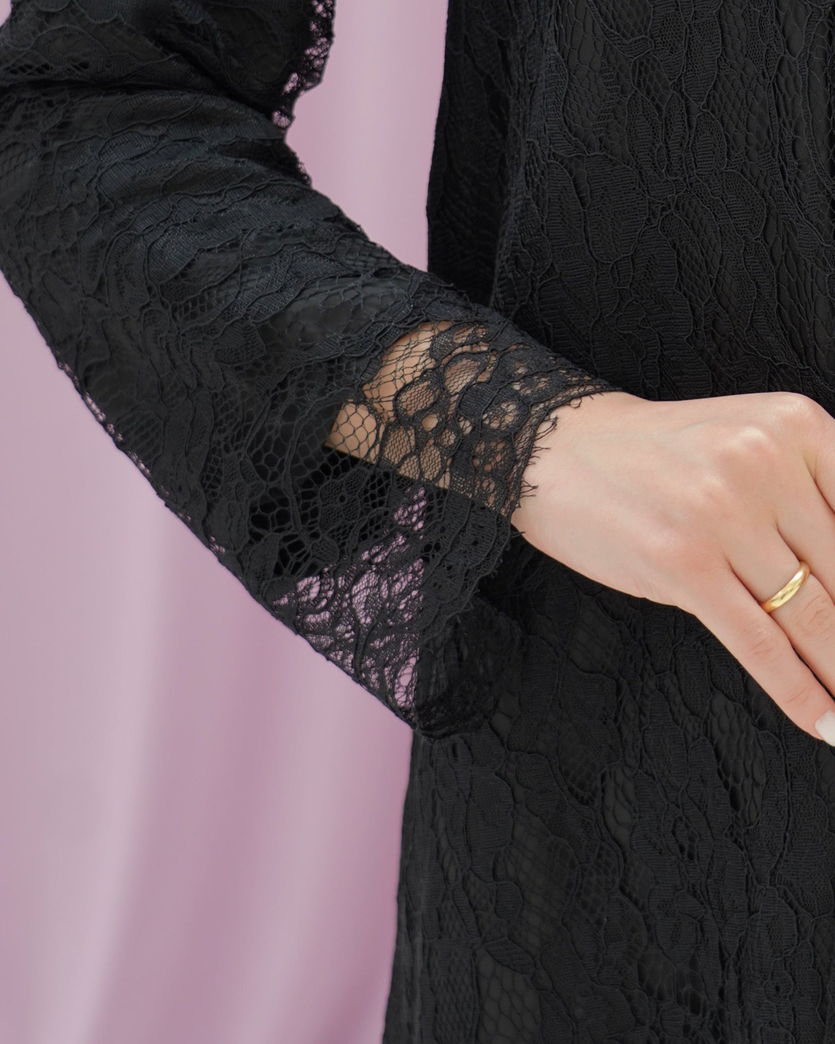 An abaya with a loose fit and long sleeves, crafted from elegant lace and lined paired with a plain matching shayla.