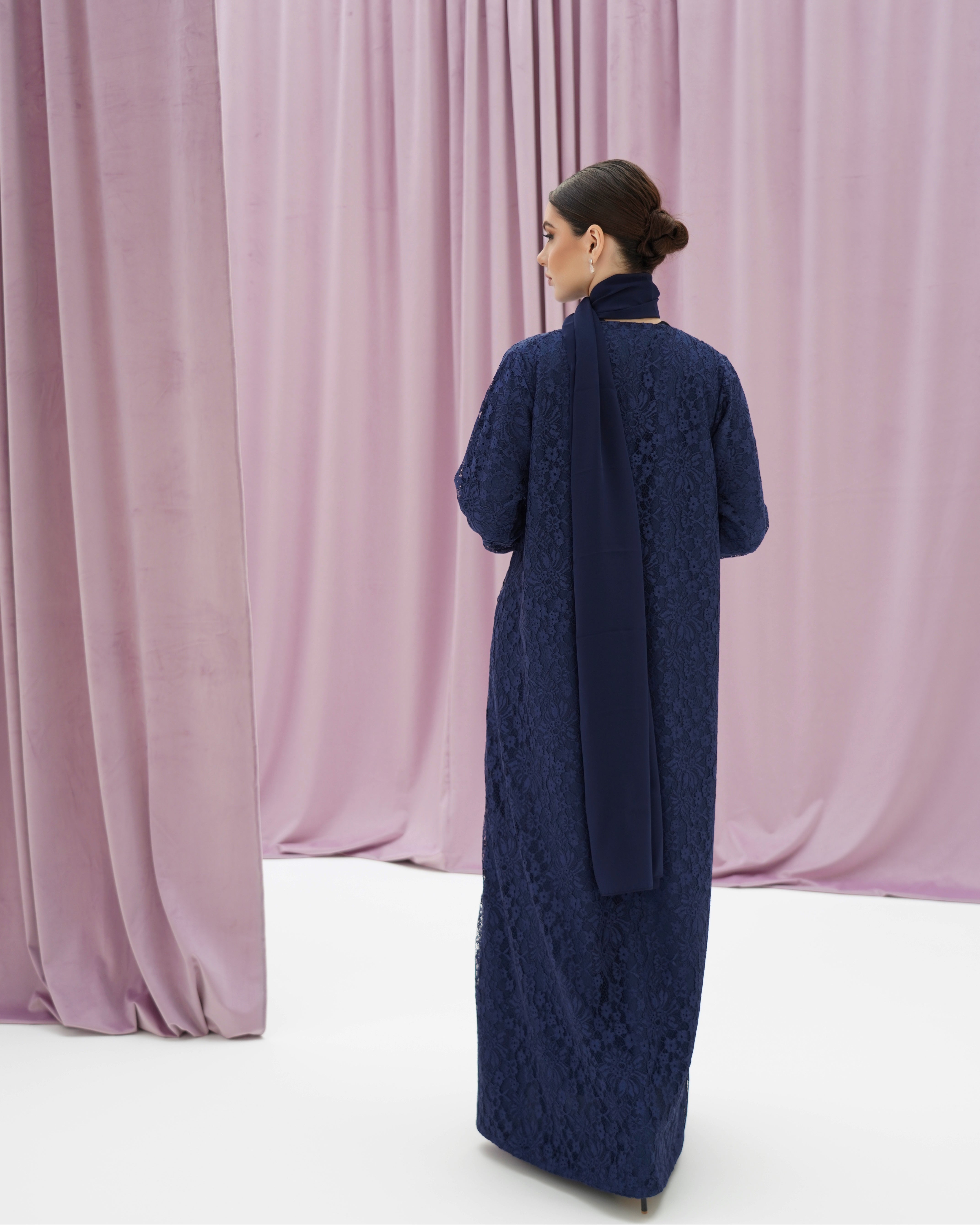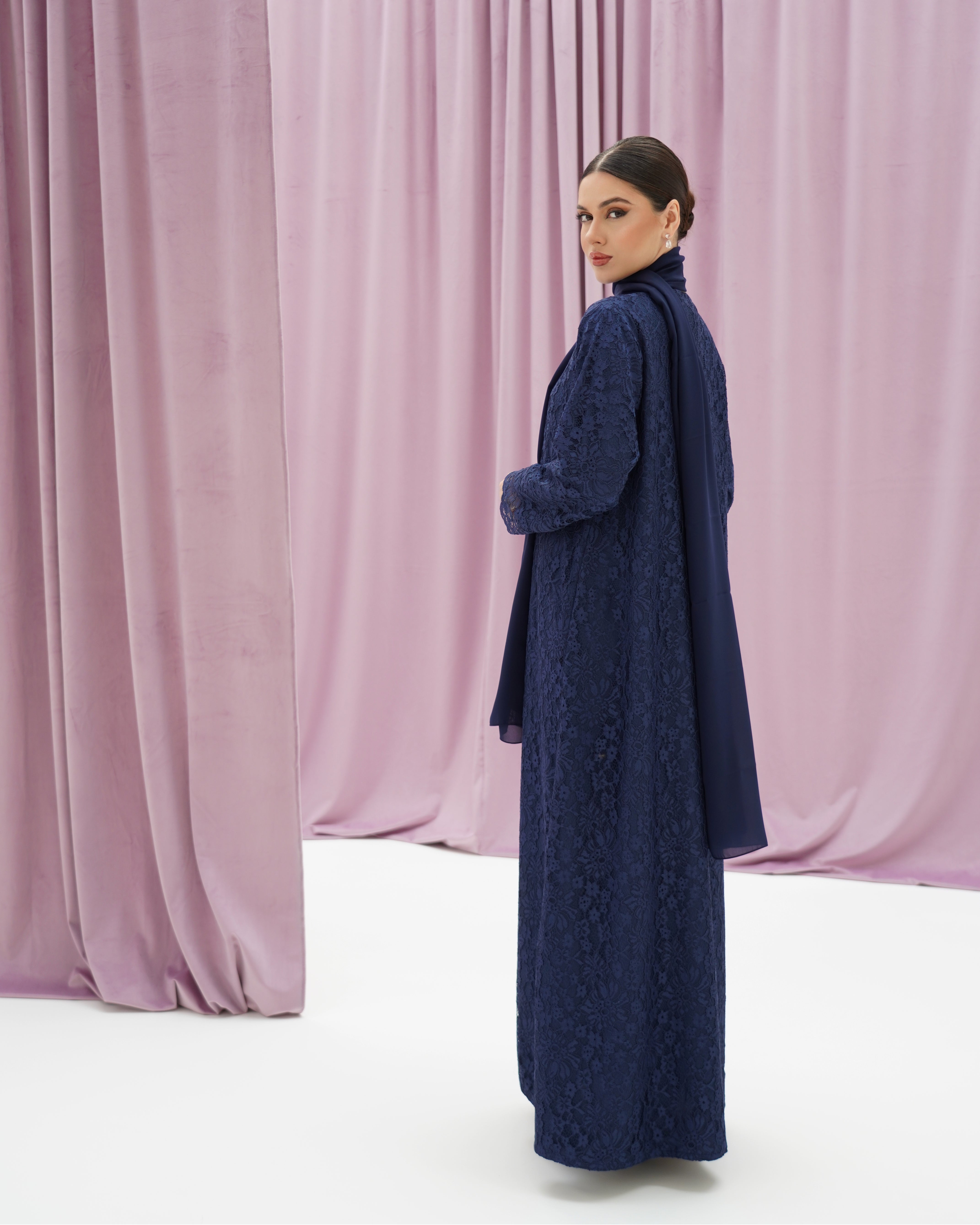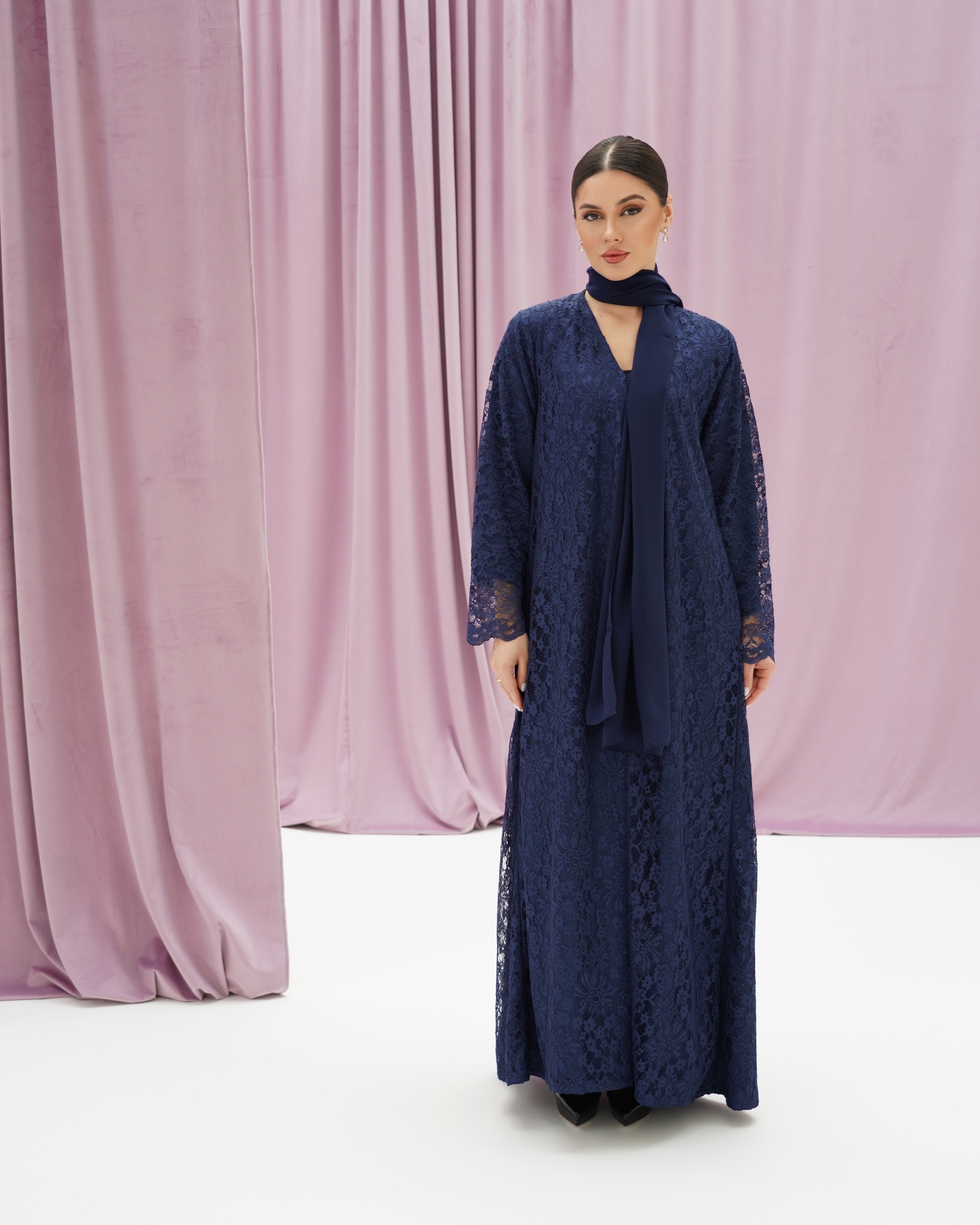 عباية بقصة واسعة وأكمام طويلة، بخامة دانتيل راقية مبطنة، تأتي مع شيلة سادة