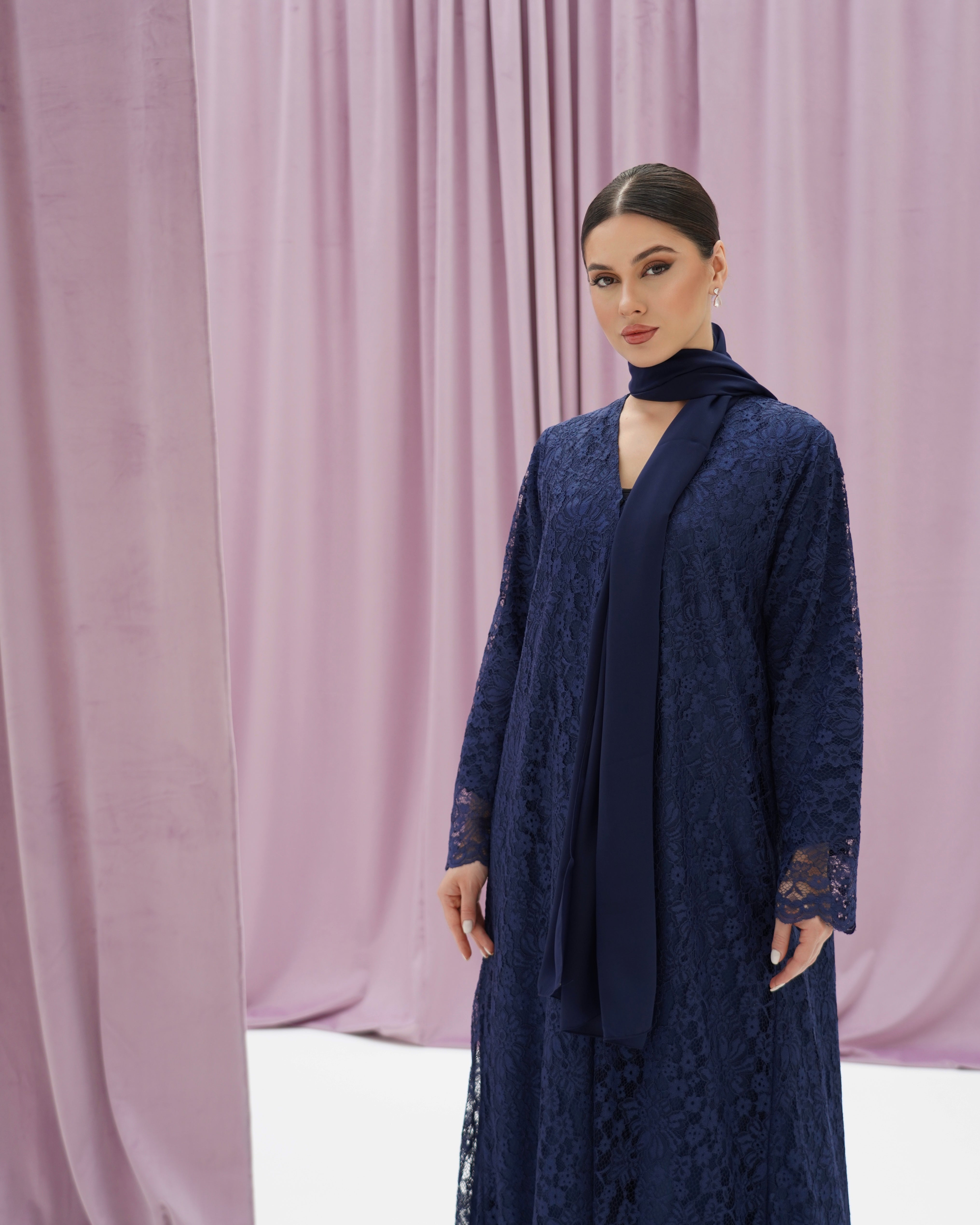 An abaya with a loose fit and long sleeves, crafted from elegant lace and lined , paired with a plain matching shayla.