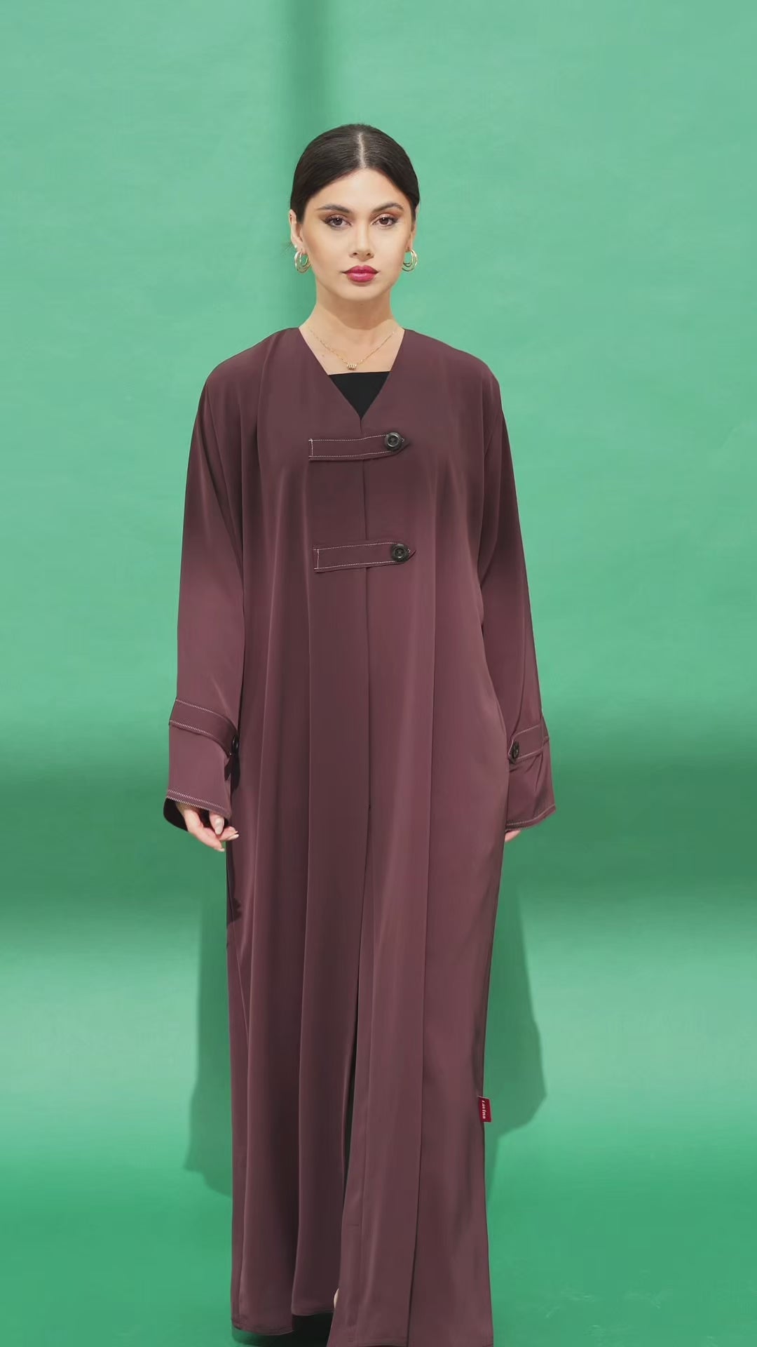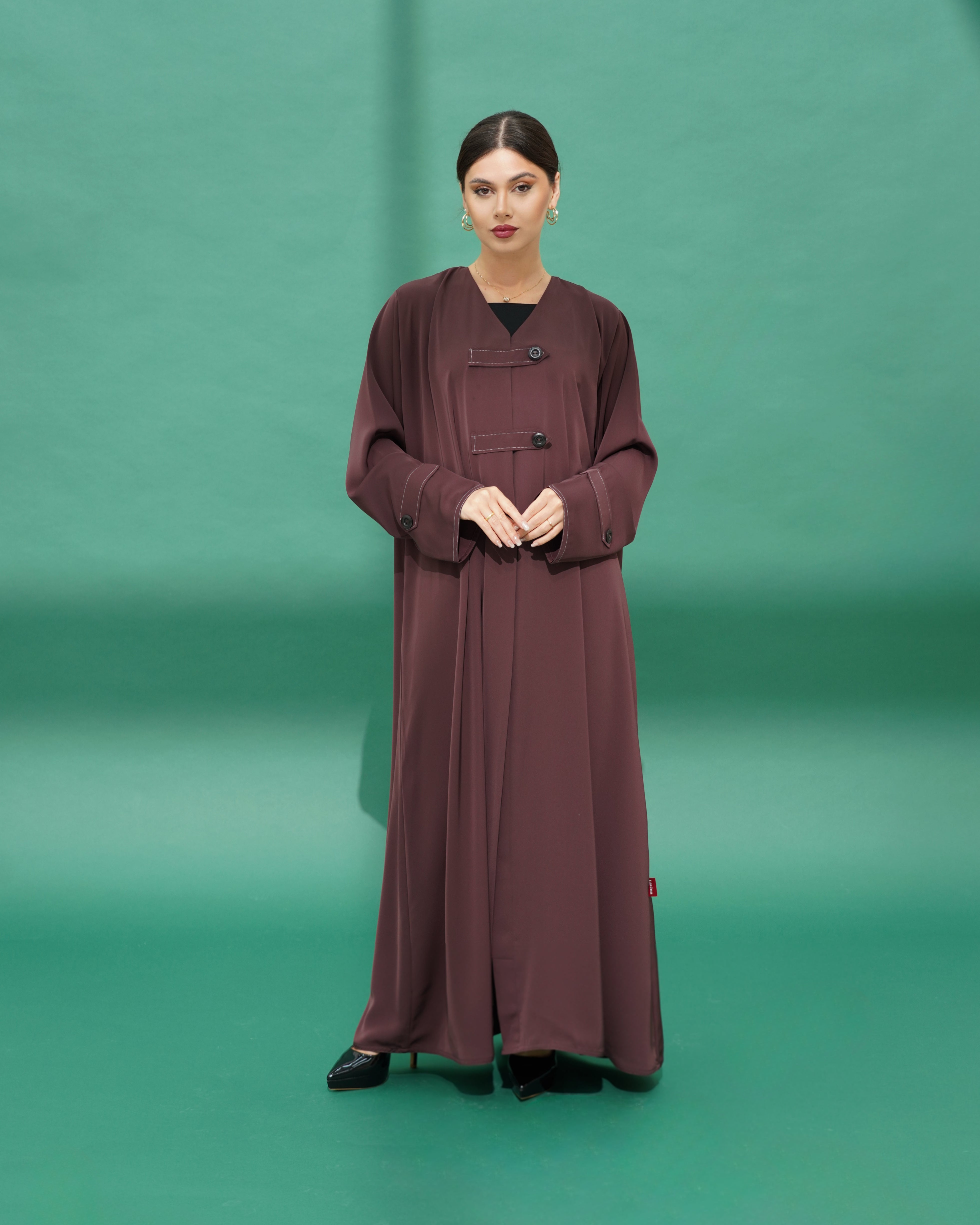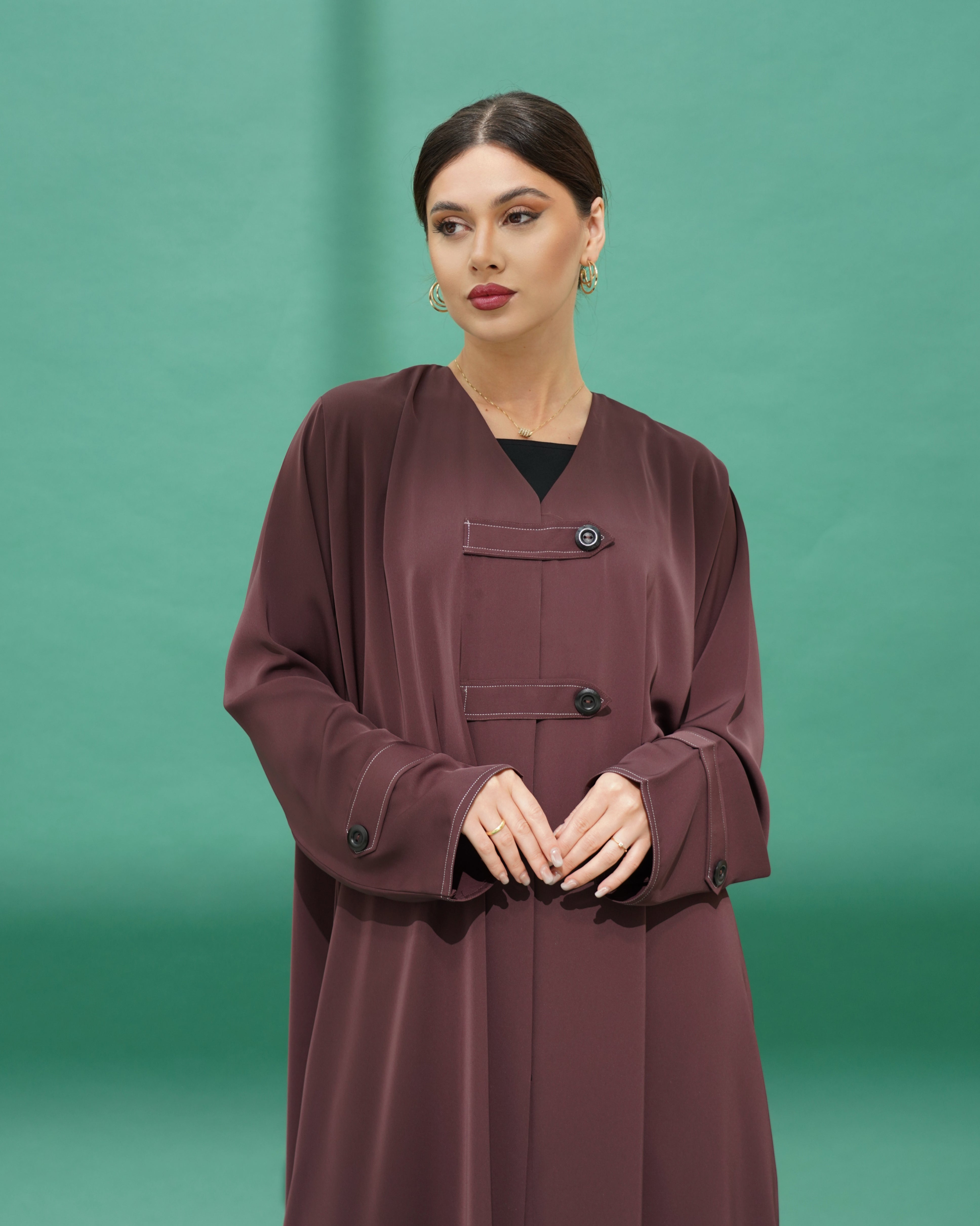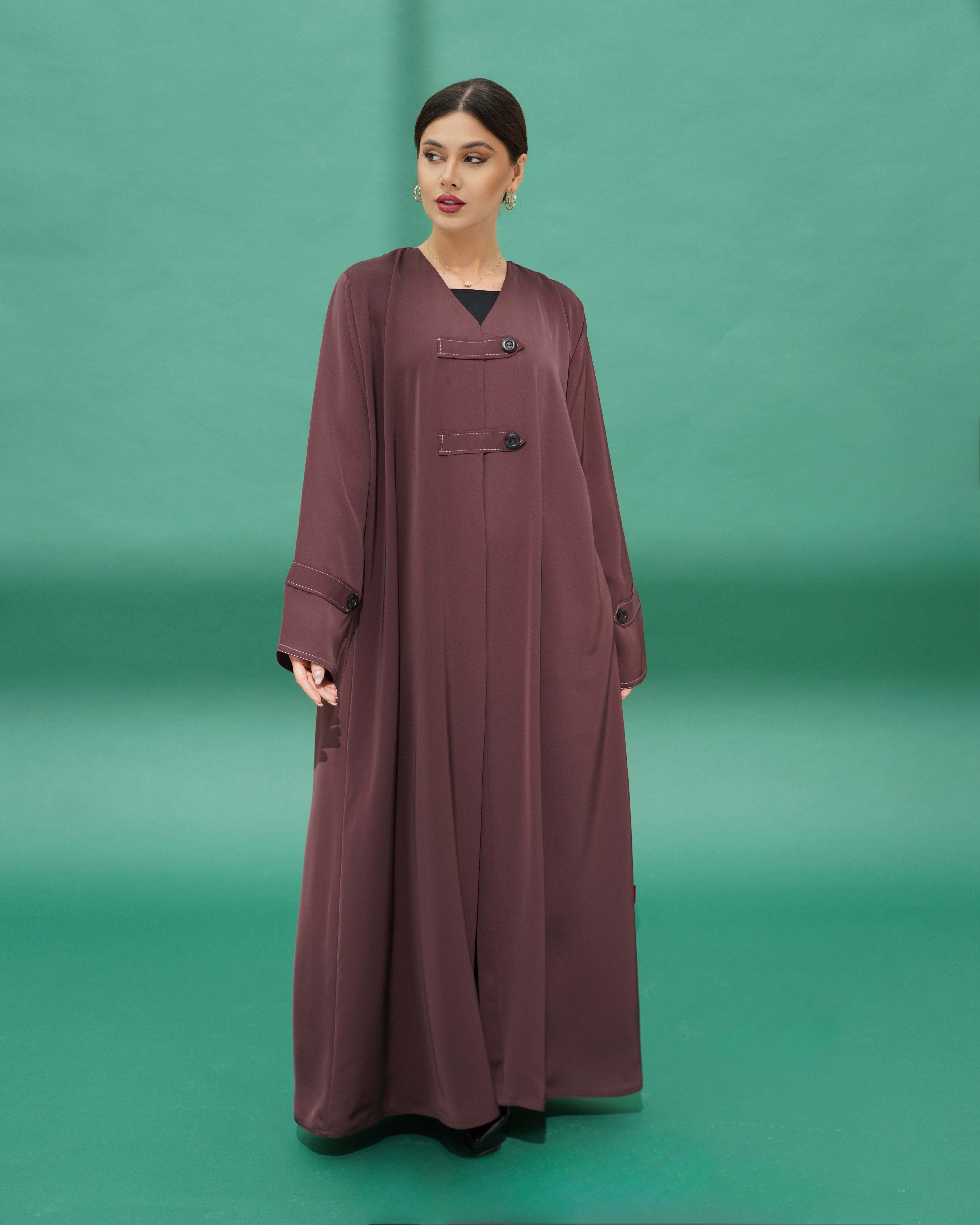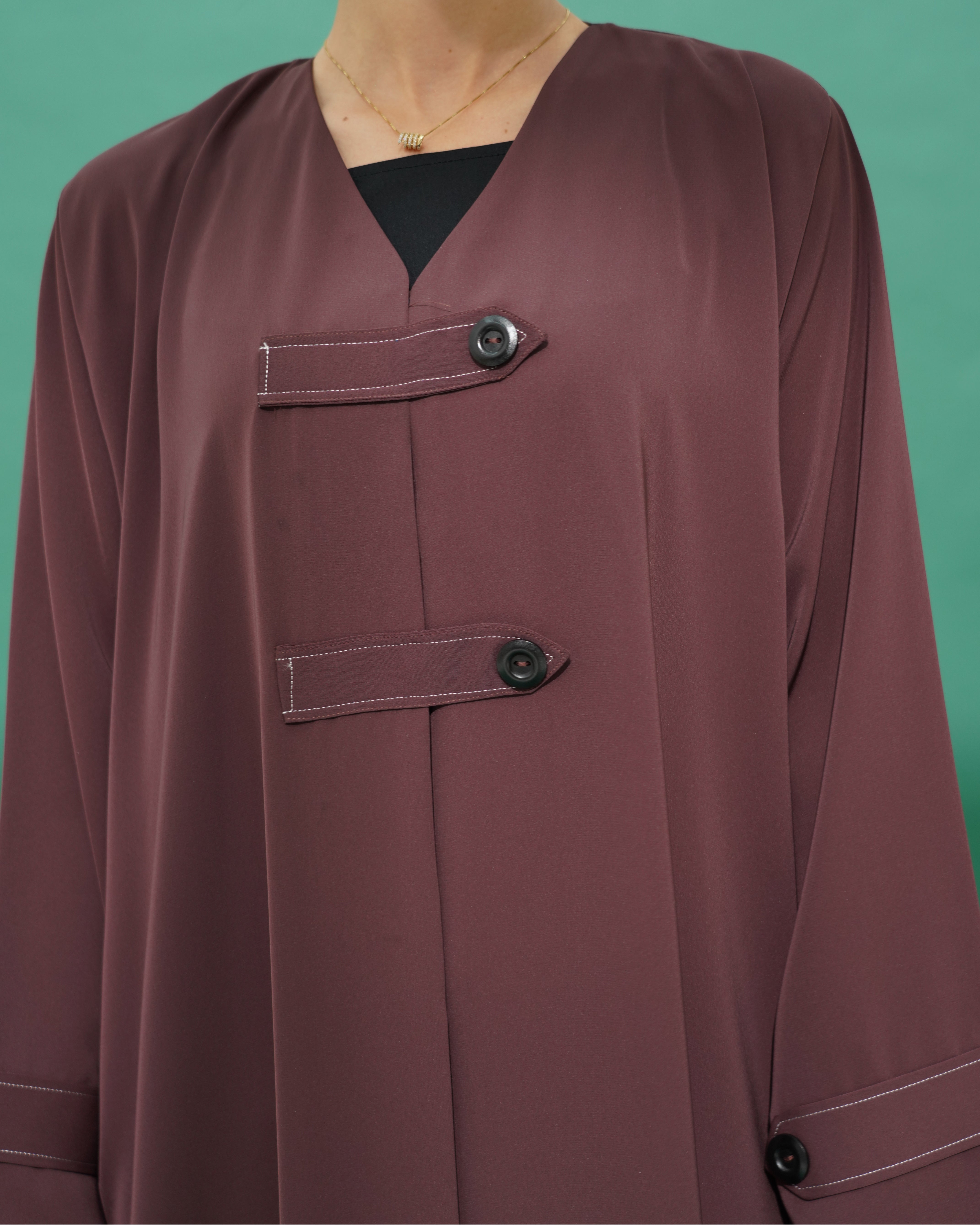 Abaya made of Nada fabric, decorated with fabric tabs and buttons in the front, with the same details repeated on the sleeves