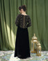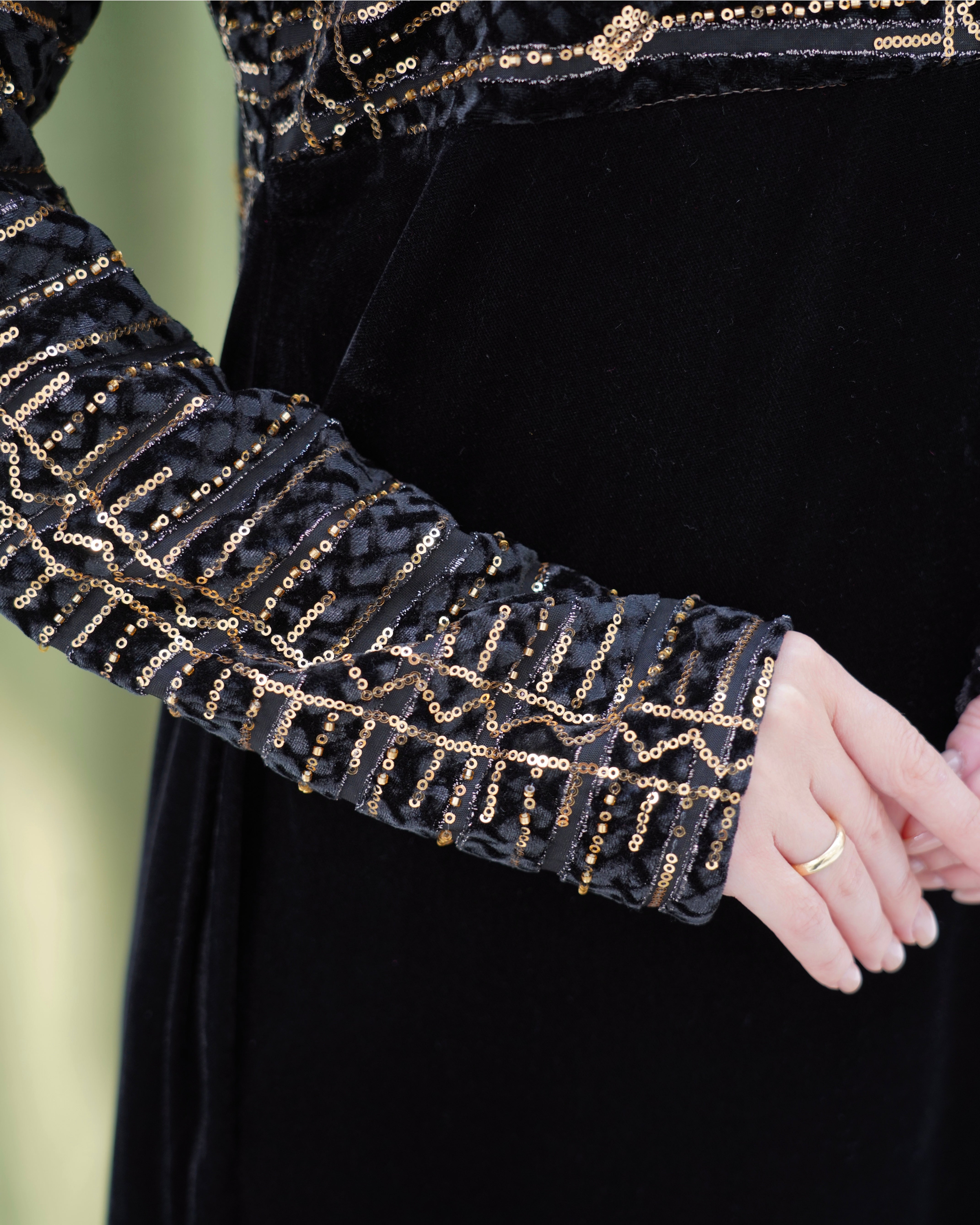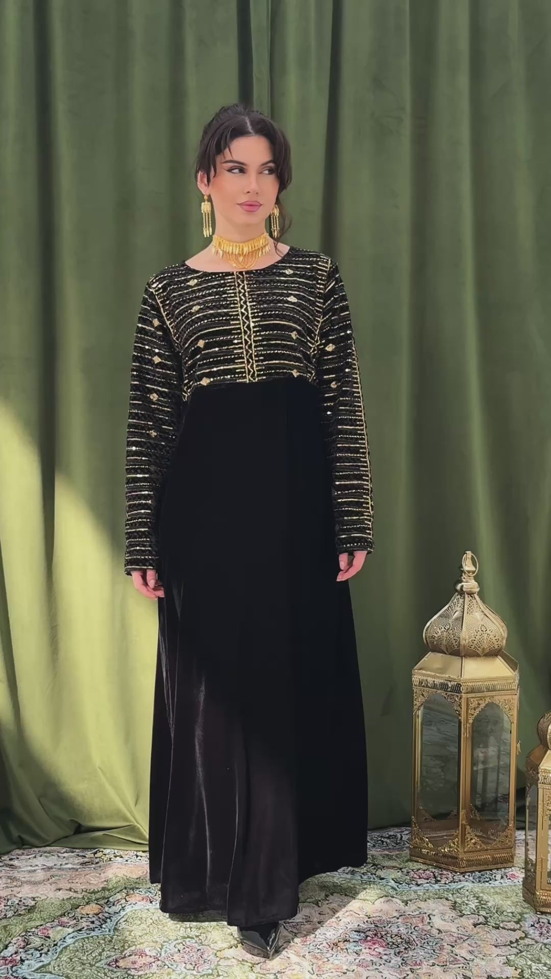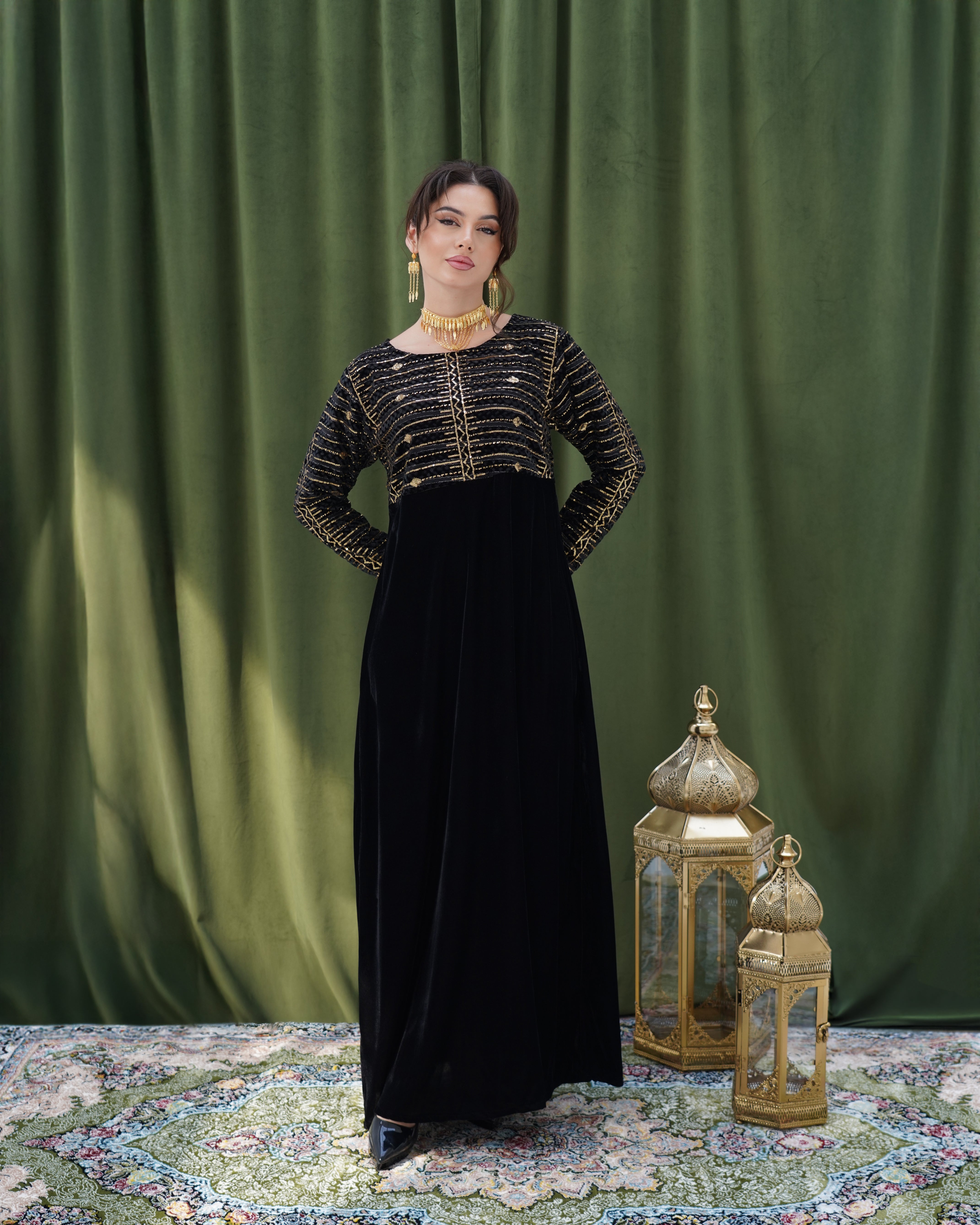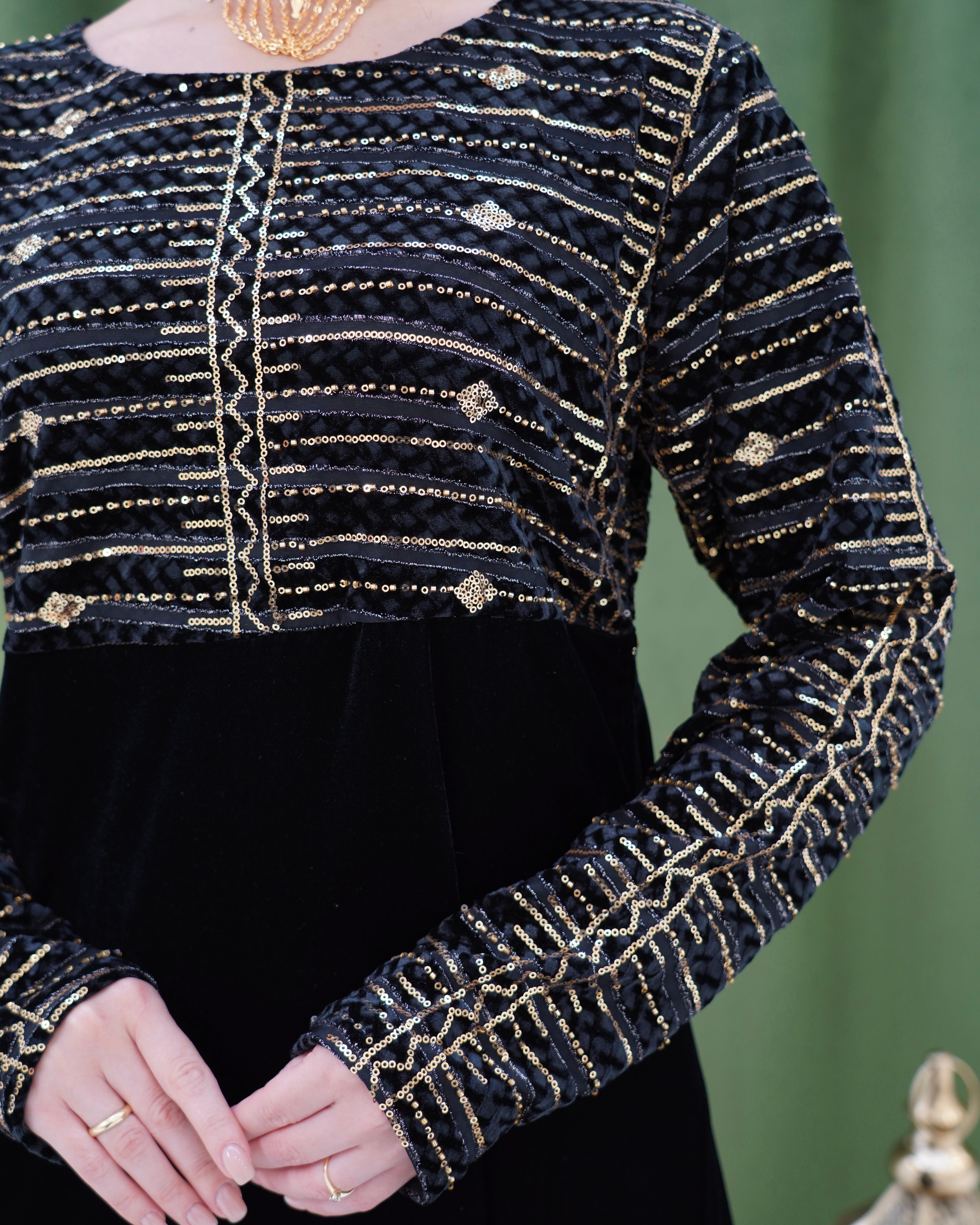 فستان راقي بتصميم أنيق، يتميز الجزء السفلي بقماش مخمل ينسدل بانسيابية أما الجزء العلوي فهو مصنوع من قماش مطرّز بخيوط ذهبية بتصميم هندسي أنيق، مع أكمام طويلة مطابقة تضيف لمسة متناسقة