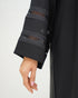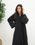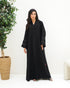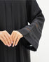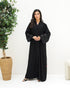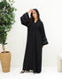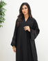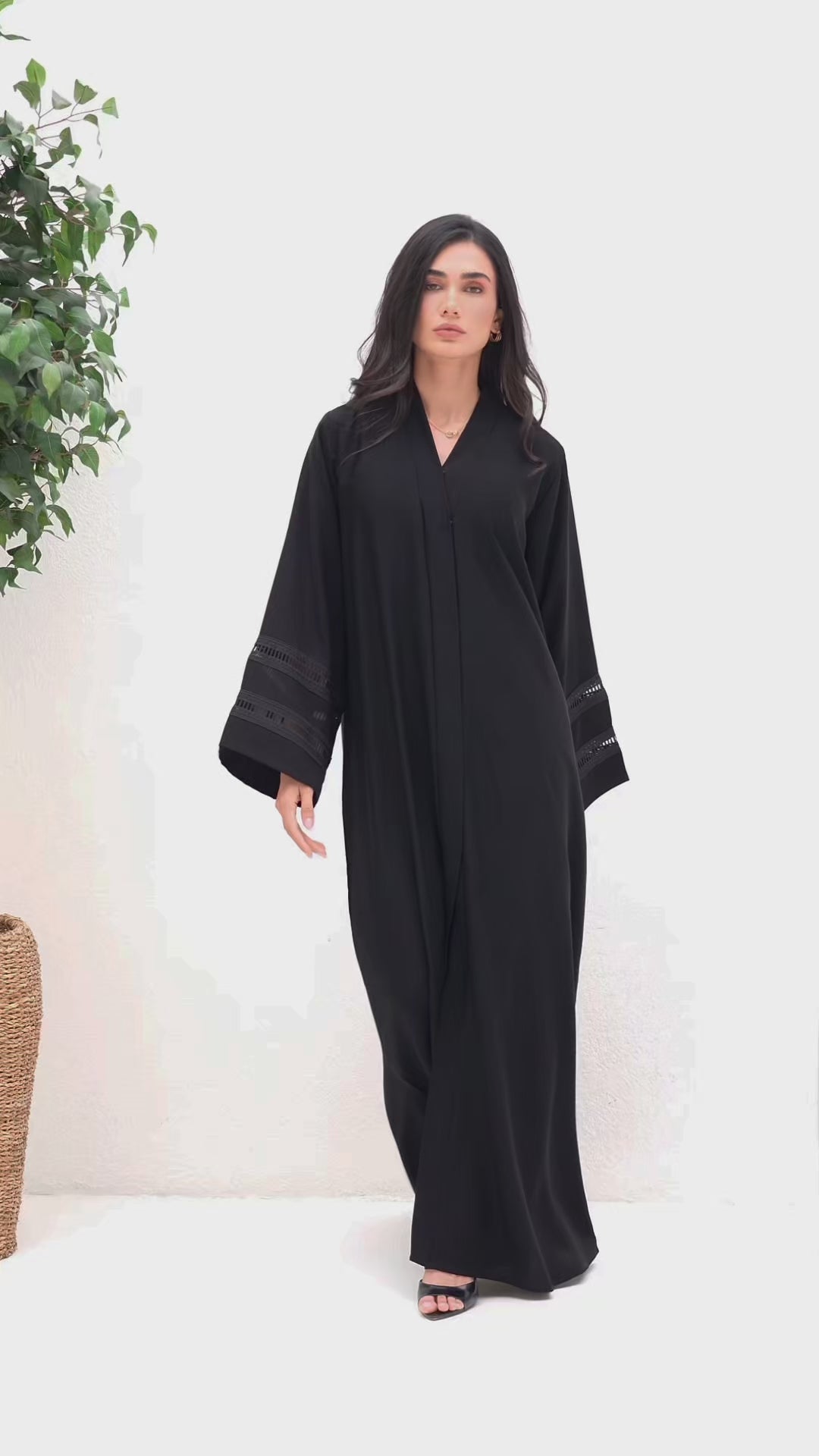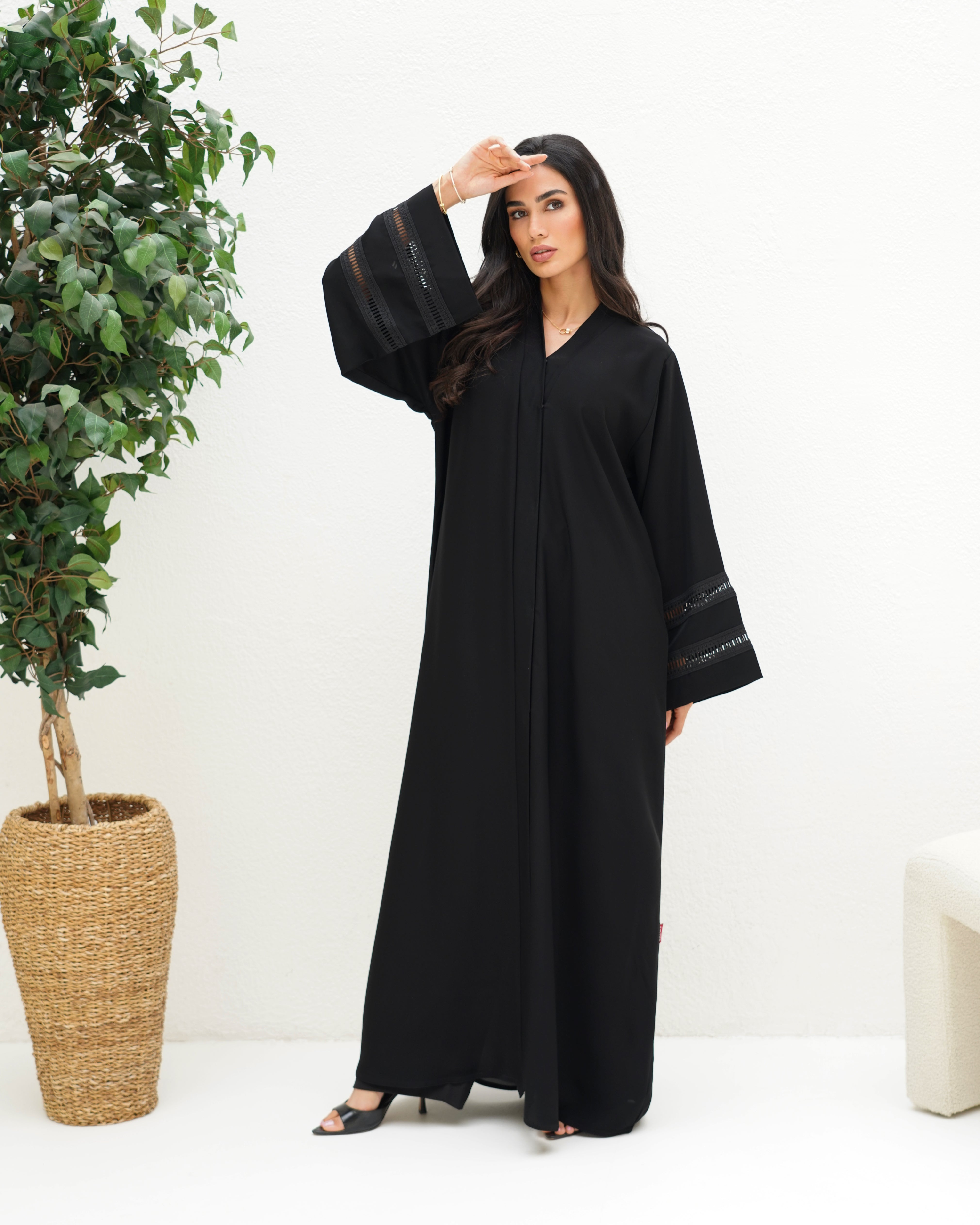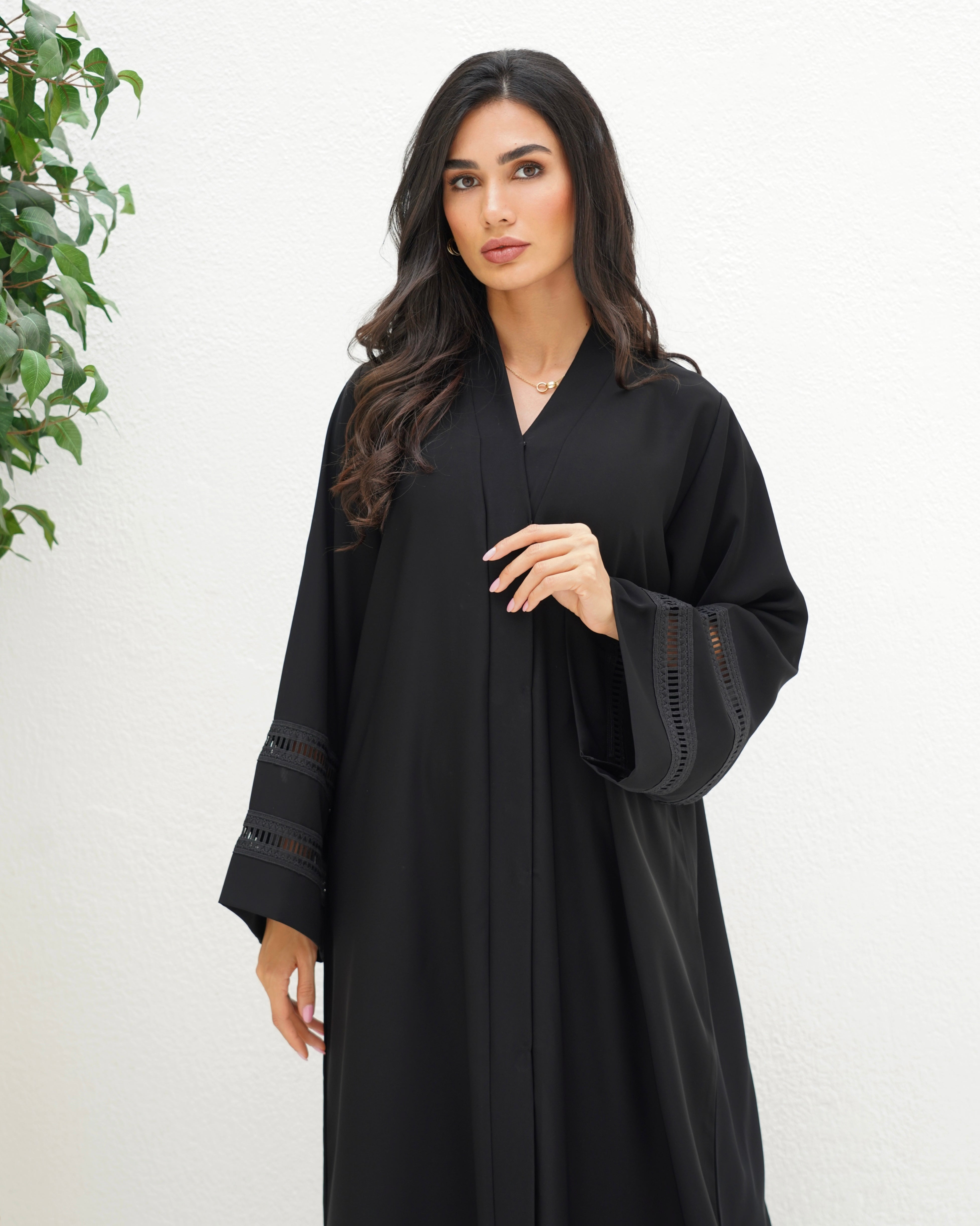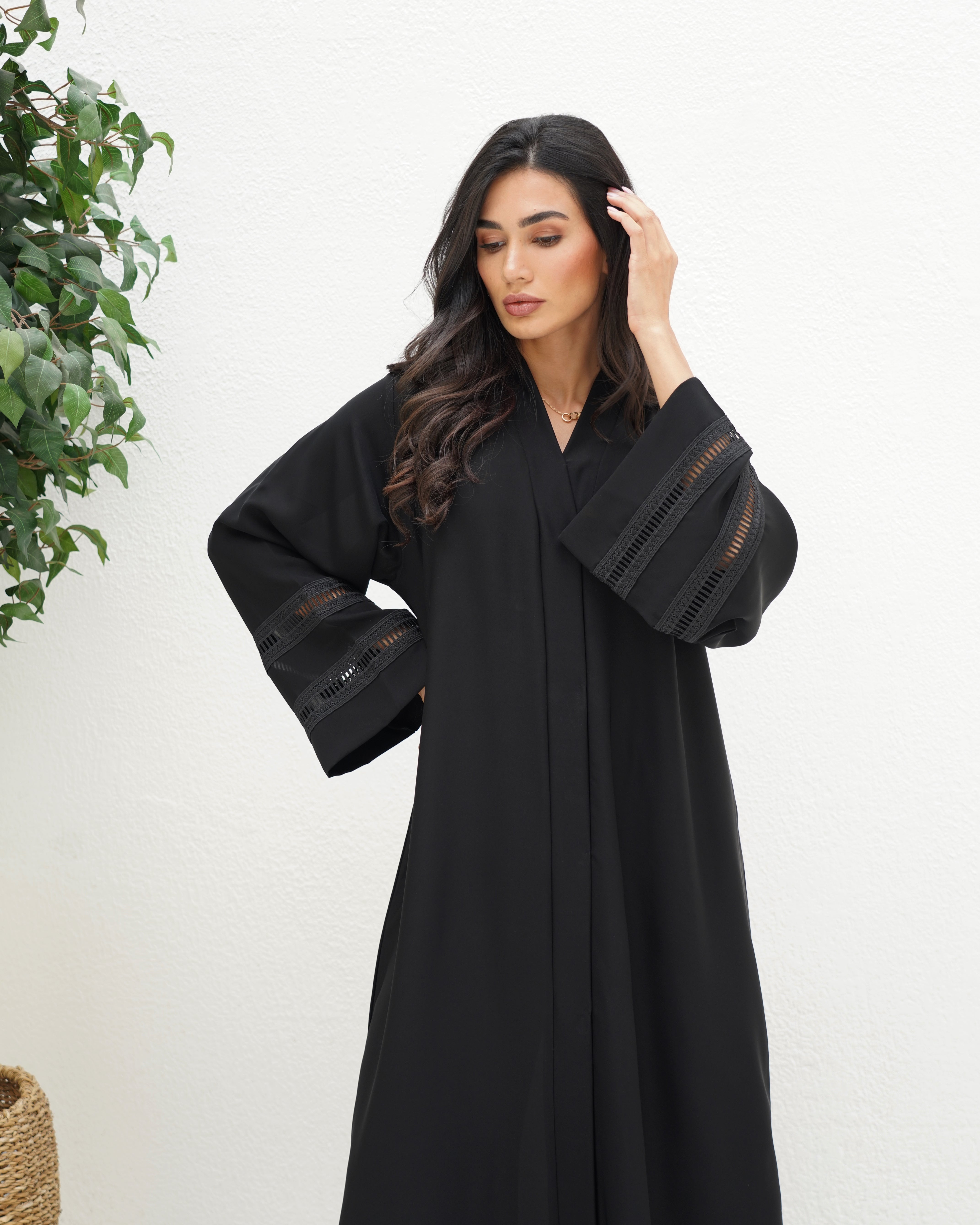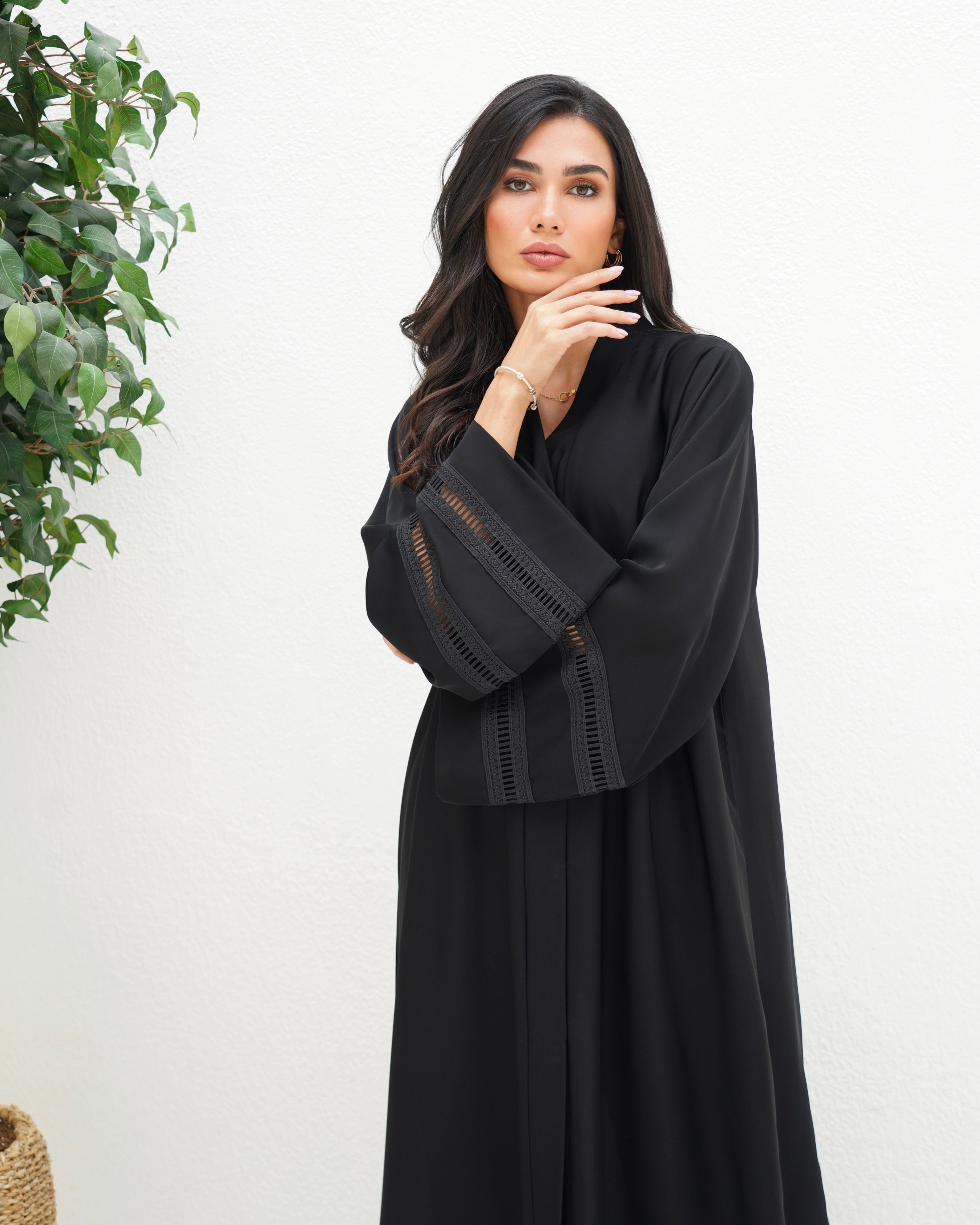 A black abaya with a classic elegant design, featuring wide sleeves adorned with delicate lace lines and a flowy fabric that offers comfort and elegance in every look