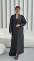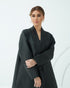 An elegant black abaya made of satin fabric with subtle patterns that add a luxurious touch. It features a wide collar with a classic and refined design, made from the same fabric but with a slightly different sheen that highlights the details. The design is simple and flowing, giving the abaya a sophisticated and elegant loo