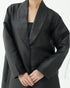 عباية أنيقة باللون الأسود، مصنوعة من قماش ساتان بنقوش خفيفة تضيف لمسة فخمة. تتميز بياقة عريضة بتصميم كلاسيكي وراقي، من نفس القماش ولكن بلمعة مختلفة قليلاً تُبرز التفاصيل. التصميم بسيط وانسيابي، ما يمنح العباءة مظهراً فاخراً وأنيقاً.