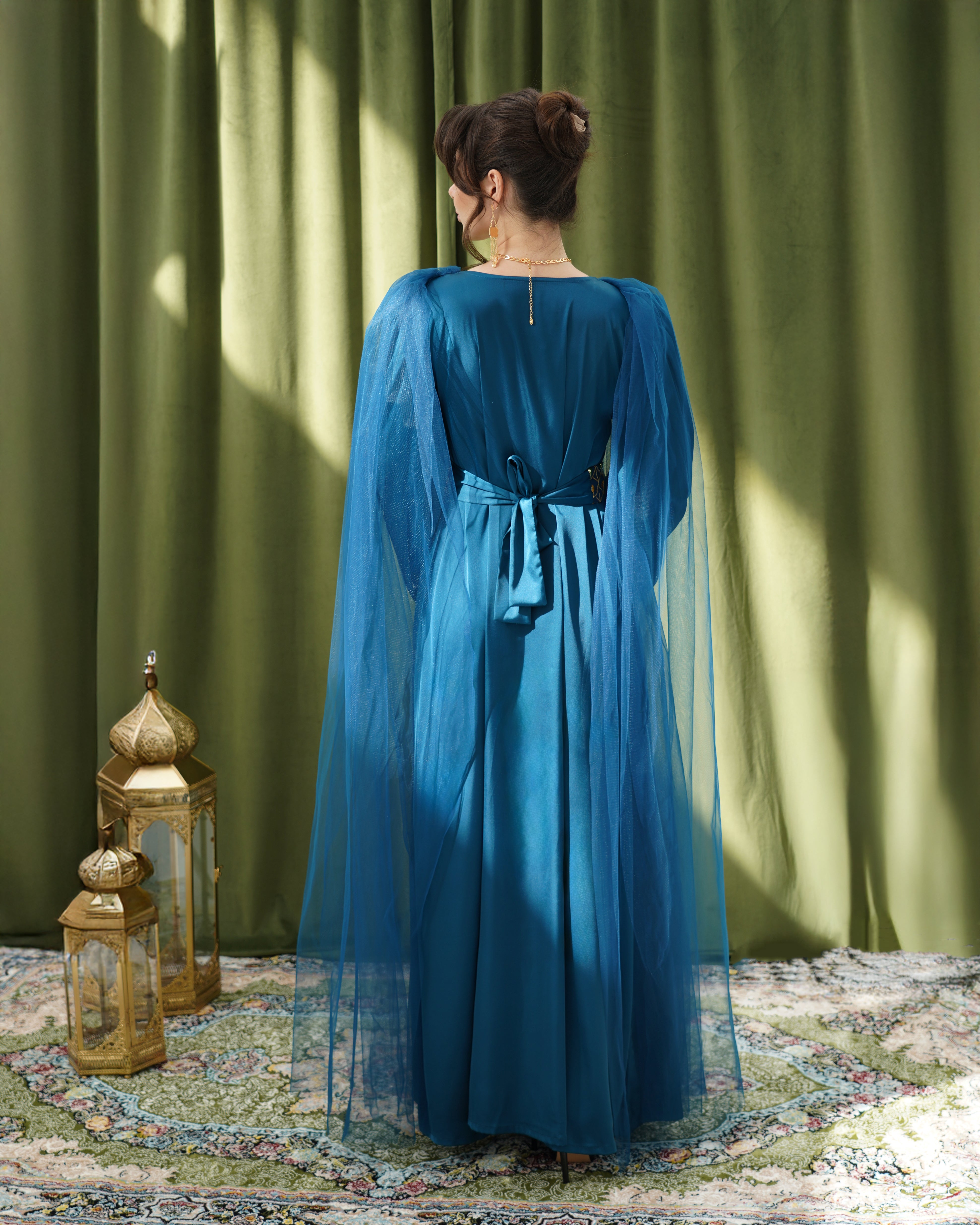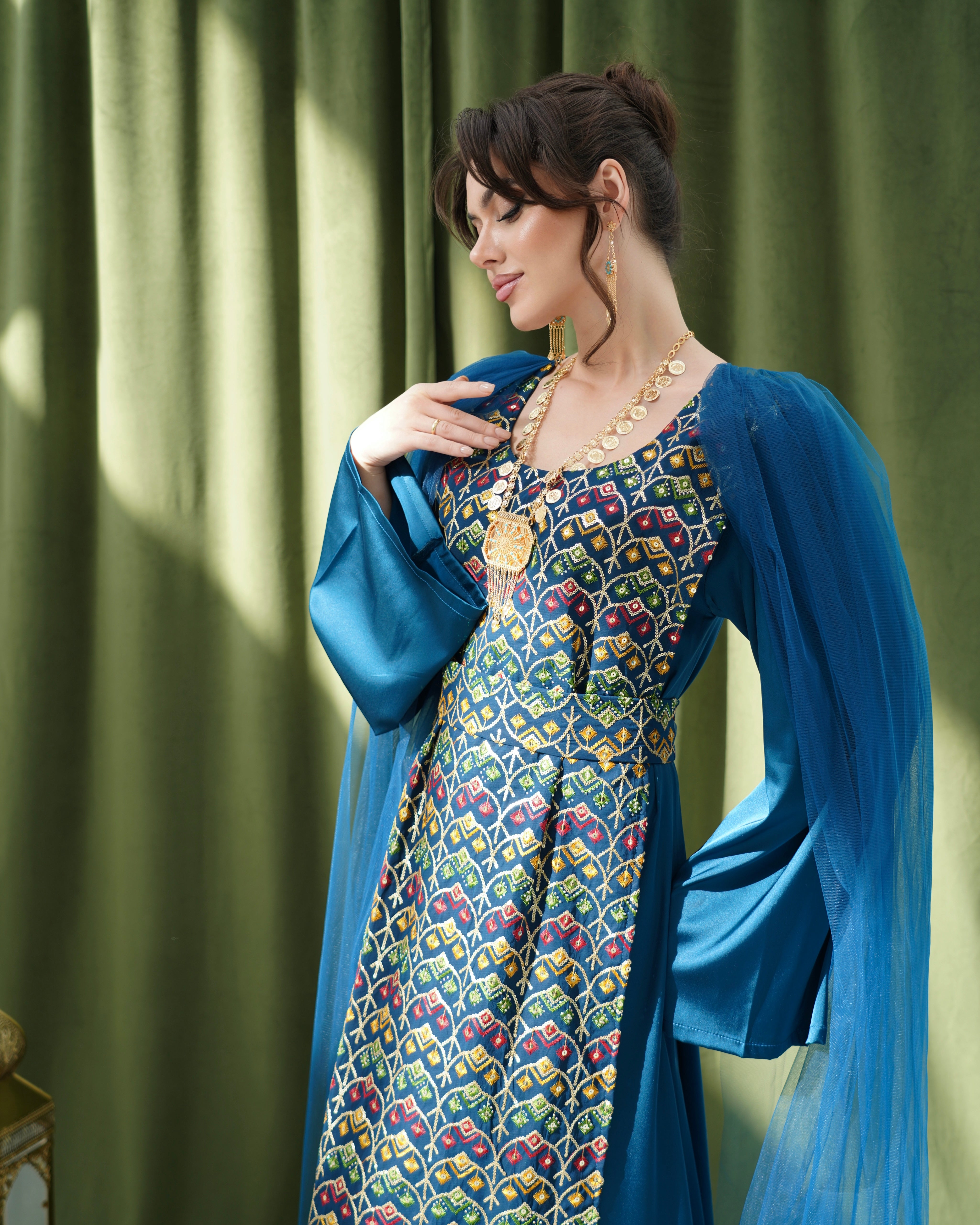 A long dress made of silk, decorated with traditional geometric patterns, with tulle at the shoulders that drapes softly.