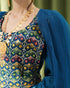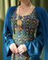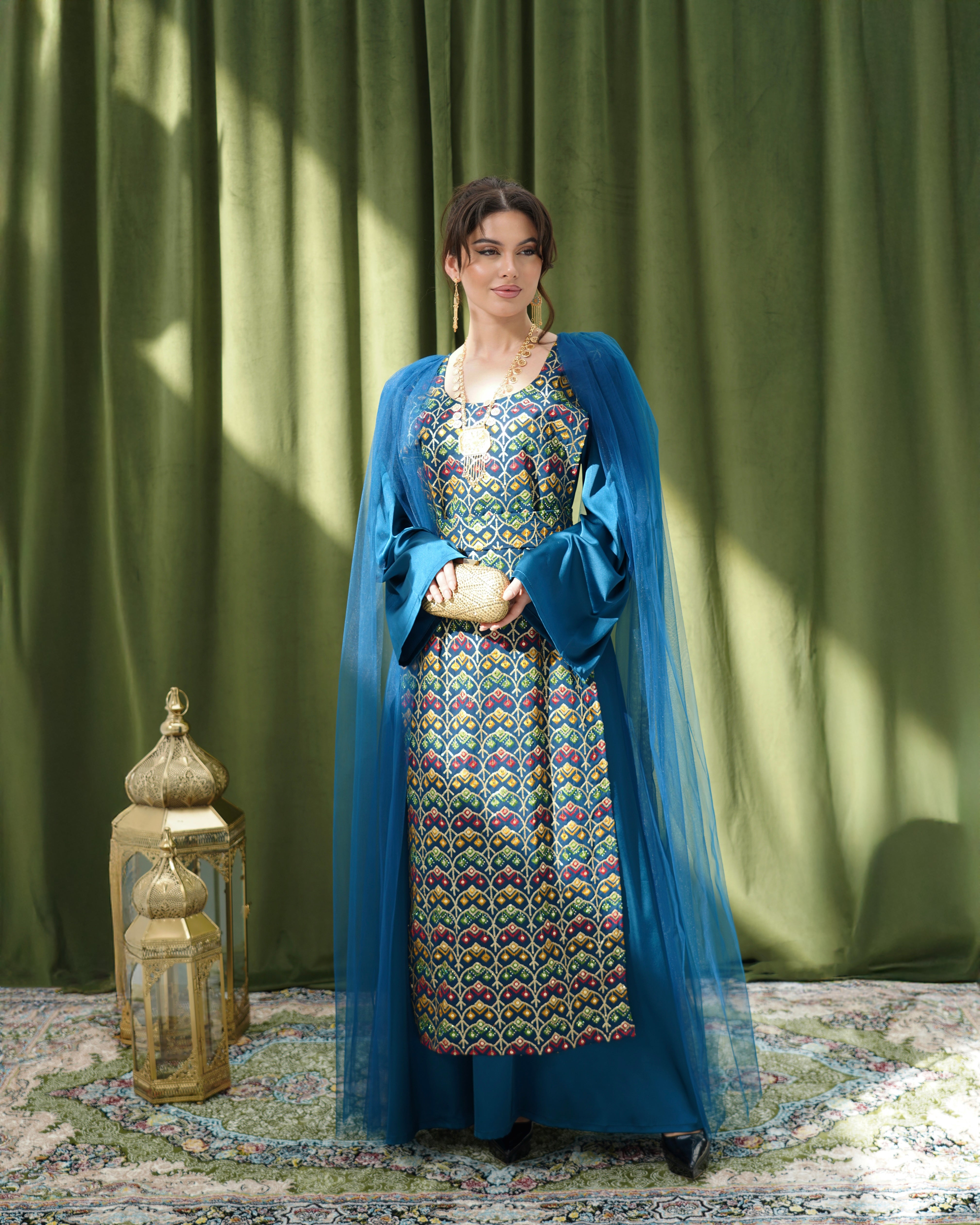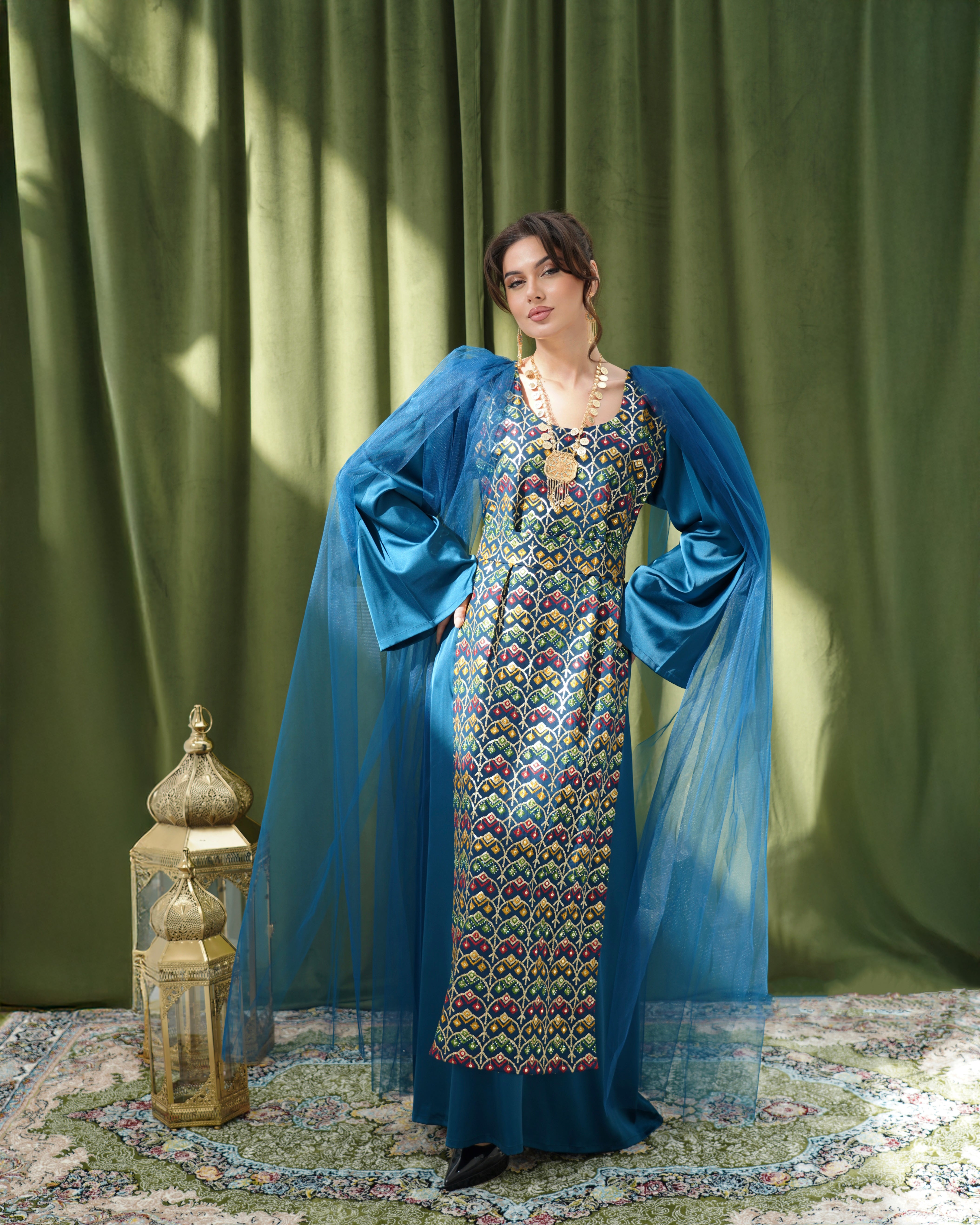 فستان طويل يأتي بقماش حرير مزخرف بأشكال هندسية تراثية، مع تور عند الكتاف ينسدل بنعومة