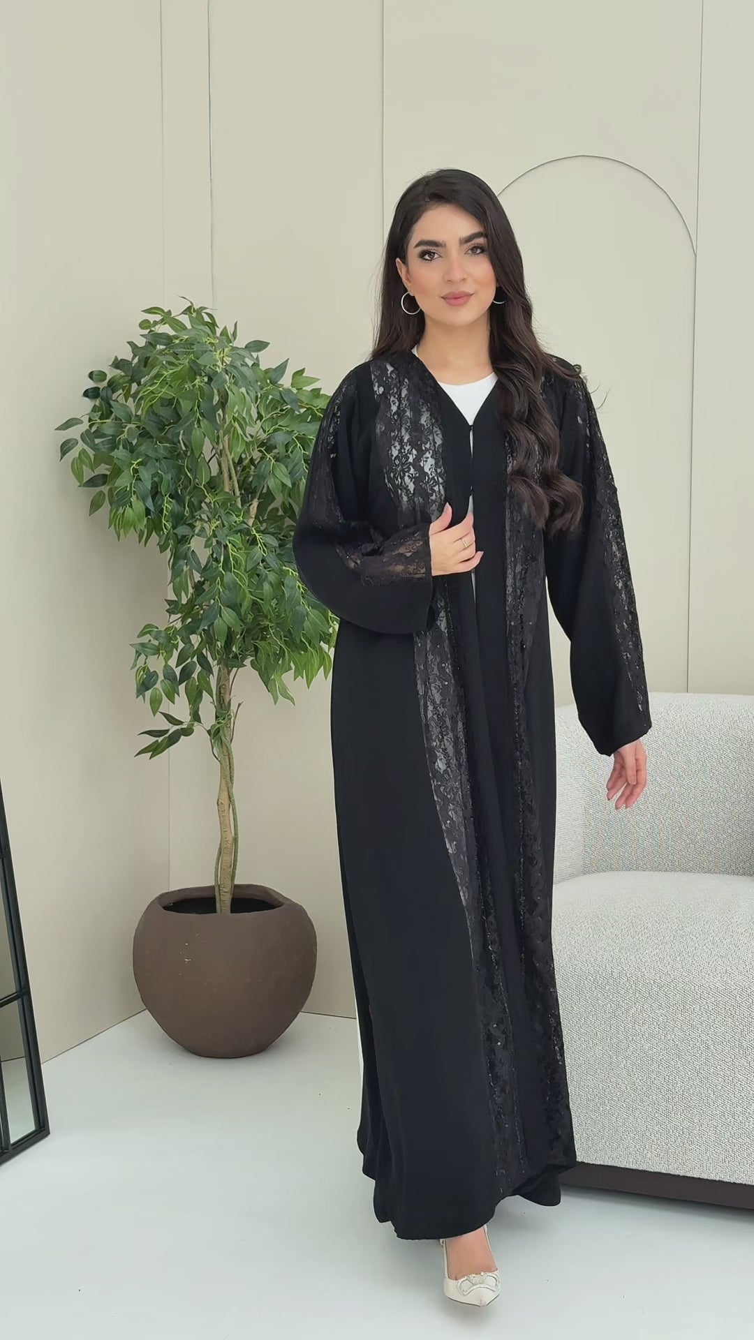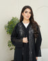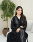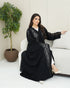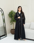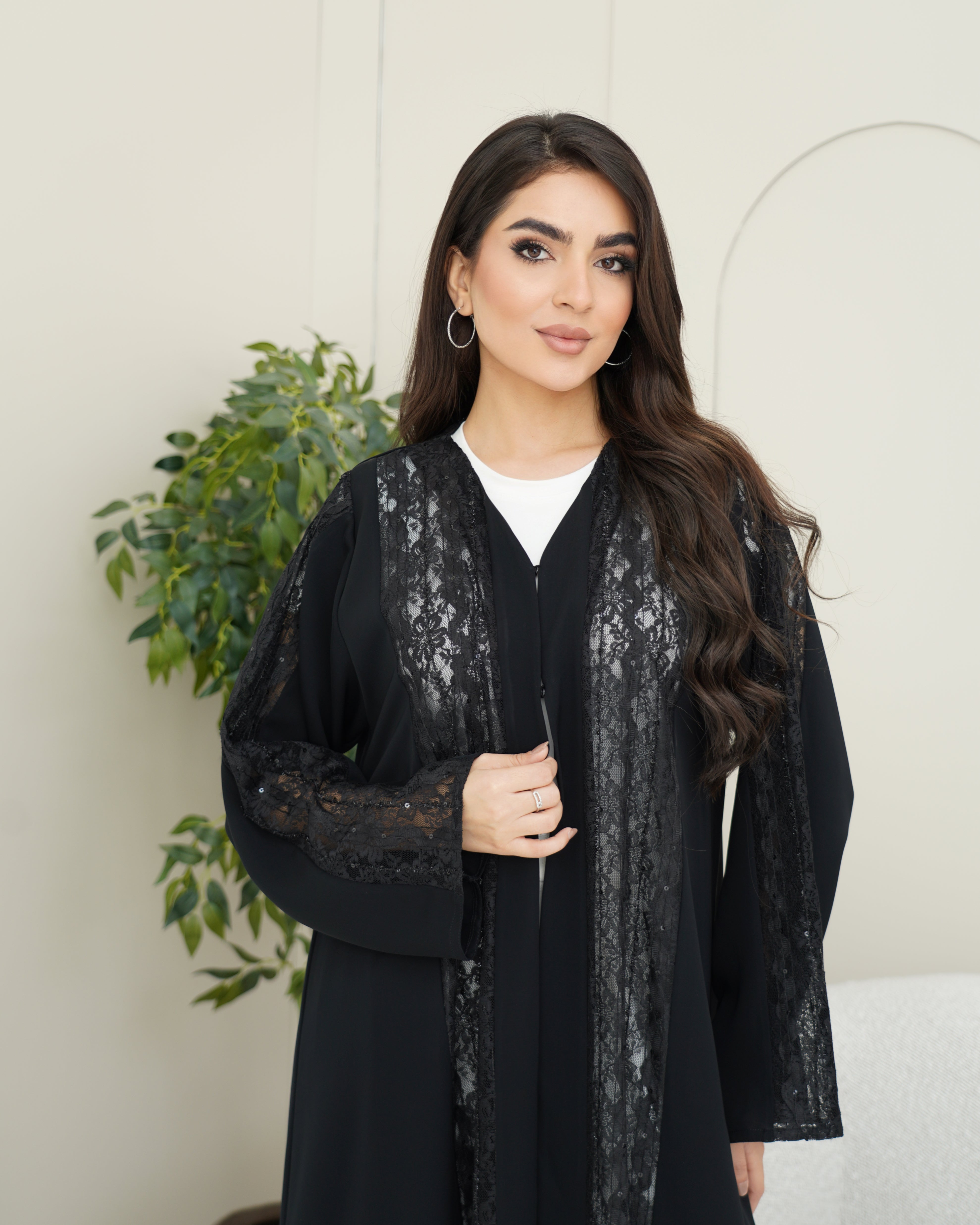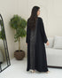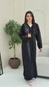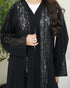 A black abaya crafted from soft Nada fabric, featuring luxurious lace that fully covers the front, extends to the back, and adorns the sleeves. An elegant design perfect for refined occasions and sophisticated everyday looks.