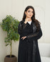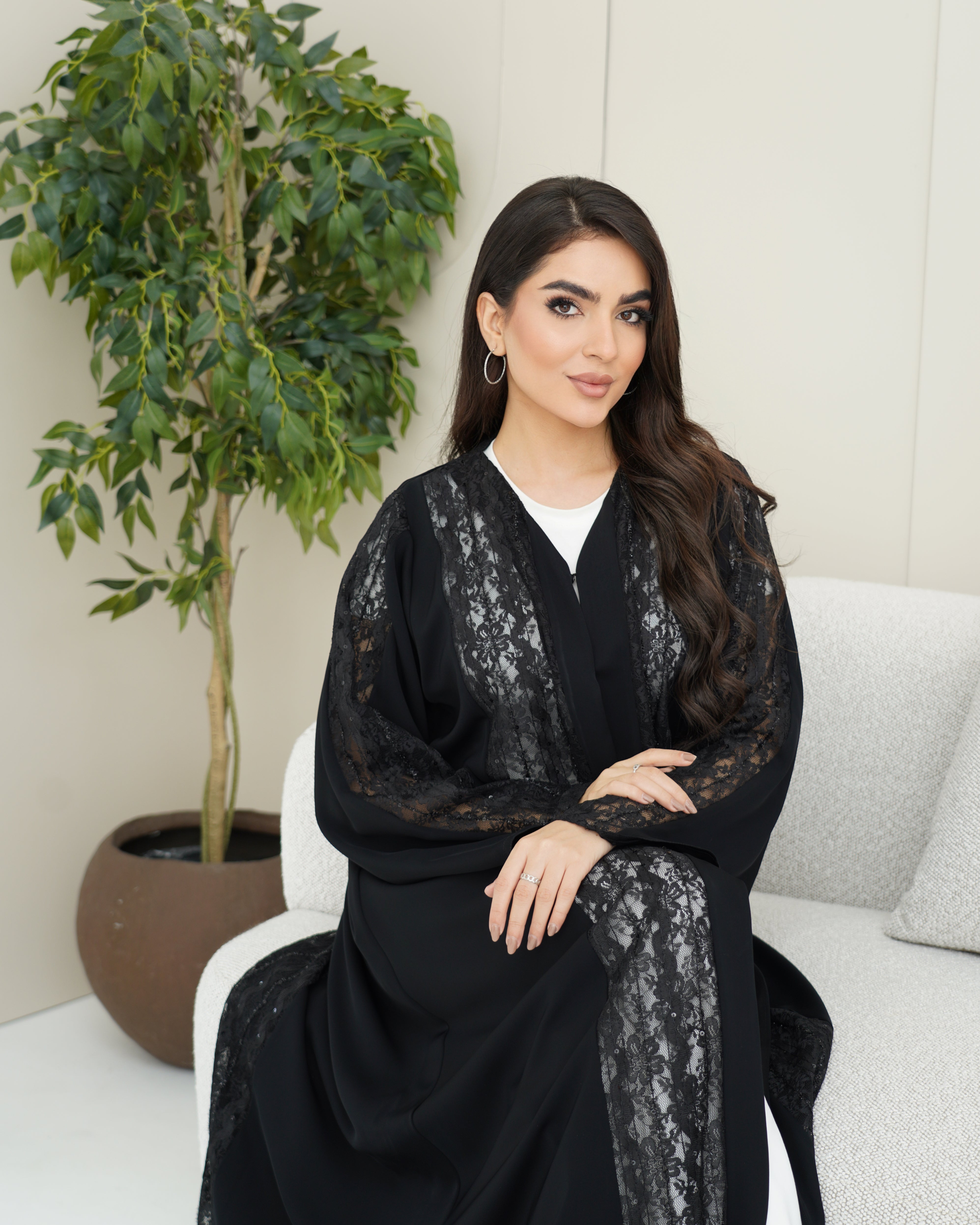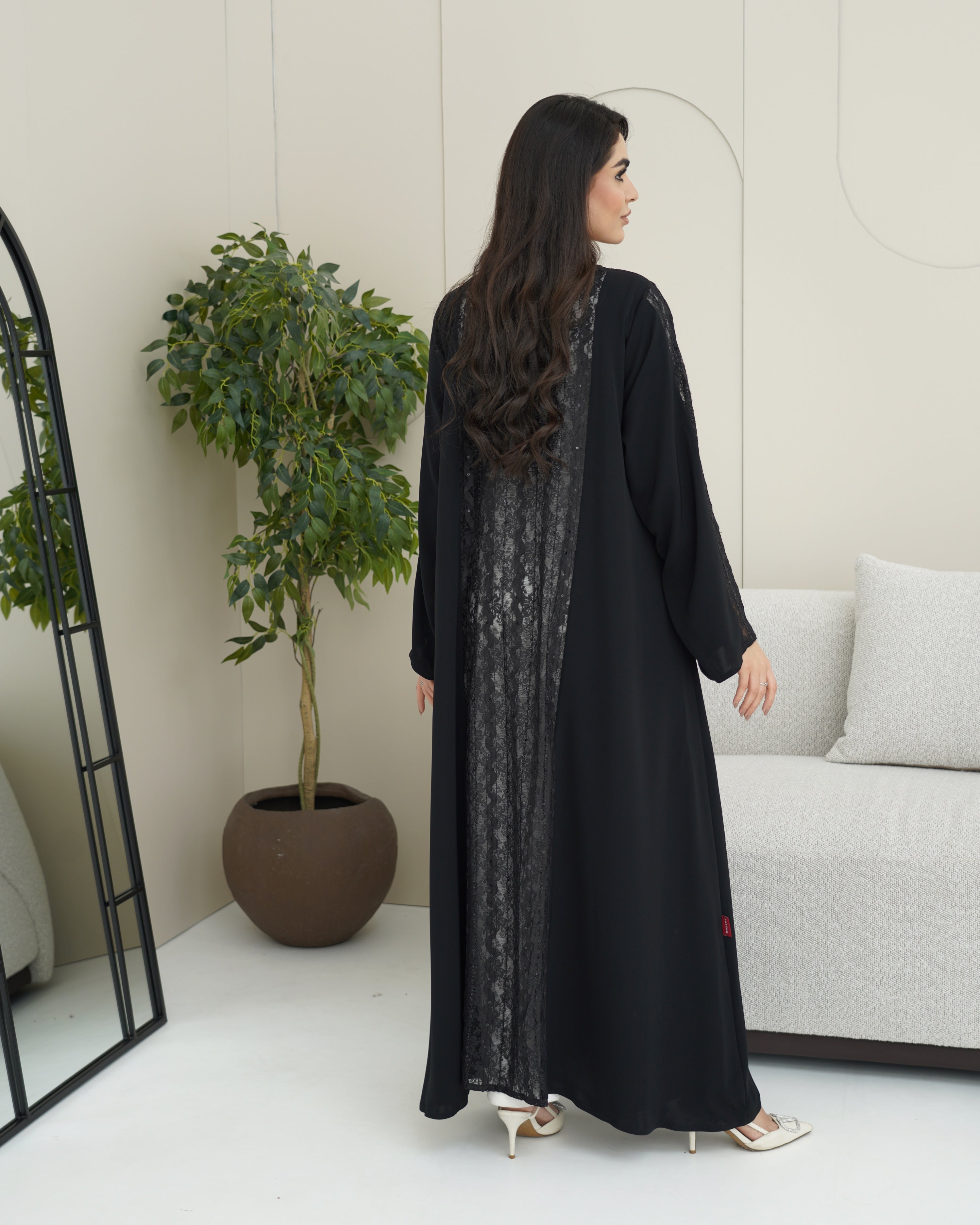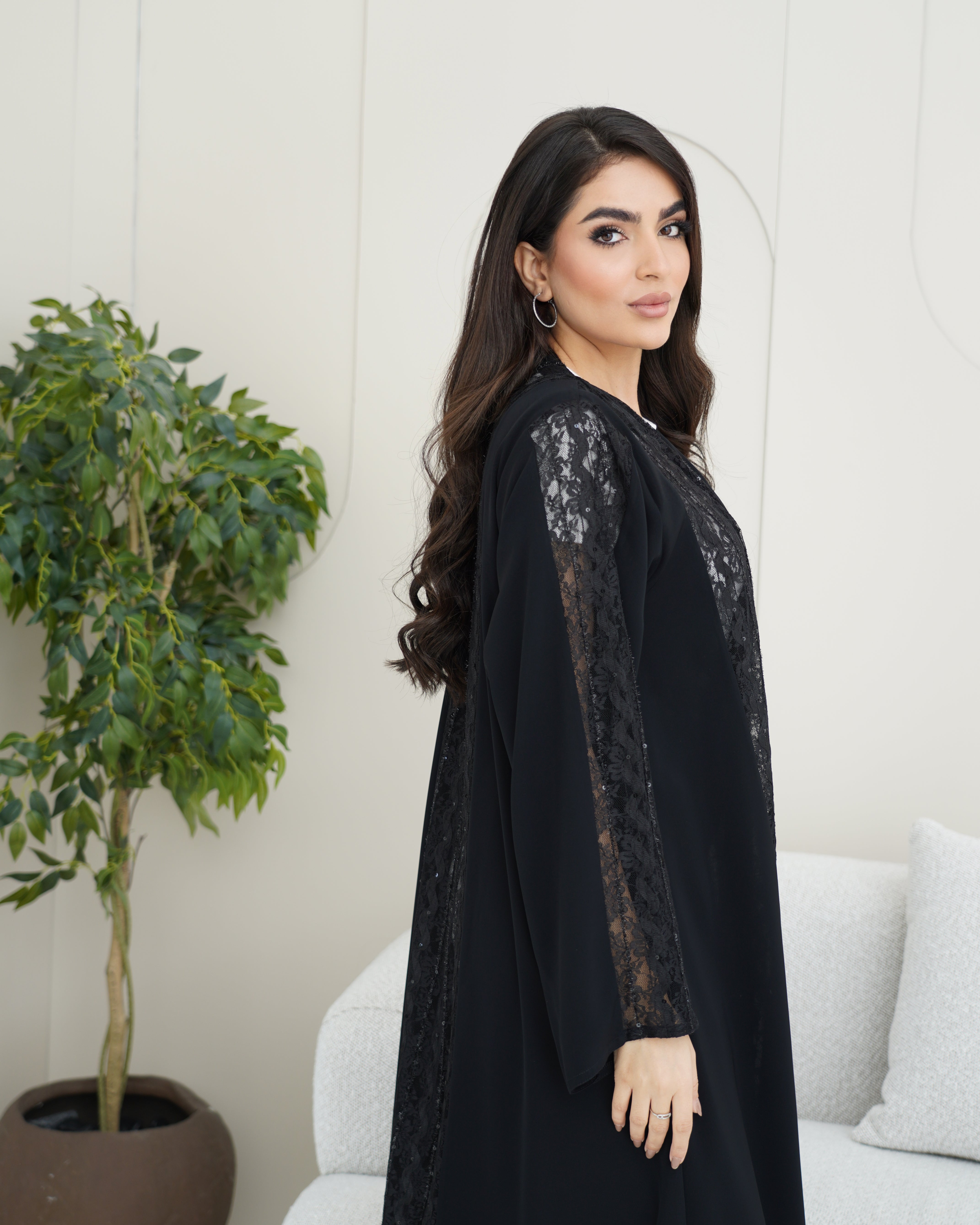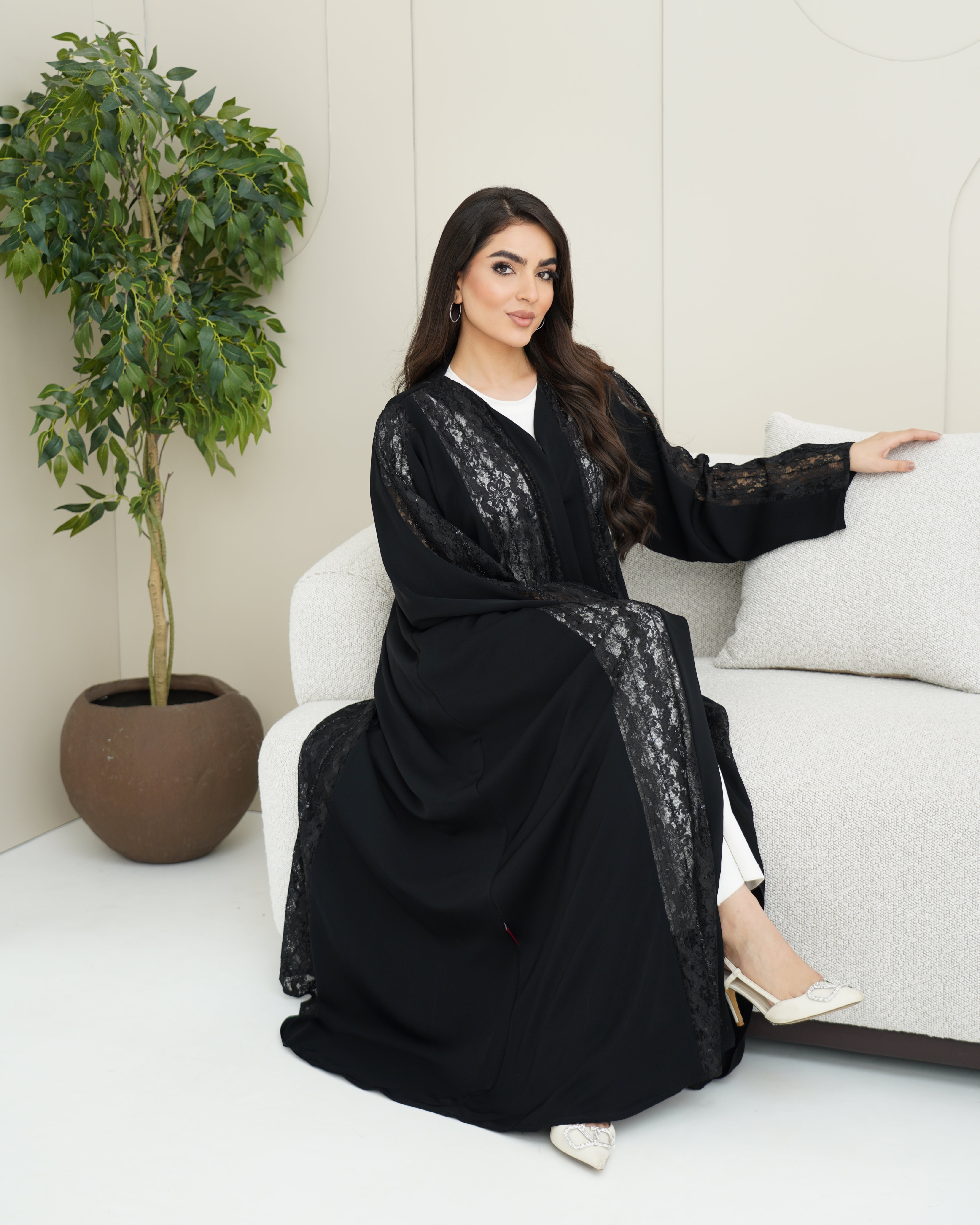 عباية سوداء من قماش ندى بانسيابية ناعمة، مزينة بدانتيل فاخر يغطي الأمام بالكامل ويمتد للخلف وعلى الأكمام، ليمنحها لمسة فخامة متكاملة من جميع الجهات. تصميم أنيق مناسب للمناسبات والإطلالات الراقية