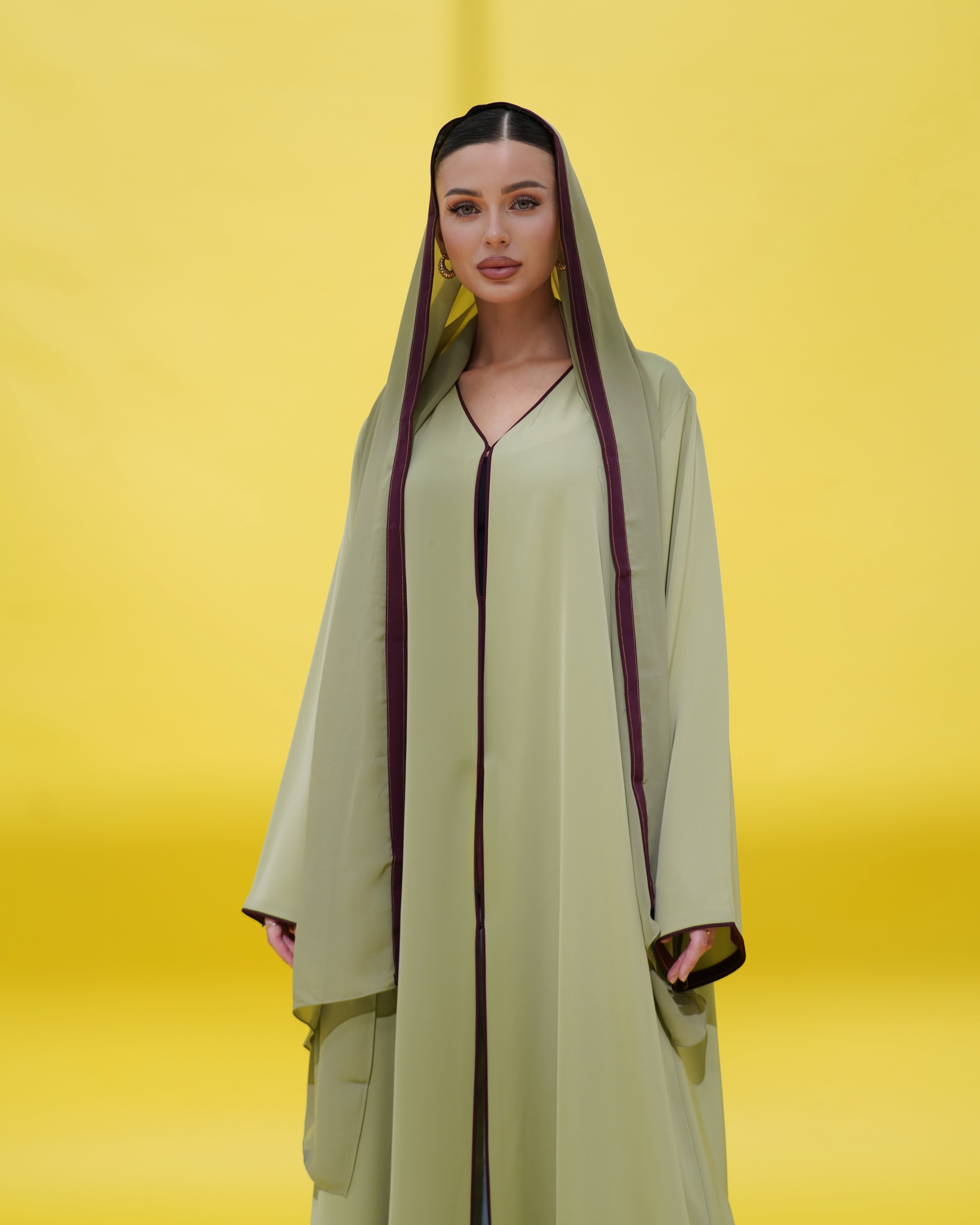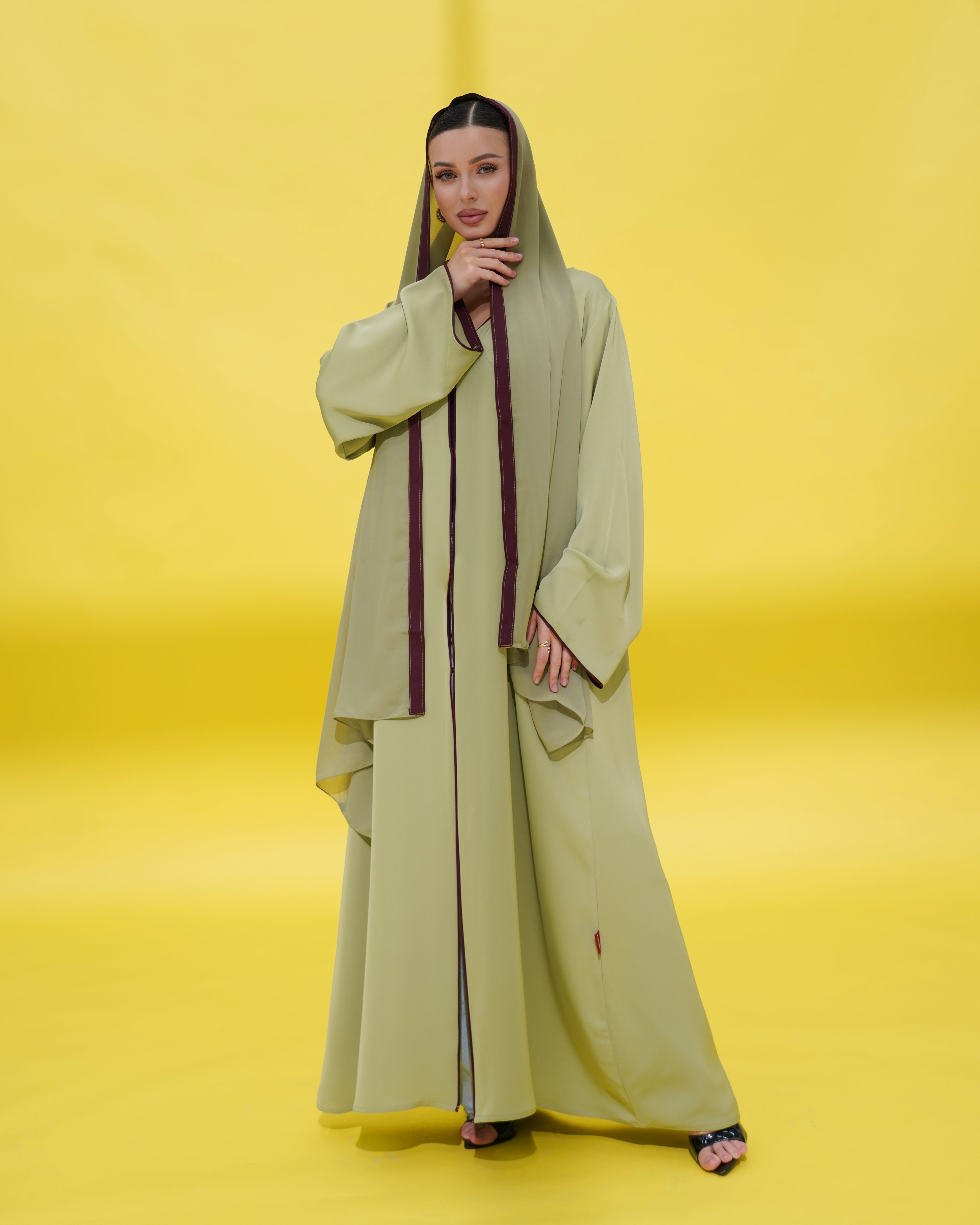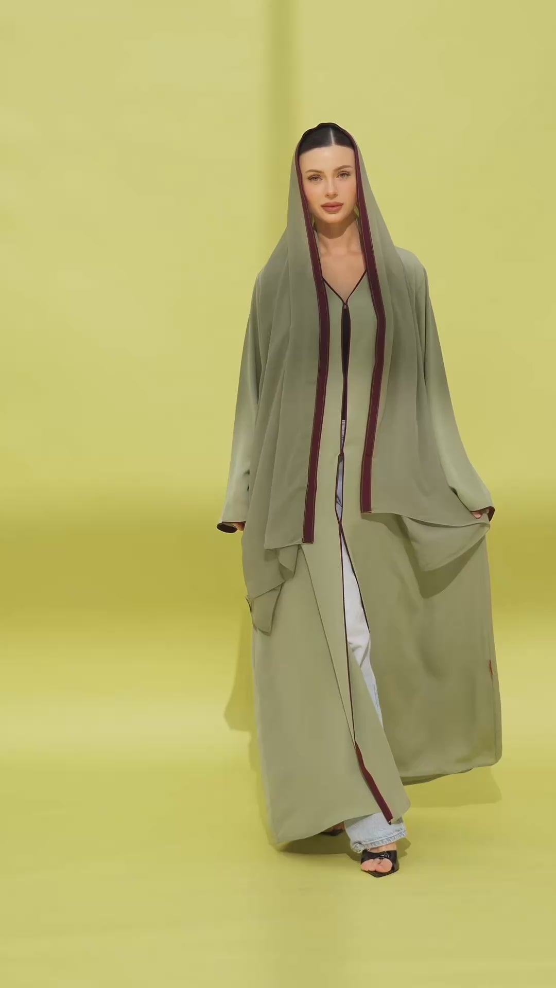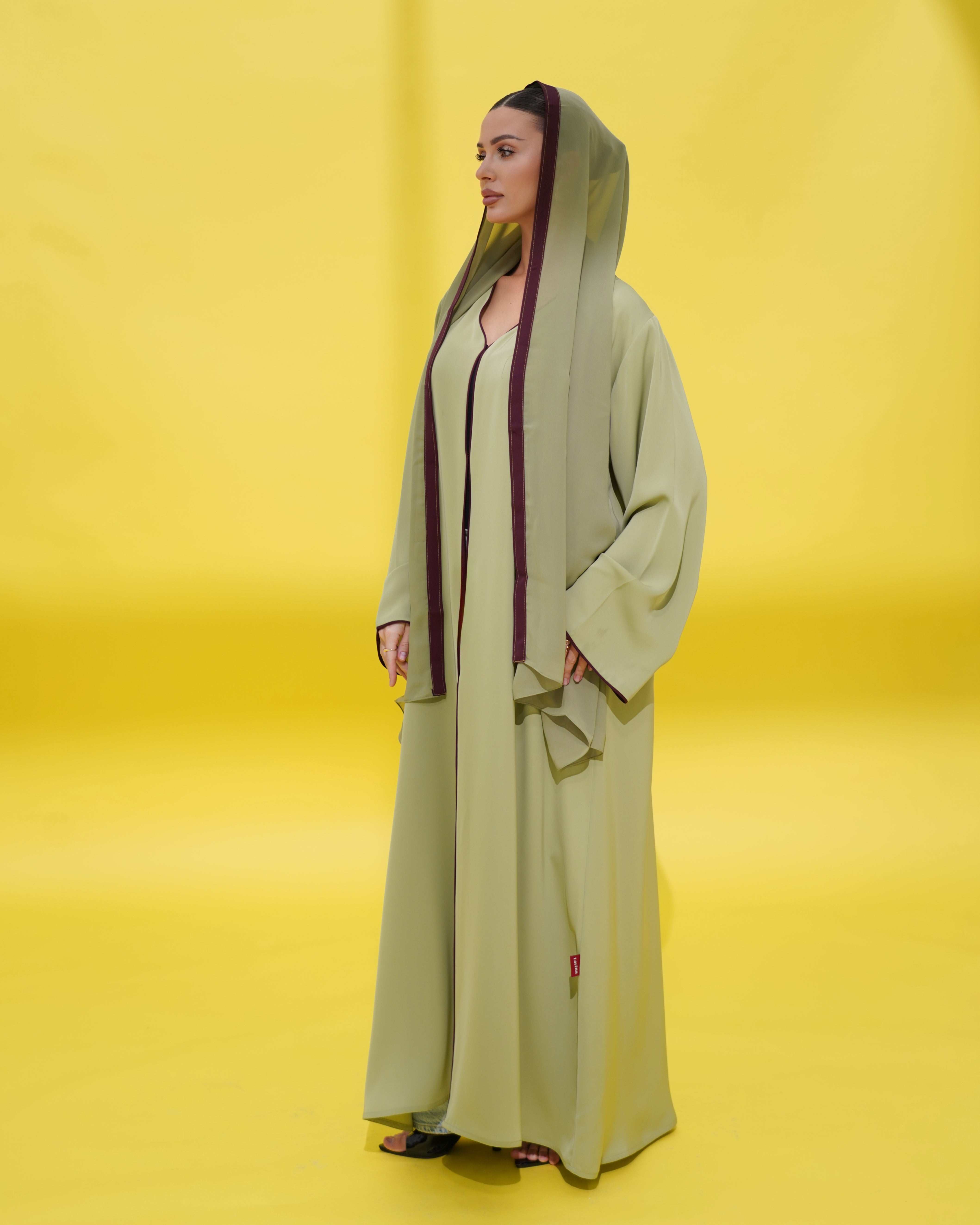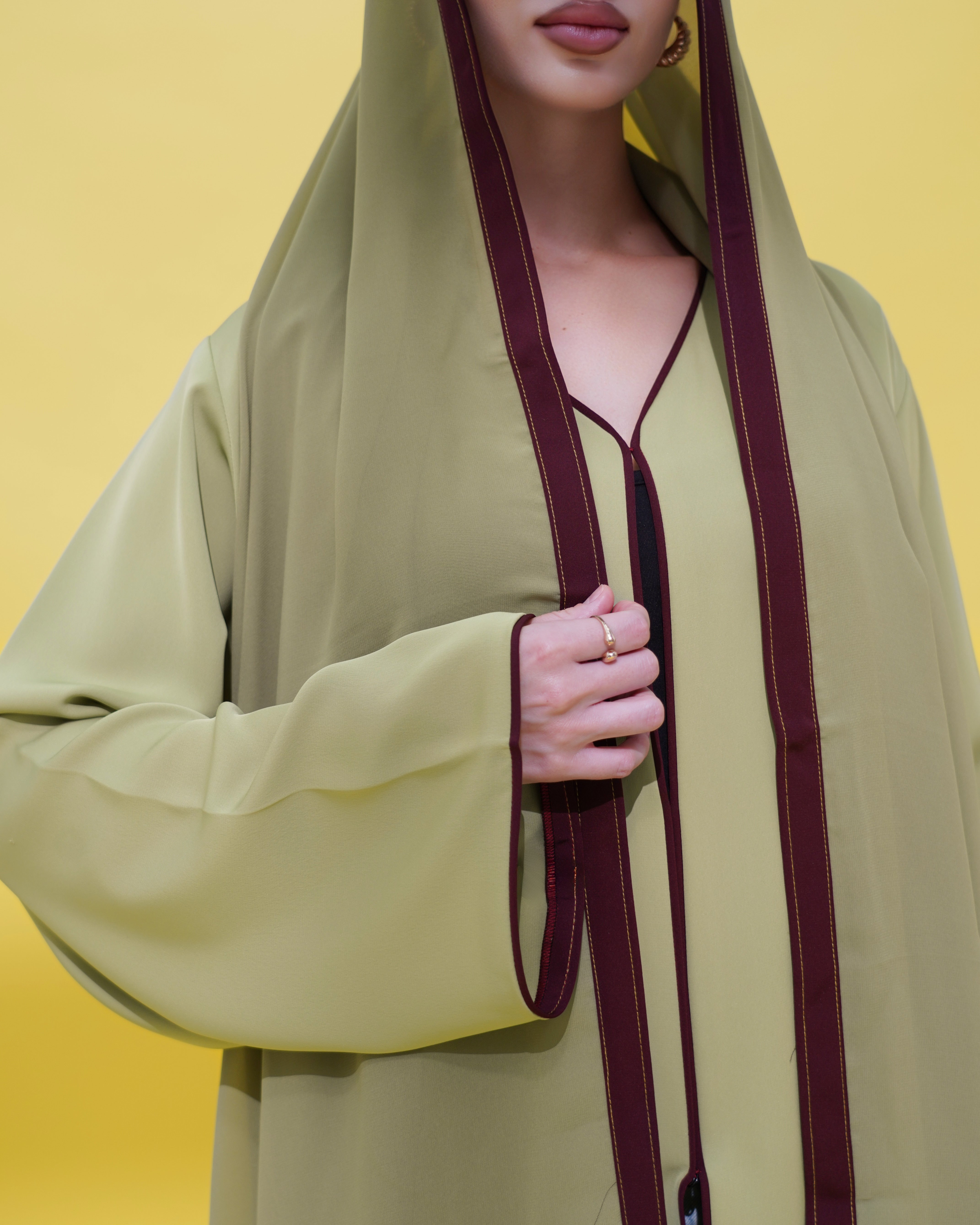 عباية من قماش ندى مع دزاين على الأطراف، ونهاية الأكمام مزينة بخط مارون غامق. وتأتي الشيلة بنفس الستايل مع خط مارون على الطرف لإكمال اللوك بشكل متناسق.
