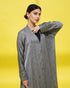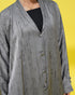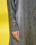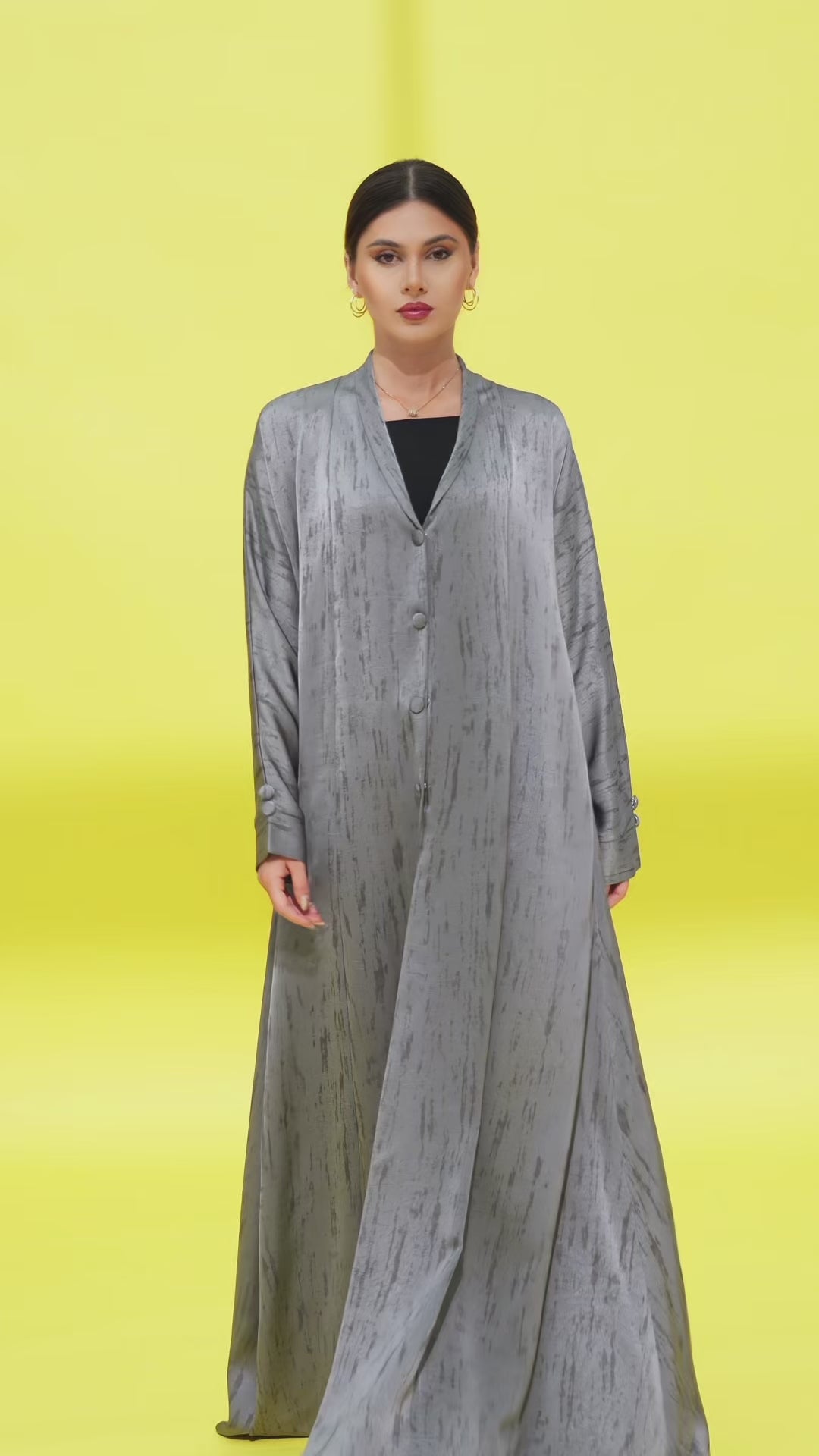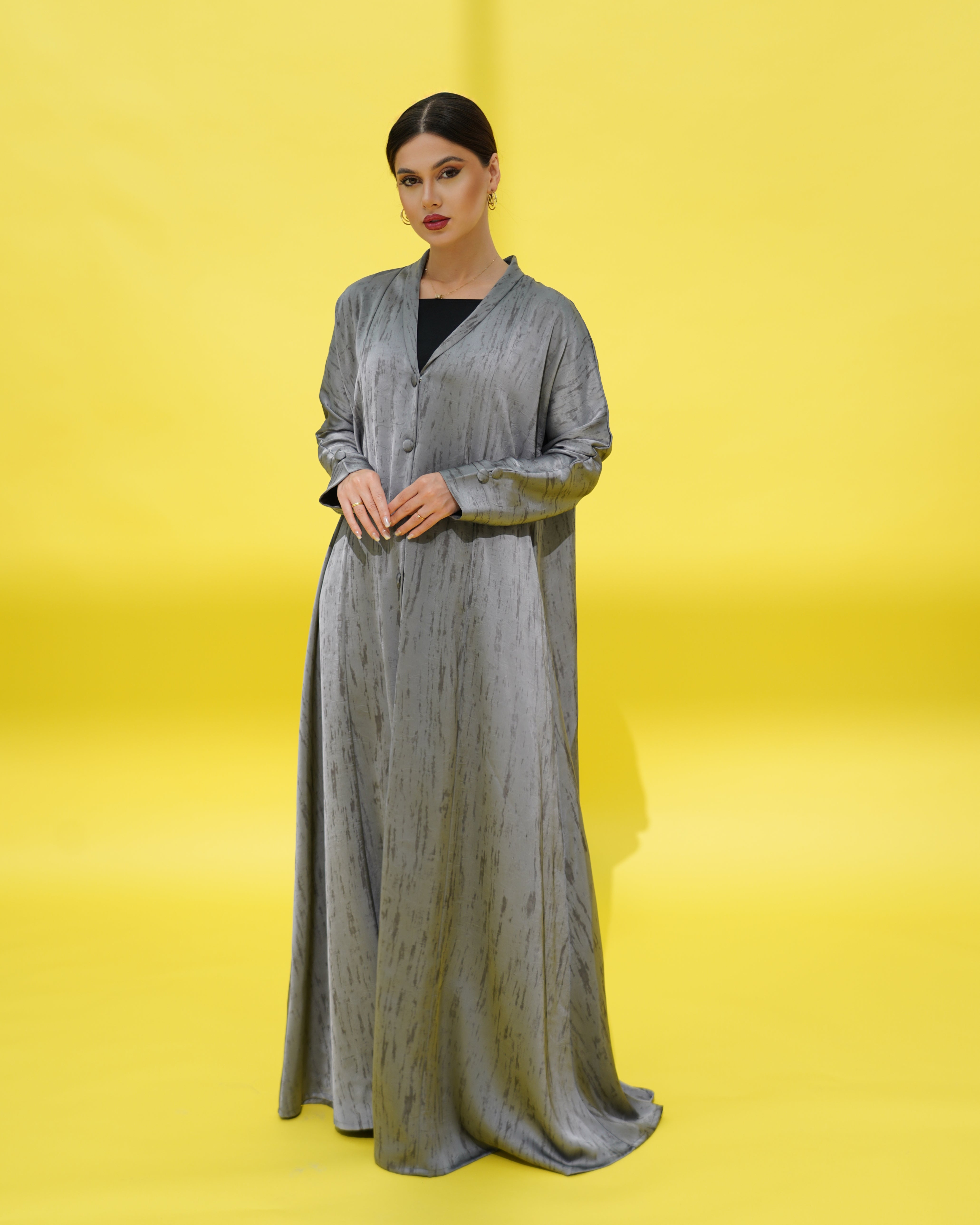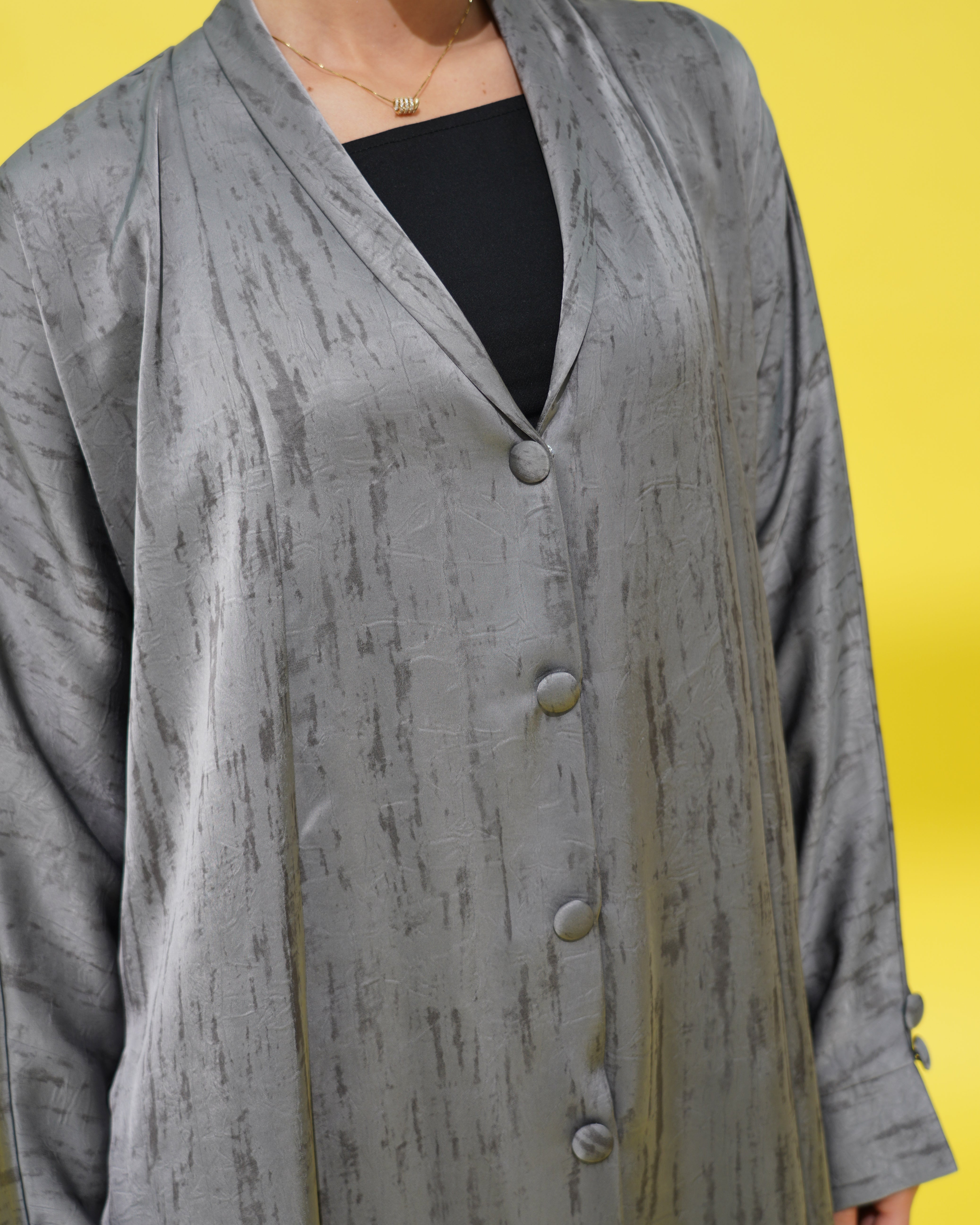Abaya with a light textured pattern, featuring front buttons and matching fabric buttons at the sleeve ends.