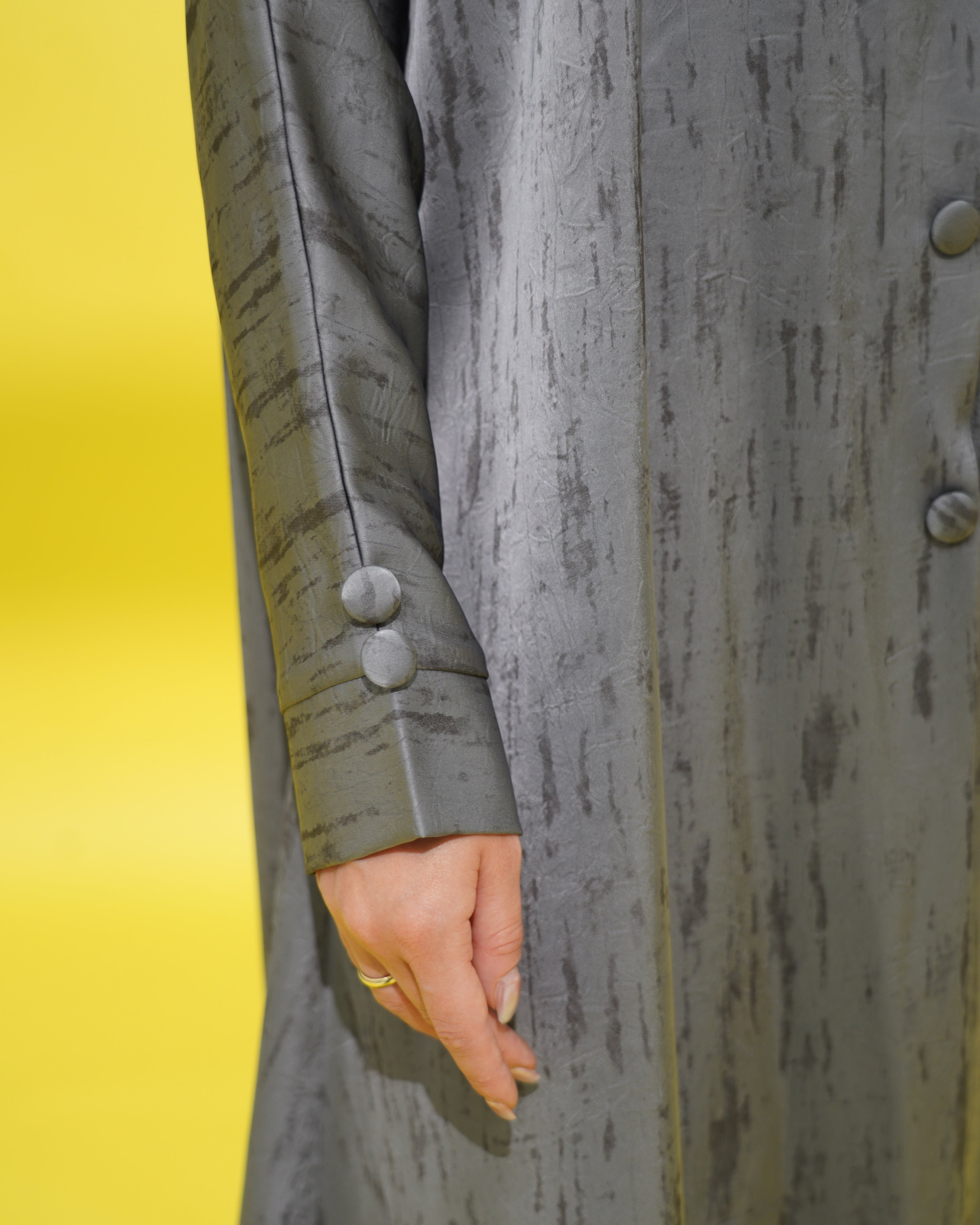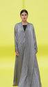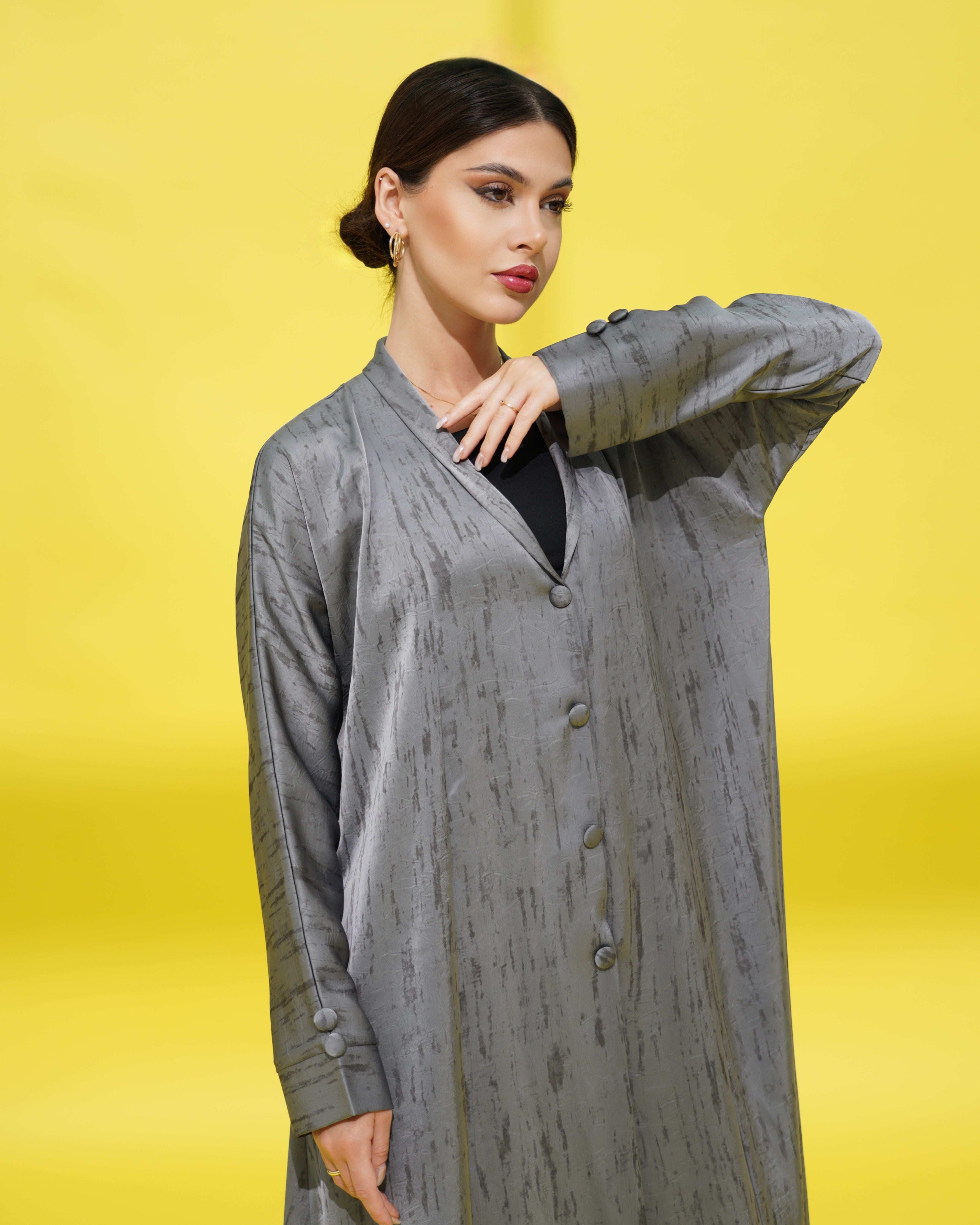 عباية بنقشة خفيفة، مع أزرار أمامية وأزرار على نهاية الأكمام بنفس القماش.