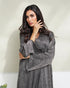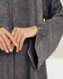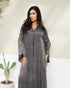abaya with a luxurious textured pattern and a subtle sheen, combining elegance and comfort with a refined design featuring graceful sleeves accented by a simple button that adds a touch of sophistication.