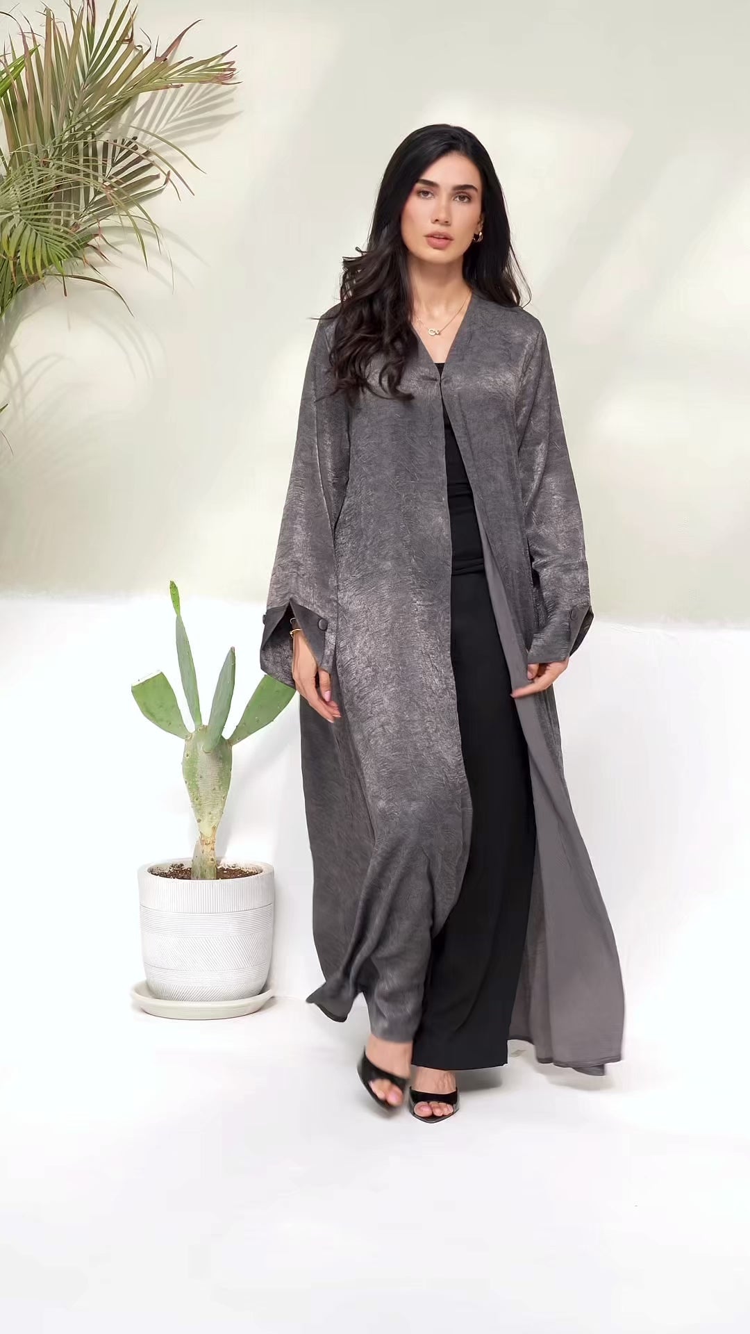 عباية بنقشة فاخرة ولمعة ناعمة، تجمع بين الأناقة والراحة بتصميم راقٍ مزوّد بأكمام أنثوية أنيقة مع زرّ بسيط يضيف لمسة فخامة.