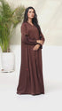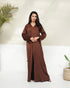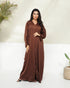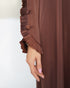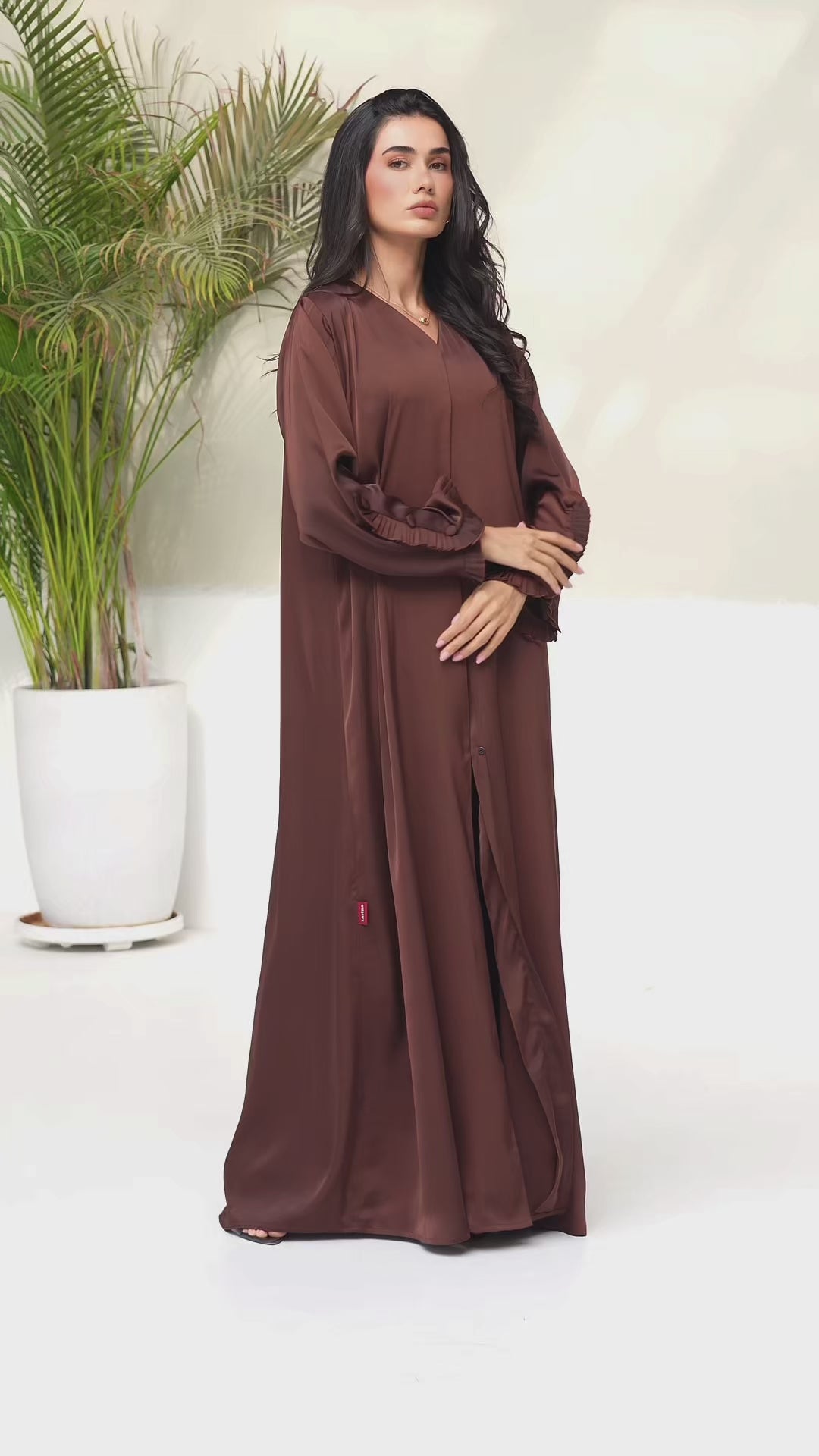تصميمها انسيابي وأنيق، ويبرز جمالها في تفاصيل الأكمام المزينة بكشـكشة ناعمة تمتدّ على الأطراف، مع أزرار ملونة على الاكمام .