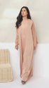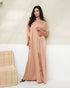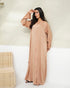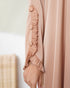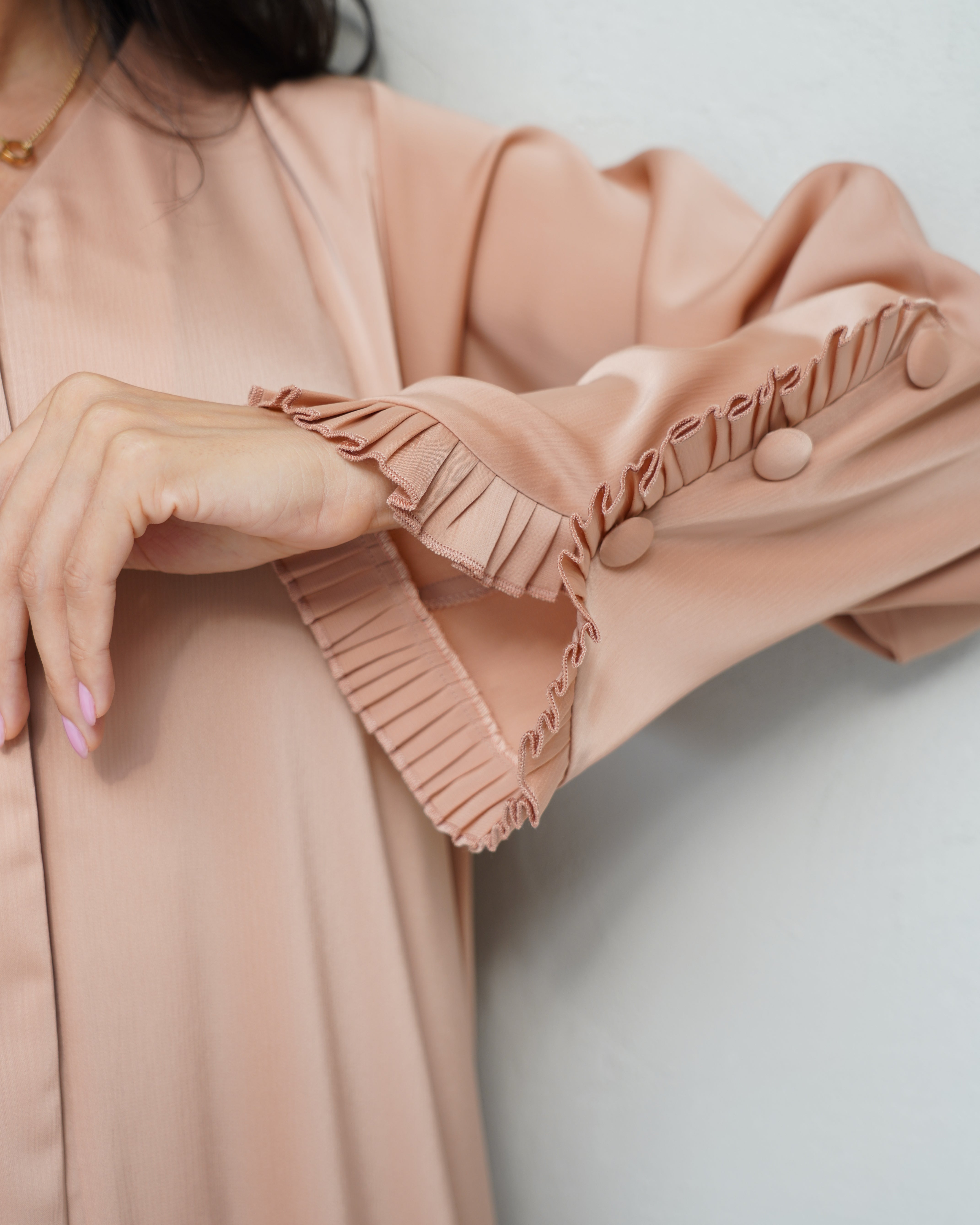 تصميمها انسيابي وأنيق، ويبرز جمالها في تفاصيل الأكمام المزينة بكشـكشة ناعمة تمتدّ على الأطراف، مع أزرار ملونة على الاكمام .