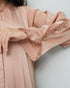 Its design is flowy and elegant, highlighted by softly ruffled sleeves adorned with delicate gathers along the edges and accented with matching colored buttons.