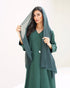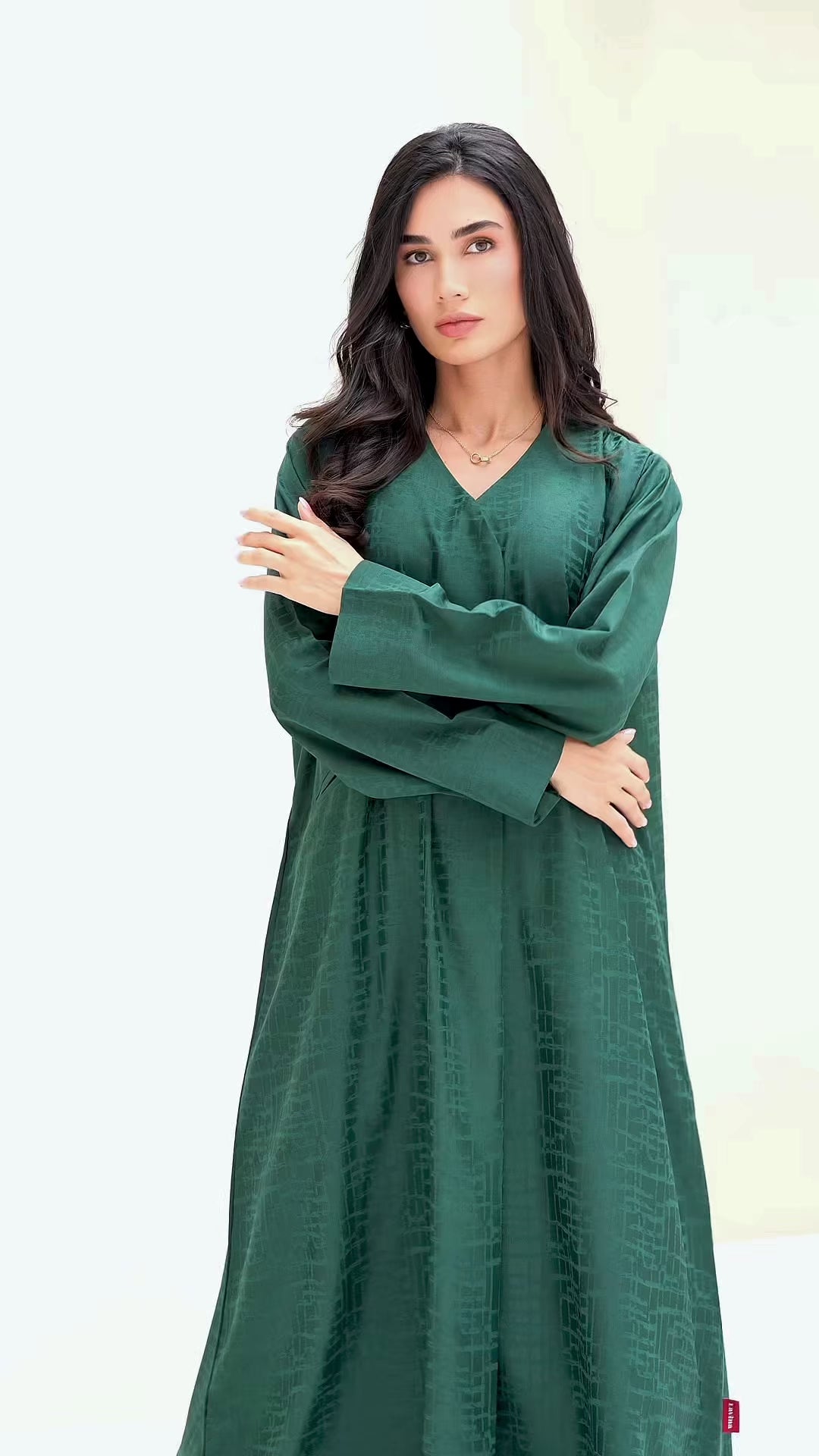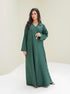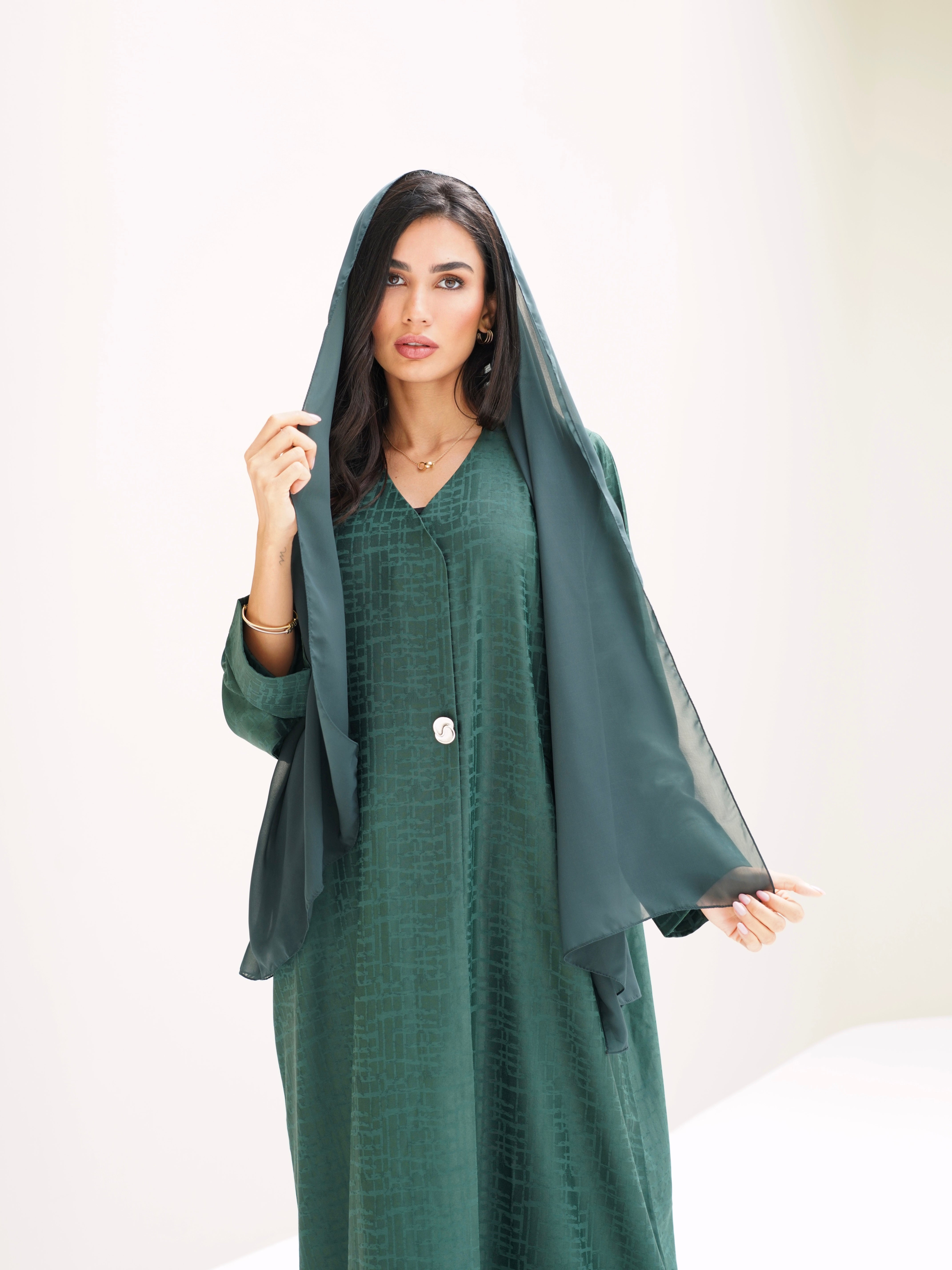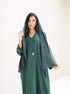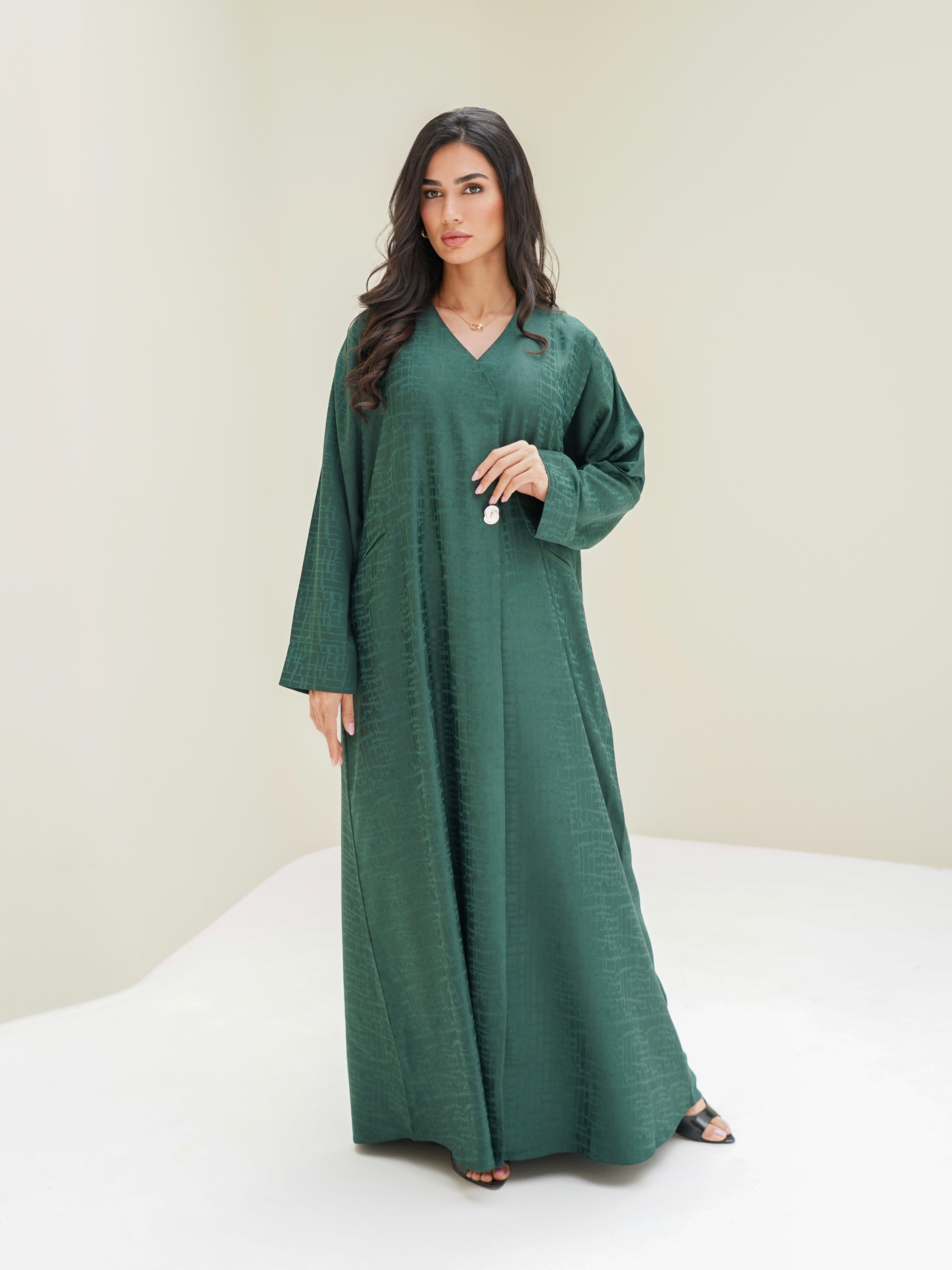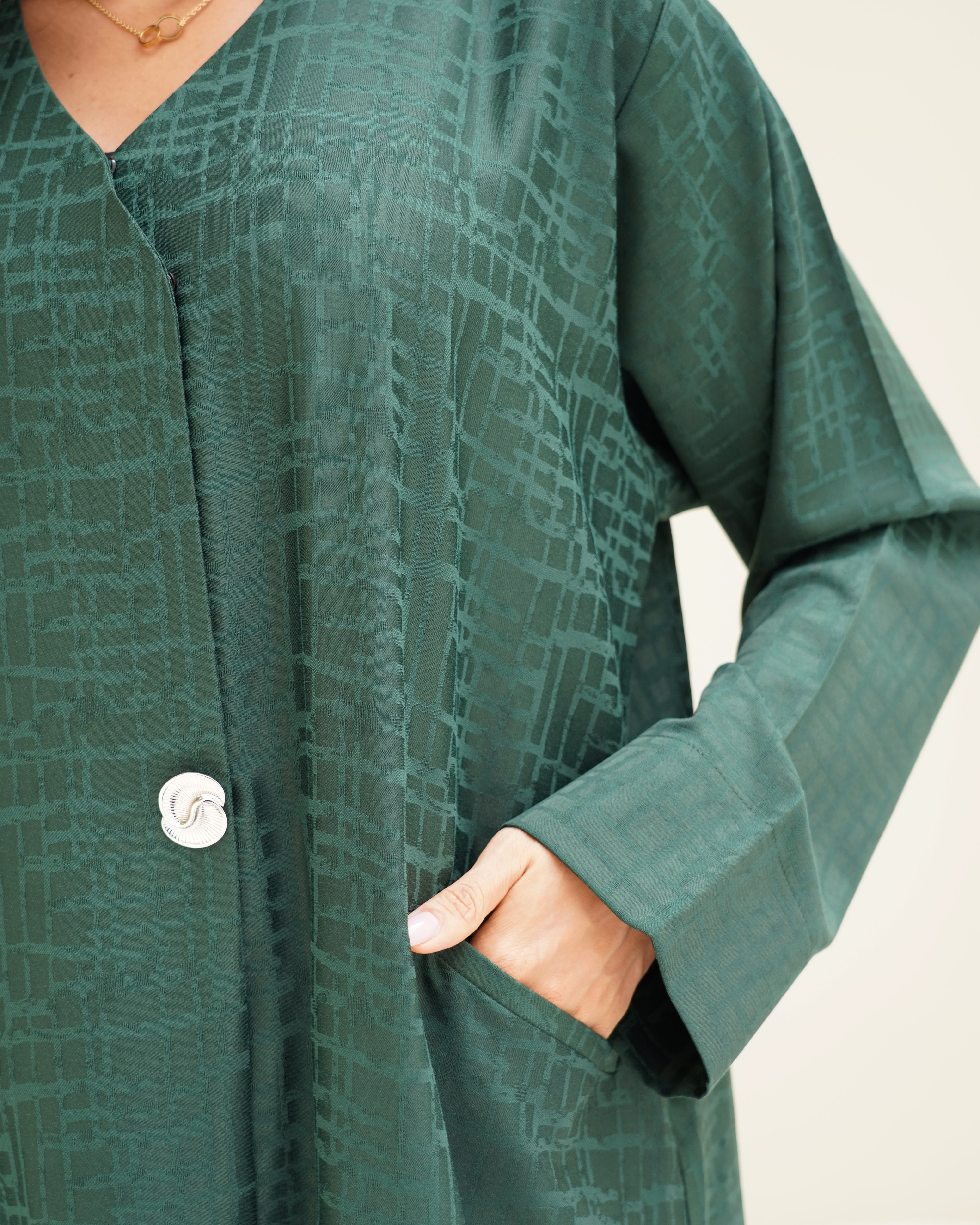 An abaya with delicate details, featuring elegant textured fabric, a chic pearl button, and a practical side pocket.