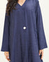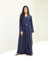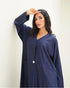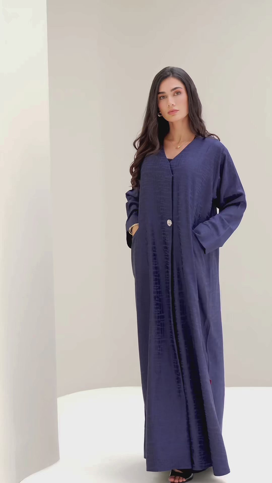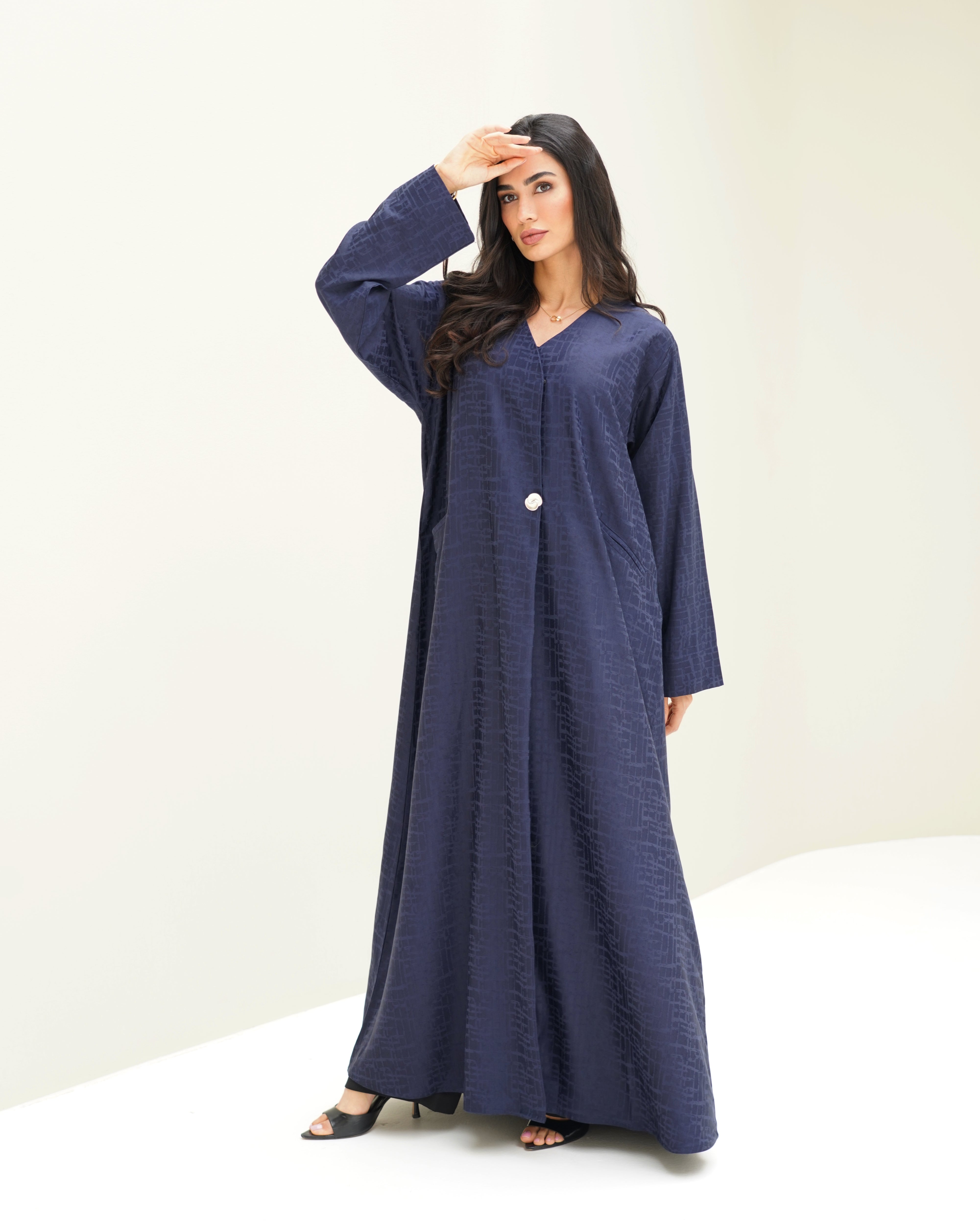 An abaya with delicate details, featuring elegant textured fabric, a chic pearl button, and a practical side pocket.