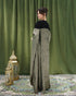 الجزء العلوي من الفستان بقماش أسود ناعم يتوسطه تفصيل وردة أنيق يشكّل نقطة جمال مميزة، بينما ينسدل القماش السفلي بملمس مخملي لامع ليكمل الإطلالة بفخامة وبساطة.