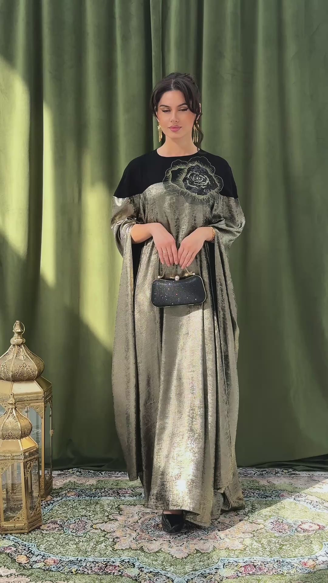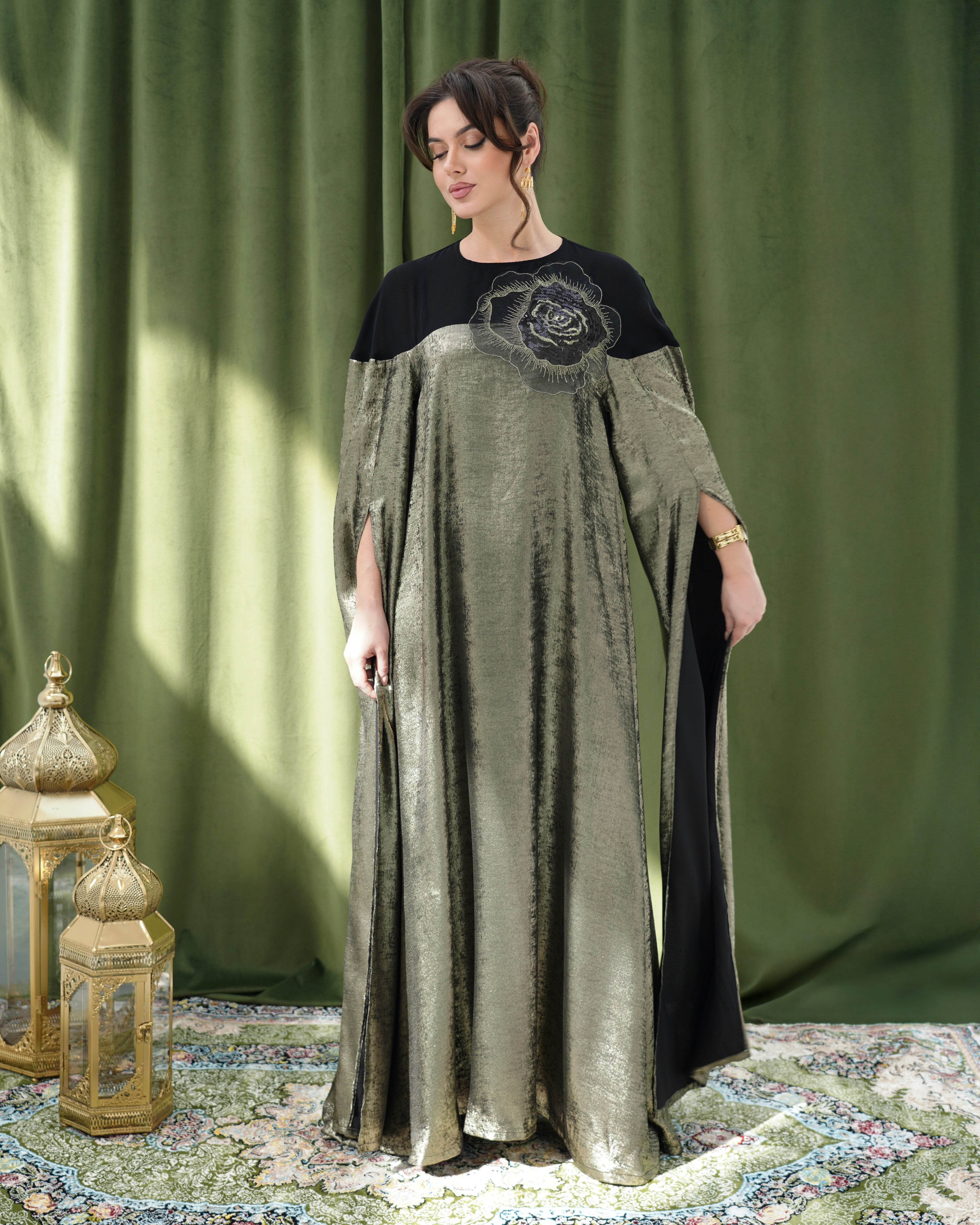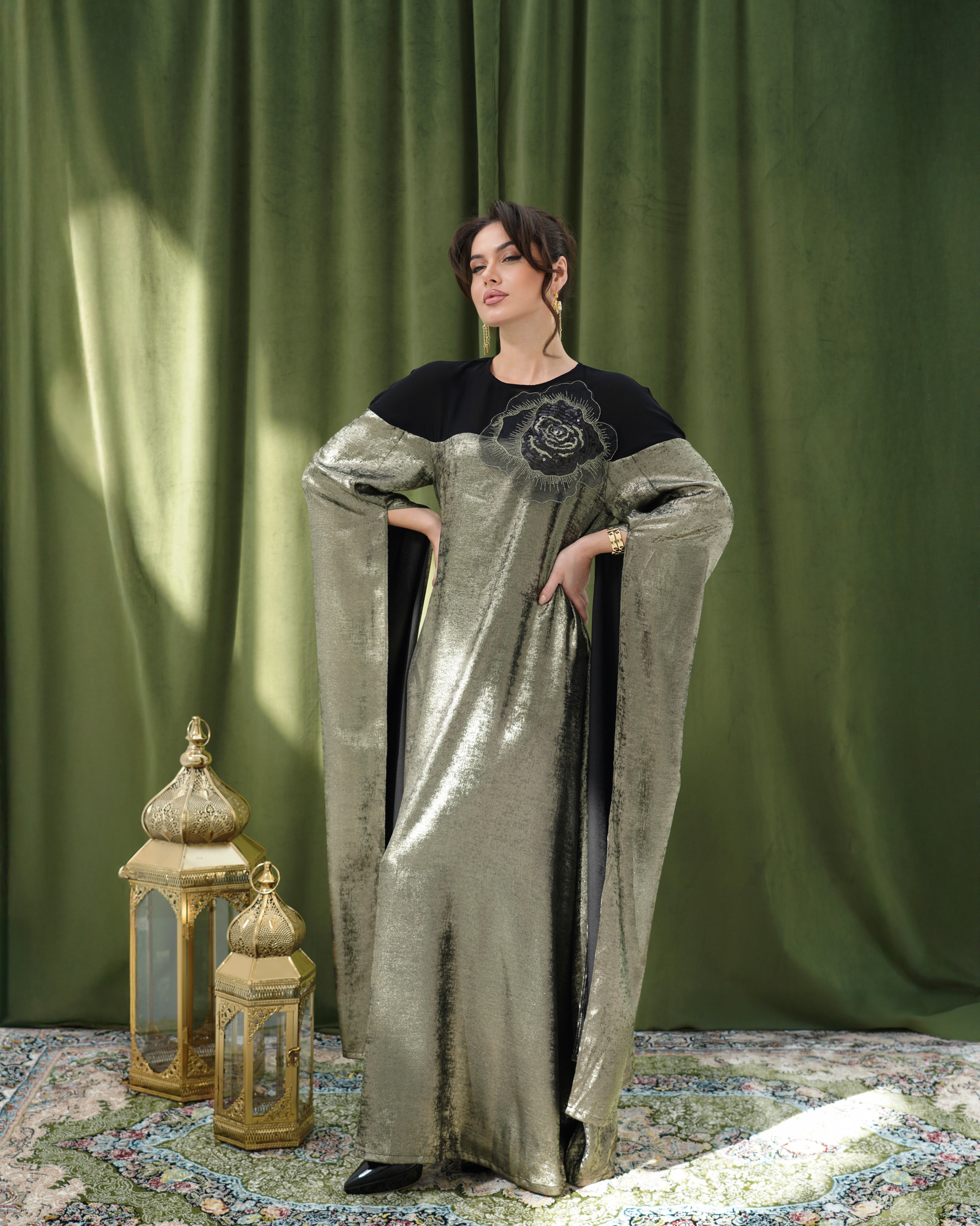 فستان أنيق بقصّة واسعة وانسيابية، يتميز بأكمام فضفاضة مفتوحة تضيف لمسة أنثوية راقية.