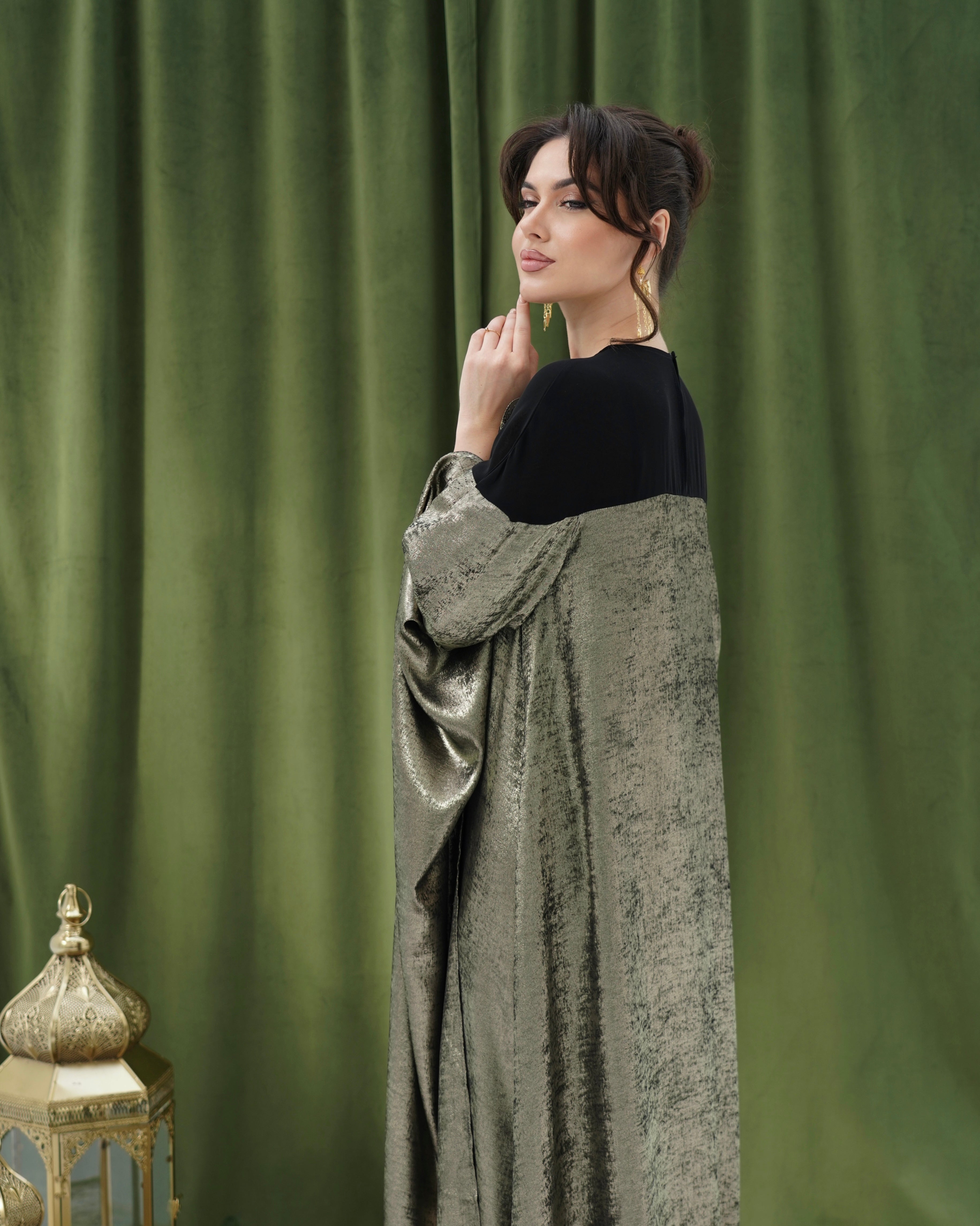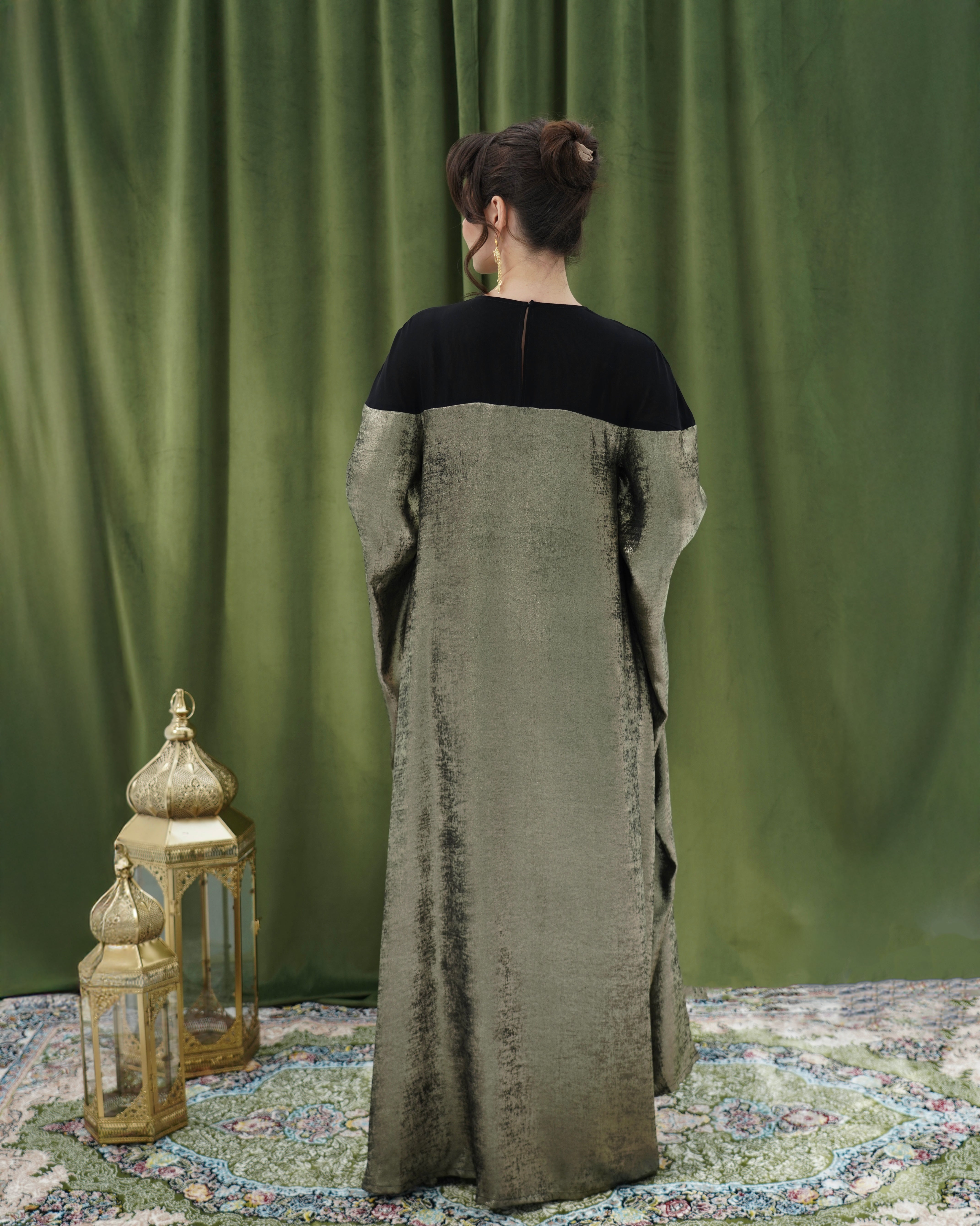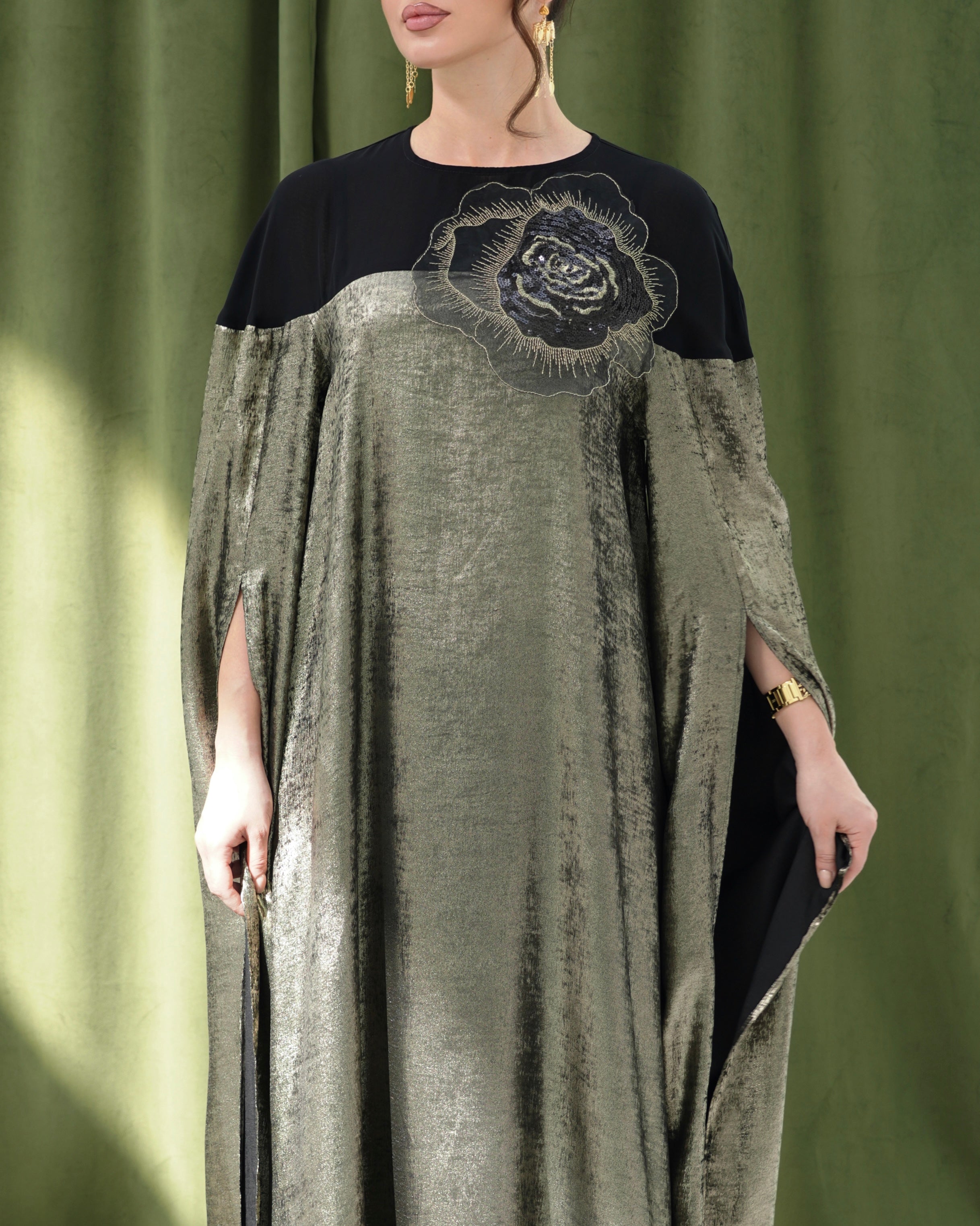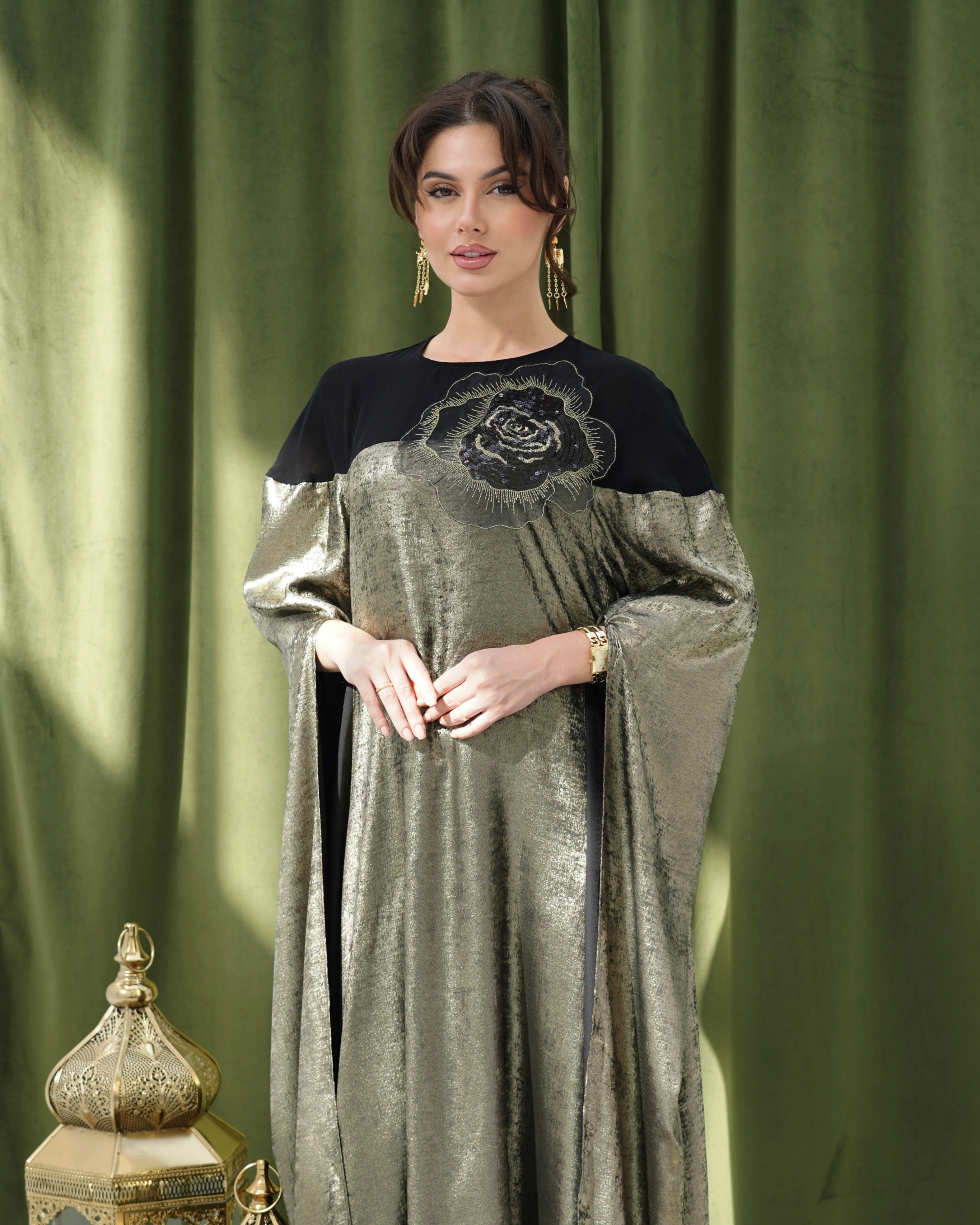 فستان أنيق بقصّة واسعة وانسيابية، يتميز بأكمام فضفاضة مفتوحة تضيف لمسة أنثوية راقية.