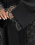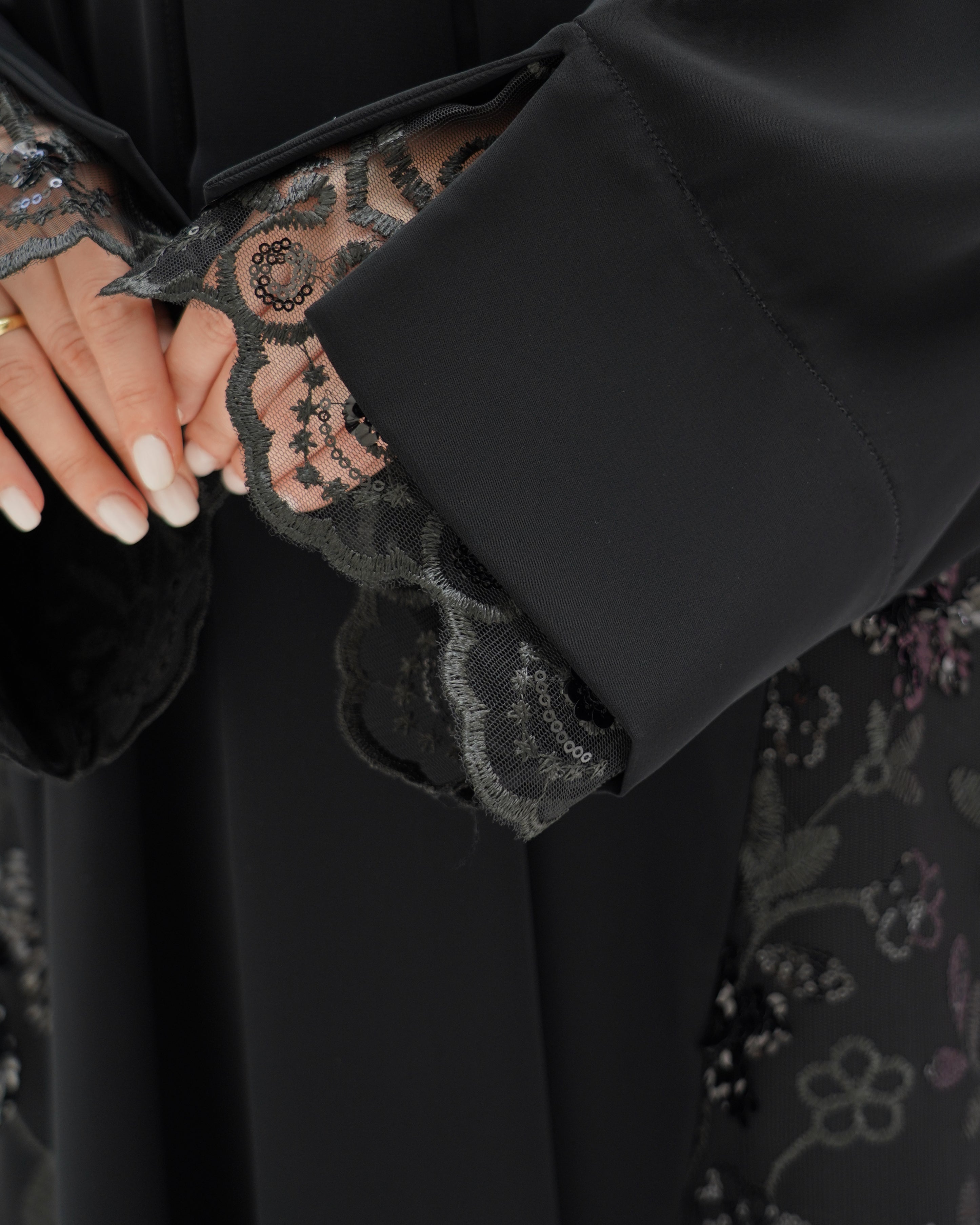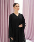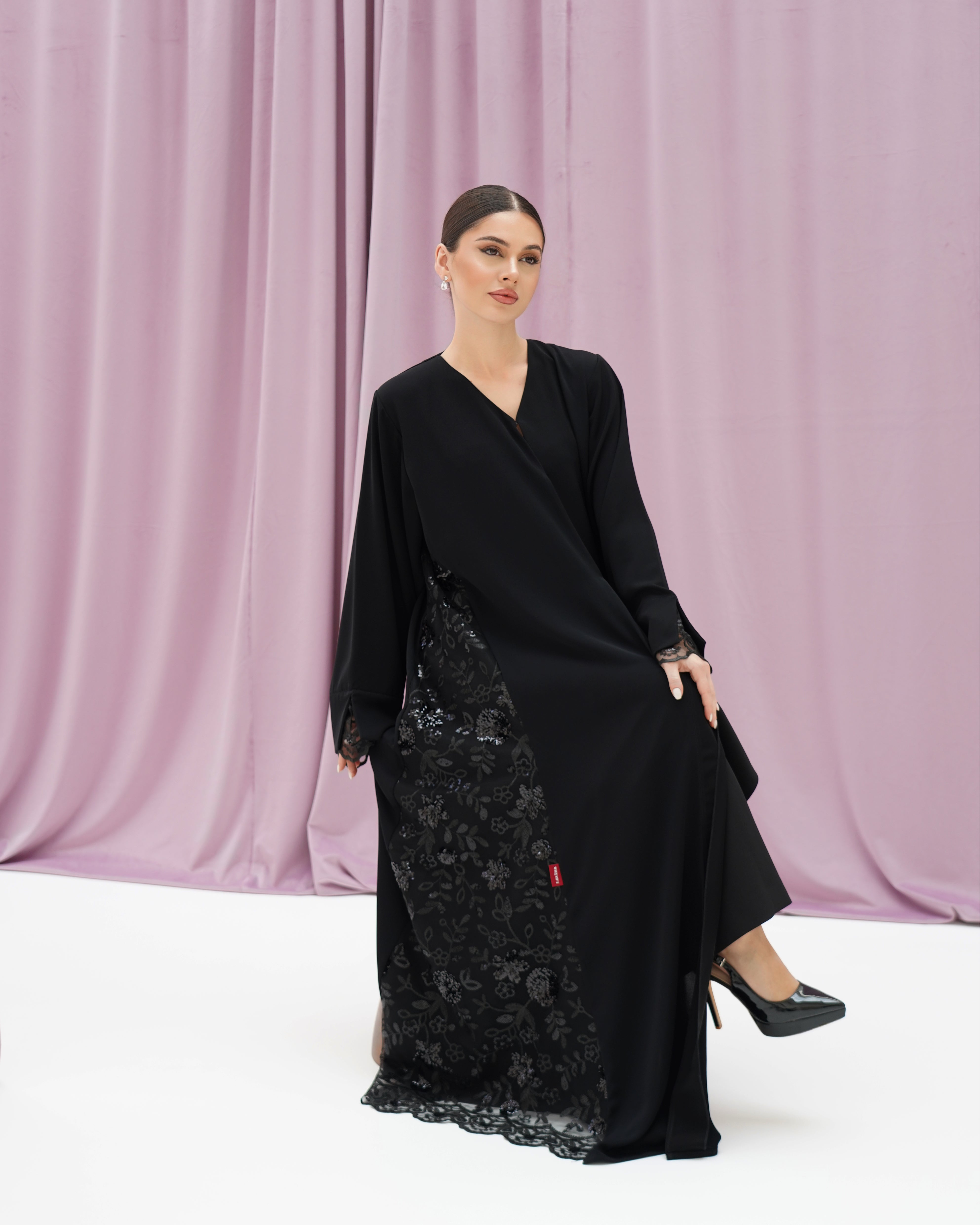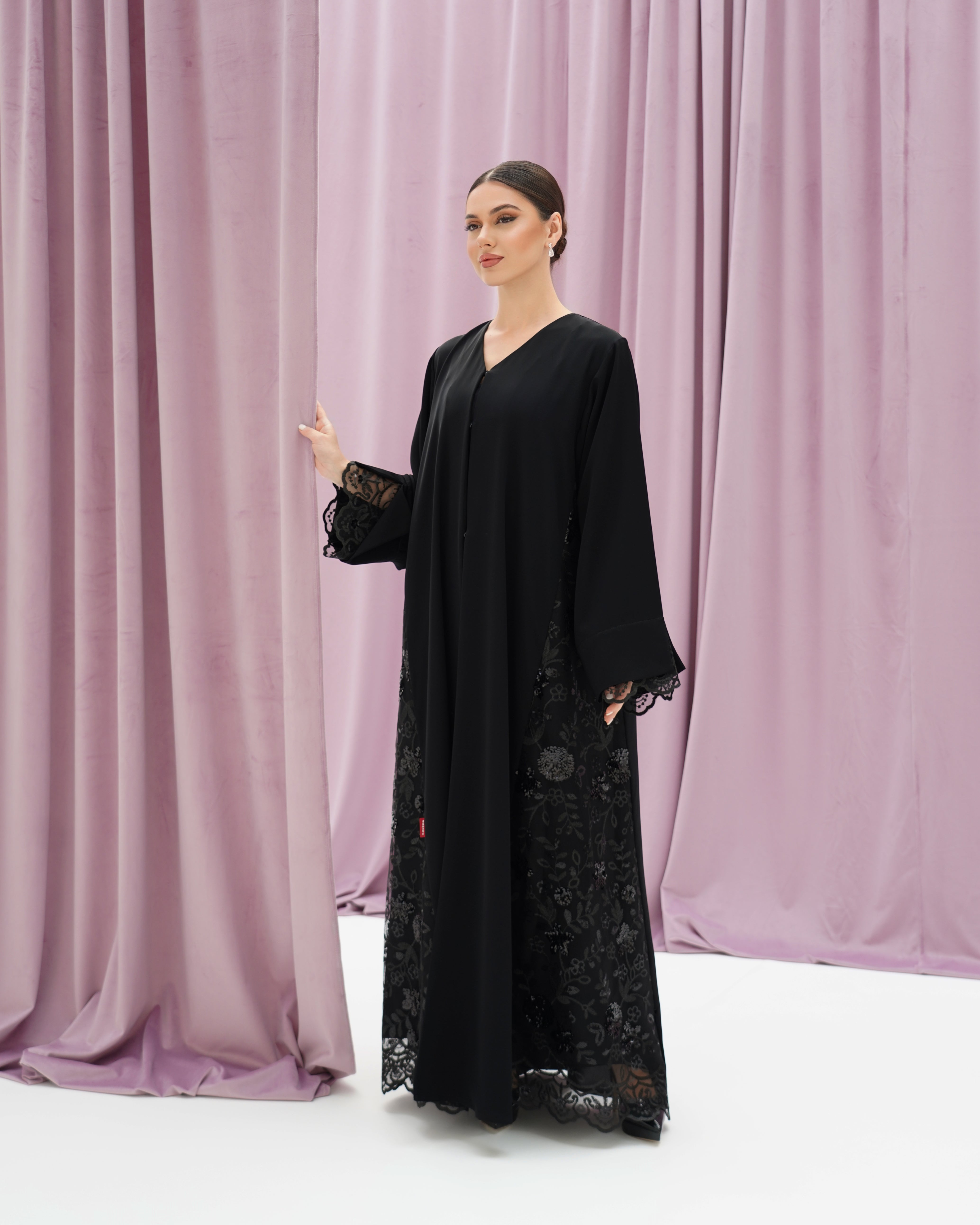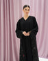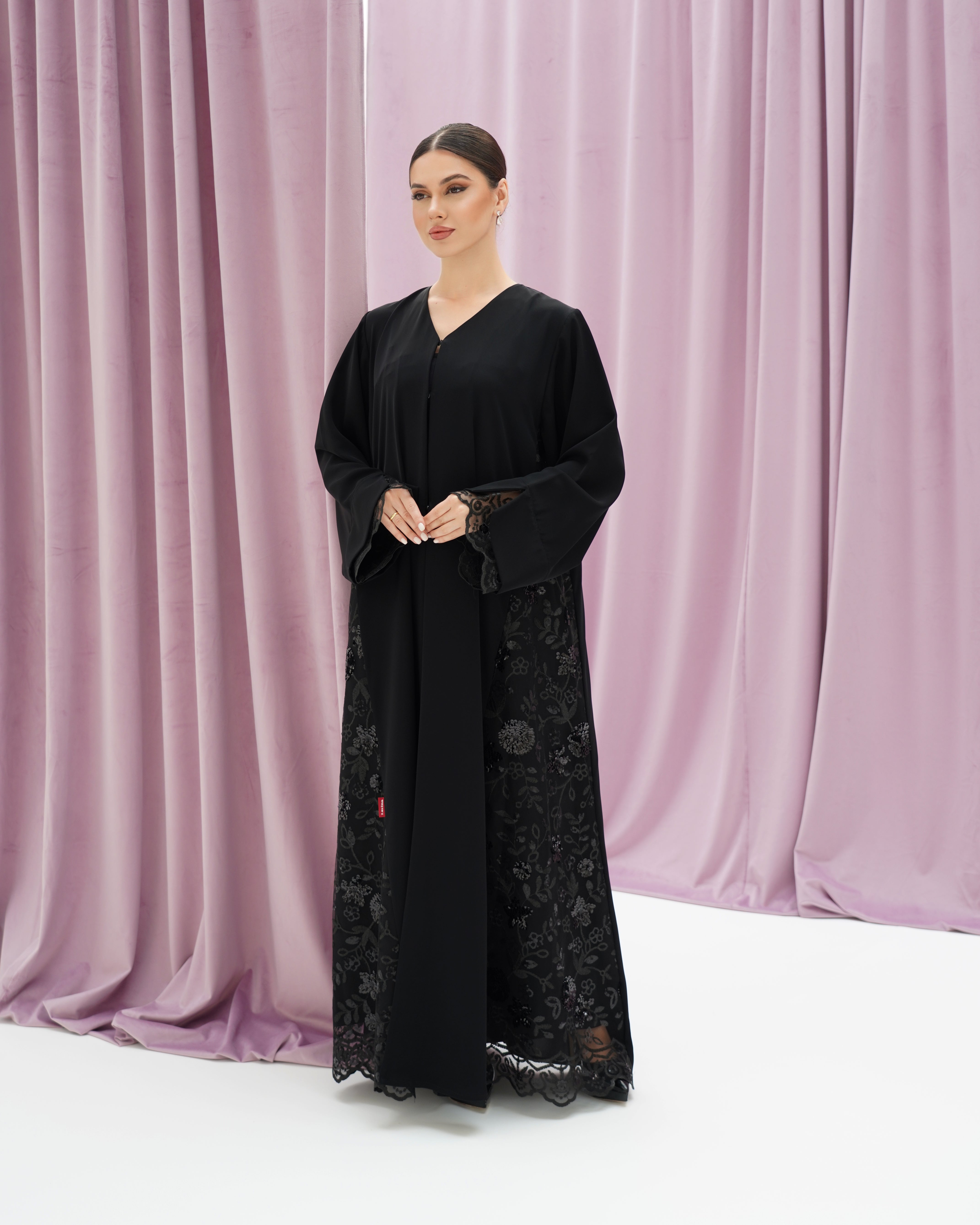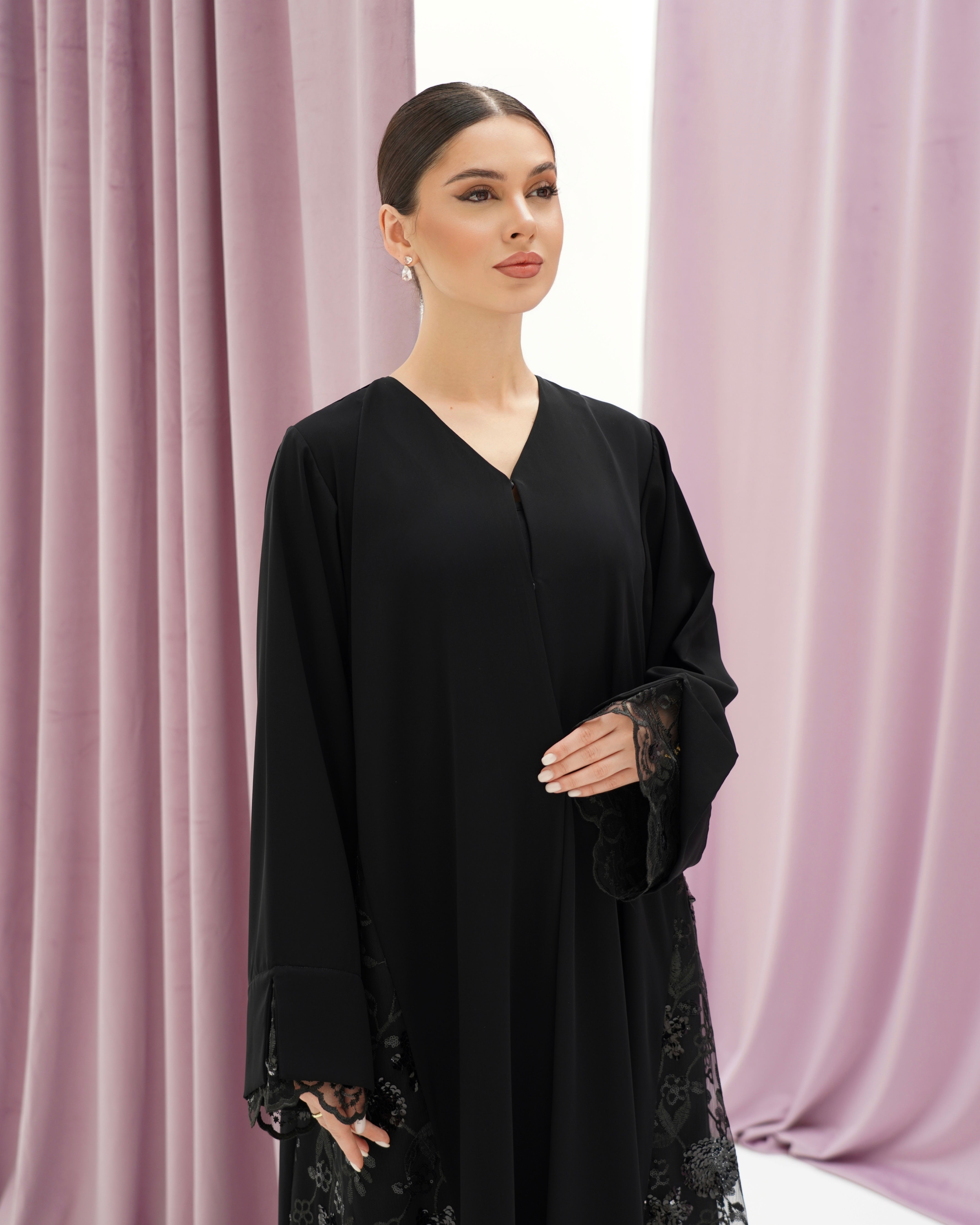 عباية سوداء من قماش كريب، مزينة بدانتيل على الأكمام وأطراف العباية. تصميم بسيط وأنيق