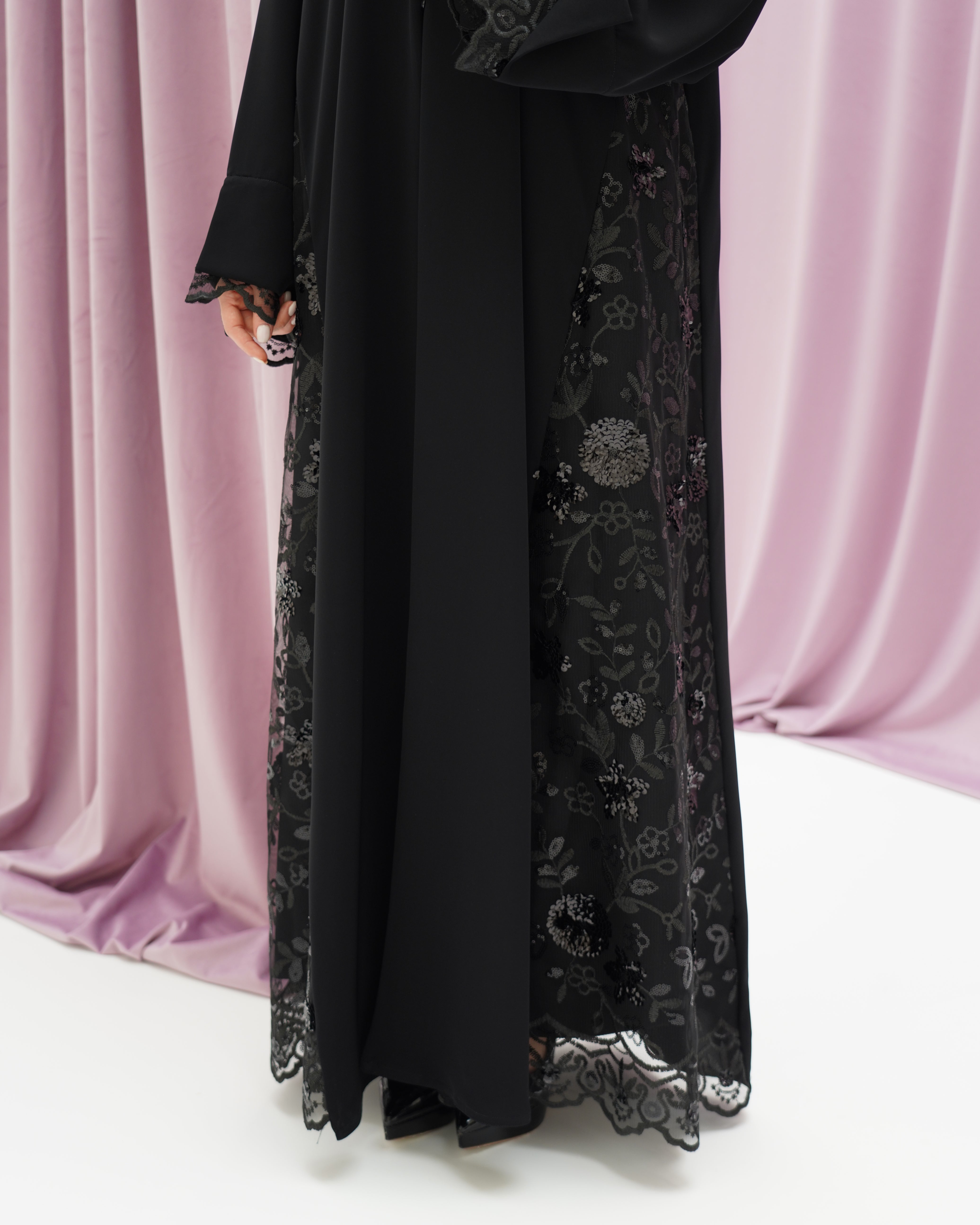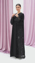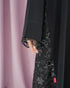 Black abaya made from crepe fabric, featuring lace details on the sleeves and hem. Simple and elegant design.